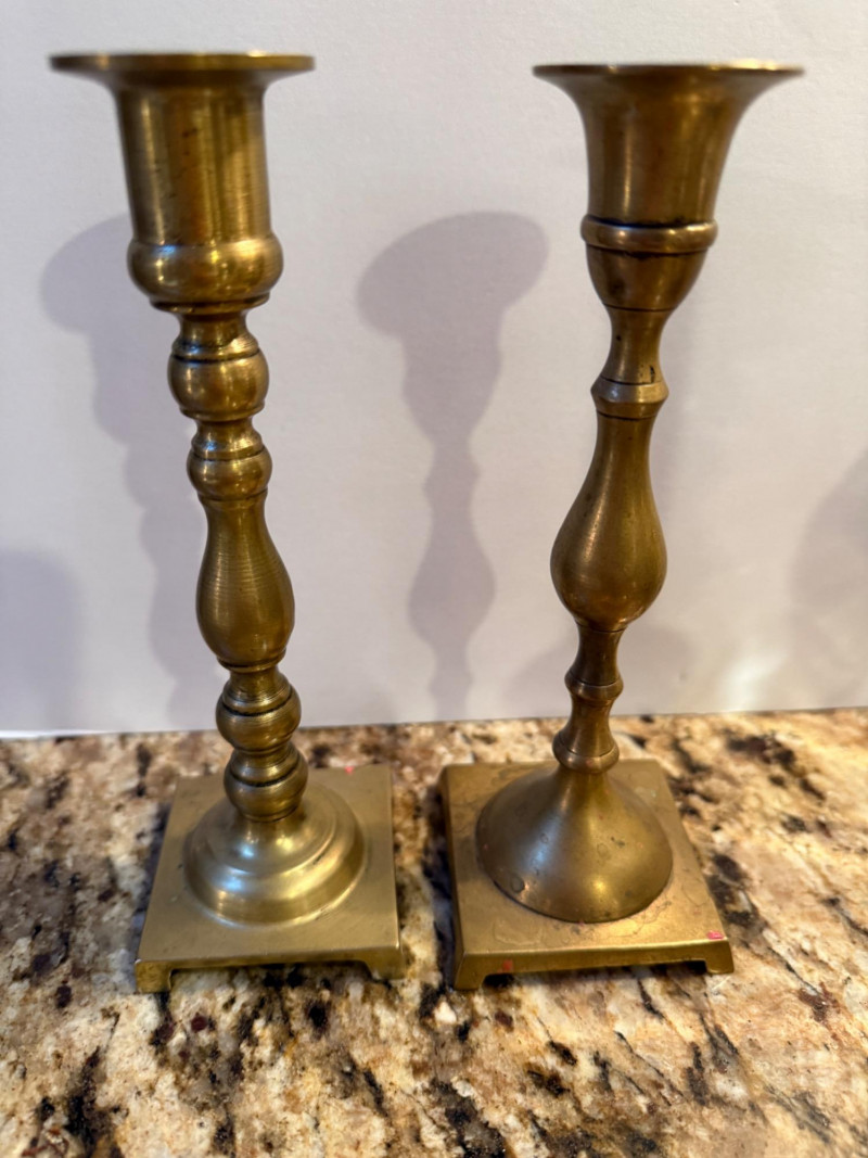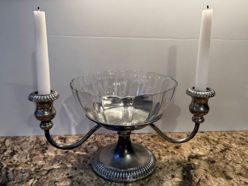 Metal Candelabra With Bowl - Brass Candlesticks double candle labra with 7.25” bowl. Fully measures 13”x6.5” Single glass candlestick 4.5”x8.25” 2.25x2.25”x7” brass 2.5”x2.5”x7” brass