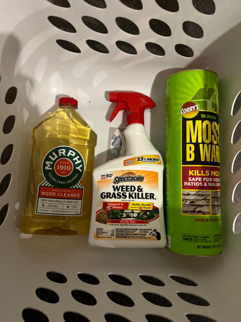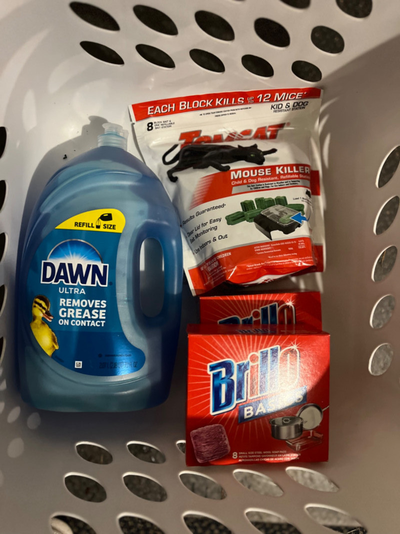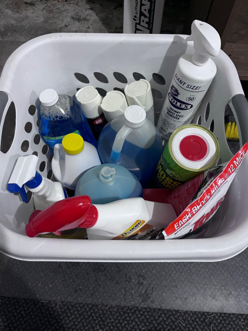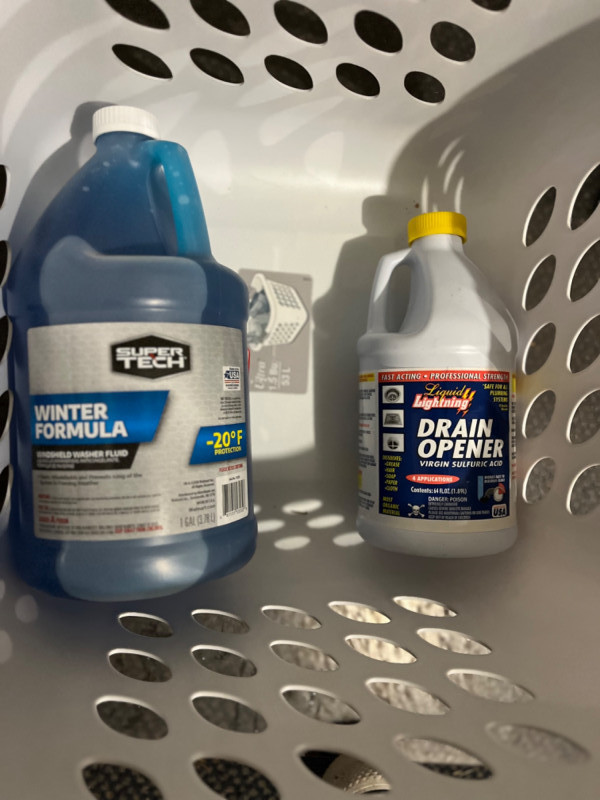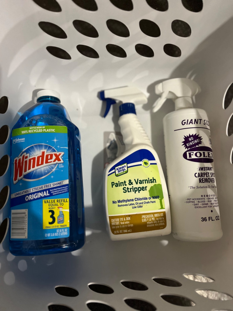 Household Cleaning Supplies - Pest Deterrents - Spray Paint - Solvents in Laundry Basket Unopened and unused. 32 FL OZ of Klean Strip Green Paint & Varnish Stripper TOMCAT Mouse killer: 8 block bait & one refillable bait station 64 FL OZ Liquid Lightning Drain Opener 36 FL OZ Folex Instant Carpet Spot Remover 32 FL OZ Spectracide weed & grass killer 67.6 FL OZ Windex 32 FL OZ Murphy Wood Cleaner 16 Small steel wool Brillo Basics pads 1 Gal. Super Tech Winter Formula windshield wiper fluid 70 FL OZ Dawn dish soap (3) 12 OZ Krylon Fushion all-in-one paint + primer in the color Gloss Dover White(1) 12 OZ Krylon Fushion all-in-one clear sealer in Glow Clear