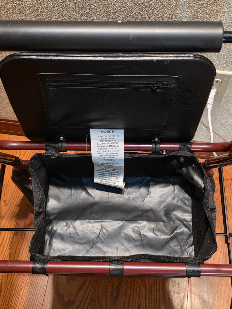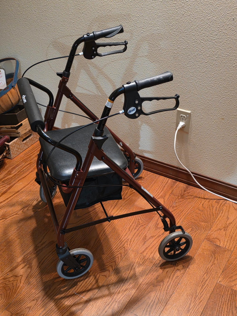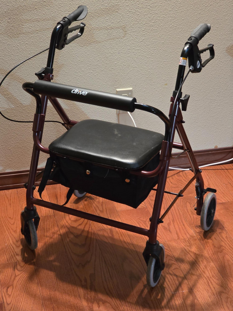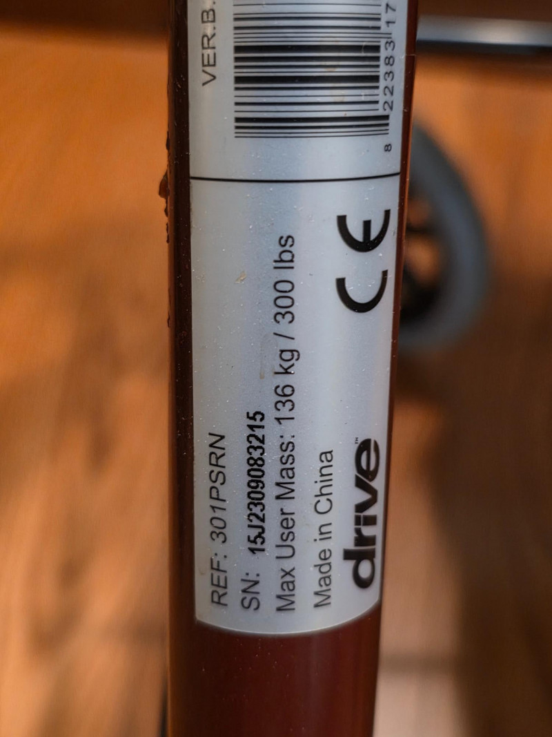 Drive Medical Rollator Rolling Walker With 6" Wheels Drive Model #301PSRN Capacity 300lbs Features a padded seat and a fold-up, removable back support. The ergonomic handles are height-adjustable and designed to relieve hand pressure. The walker has loop locks and serrated brakes to ensure safety. The lightweight aluminum frame is designed for easy folding, travel, and storage. The seat opens to reveal a zippered storage pouch for personal items Tested - Works!