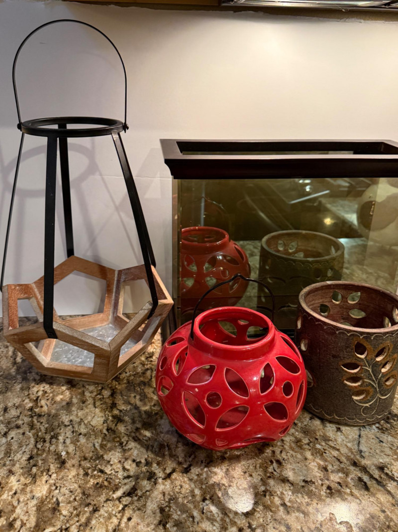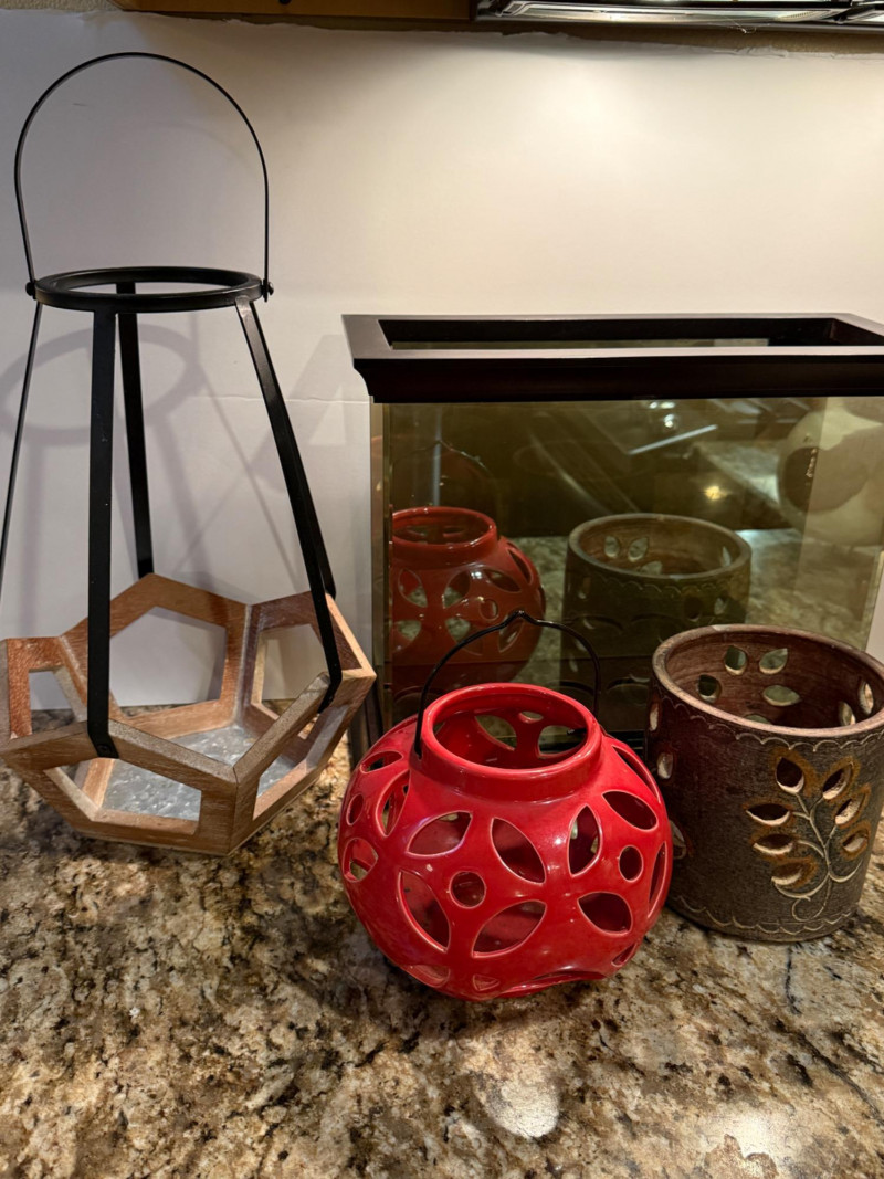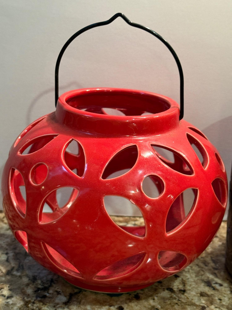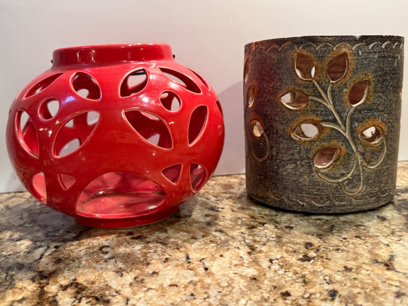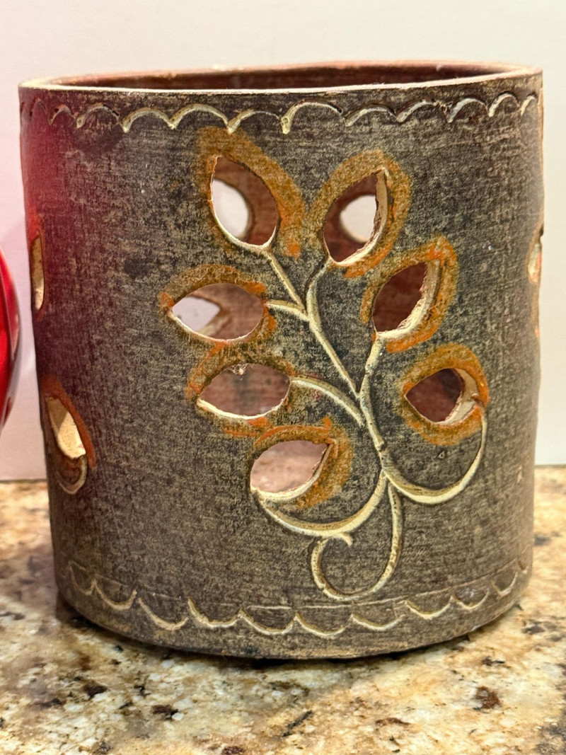 (4) Unique Candle Holders Pottery leaf design 5”x5.25” Ceramic red lantern tea light holder. 7”x5.5”
