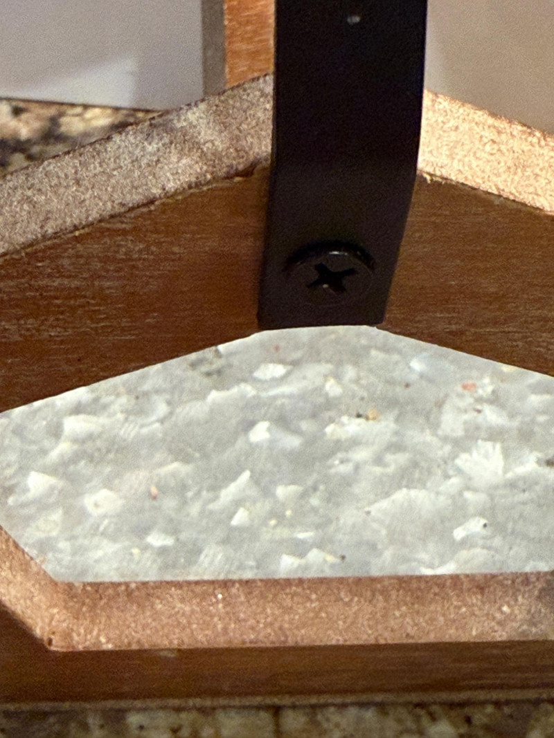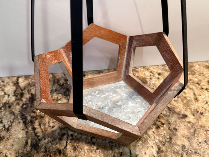Geometric lantern wood and metal pillar holder 9.25”x17” to top of handle.