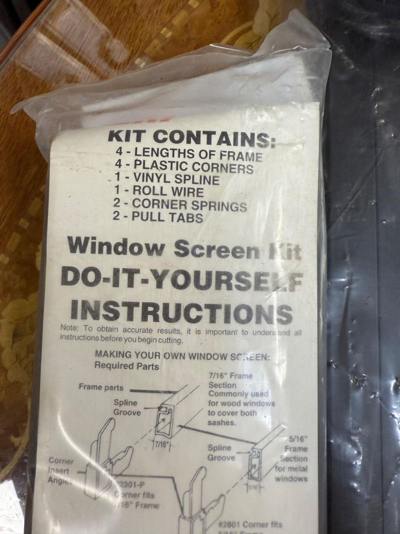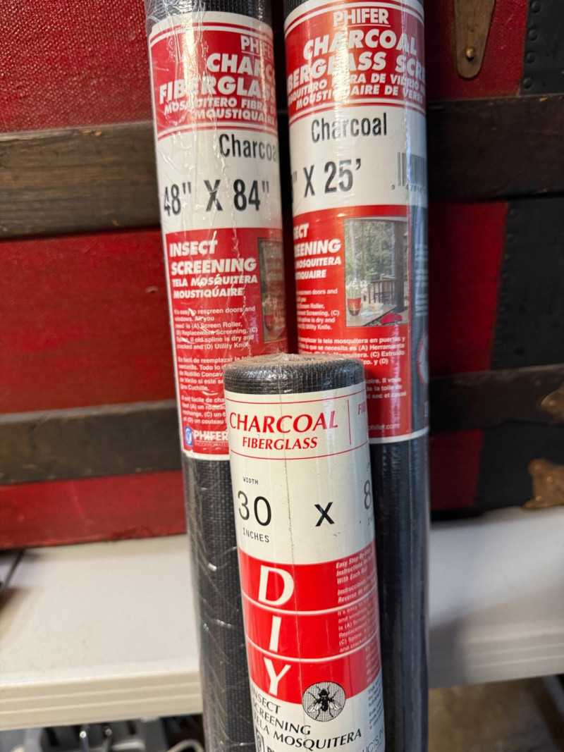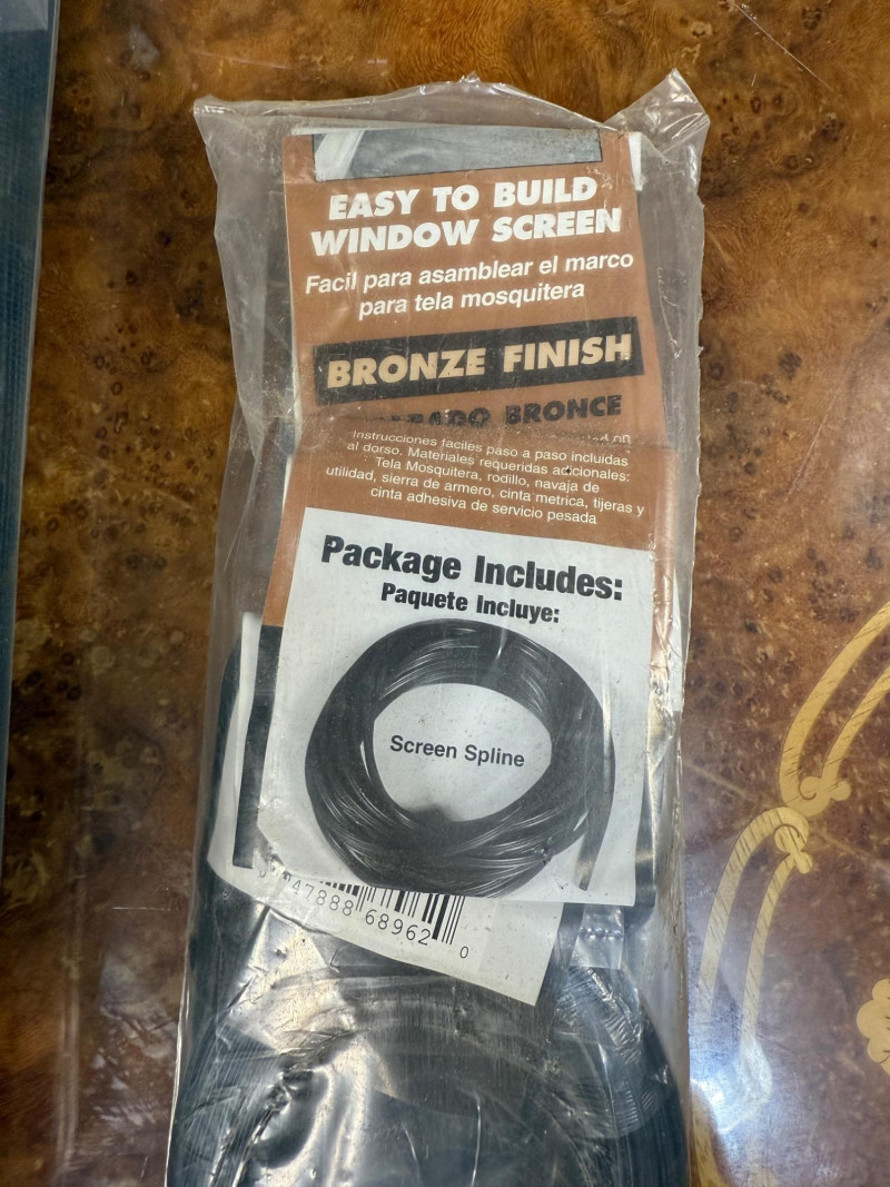 NIP Rolled Screen and Spline - Build Your Own Screens Charcoal 48”x25’ Charcoal 48”x 84” Charcoal 30”x84” Bronze finish metal frame and spline. Full window screen kit