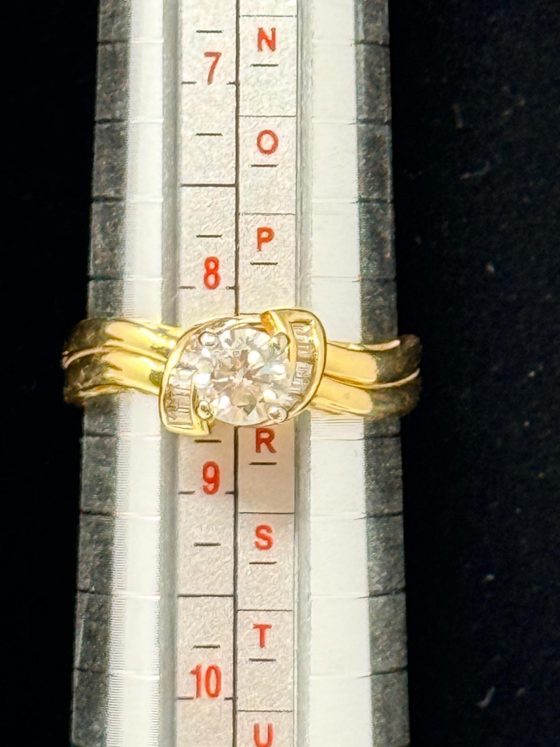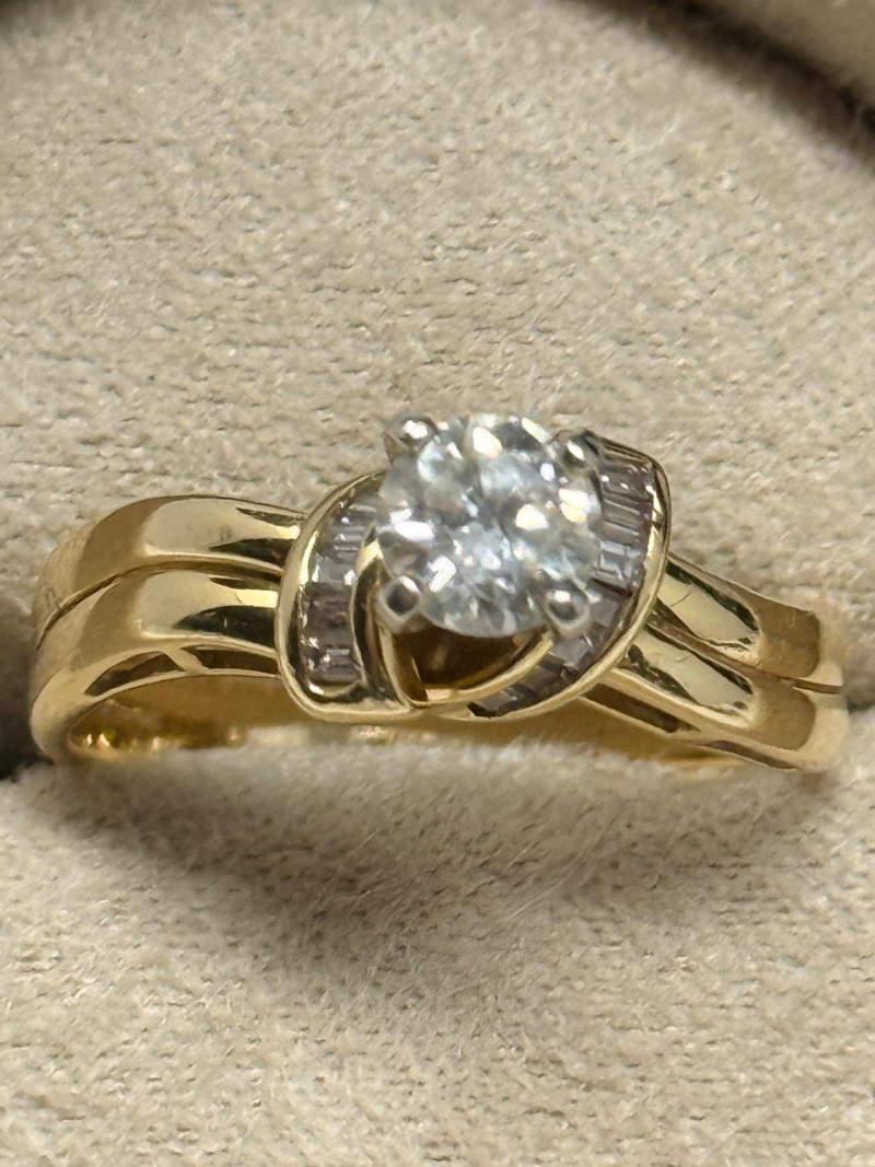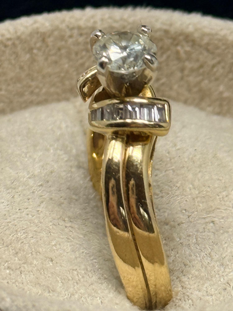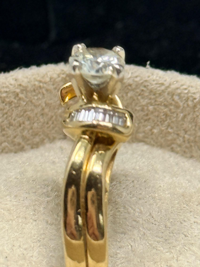 This beautiful wedding set holds .57 karat round brilliant cut center diamond with baguette diamonds on each side. The bands are soldered with a little twist. See pics. Size 8.5