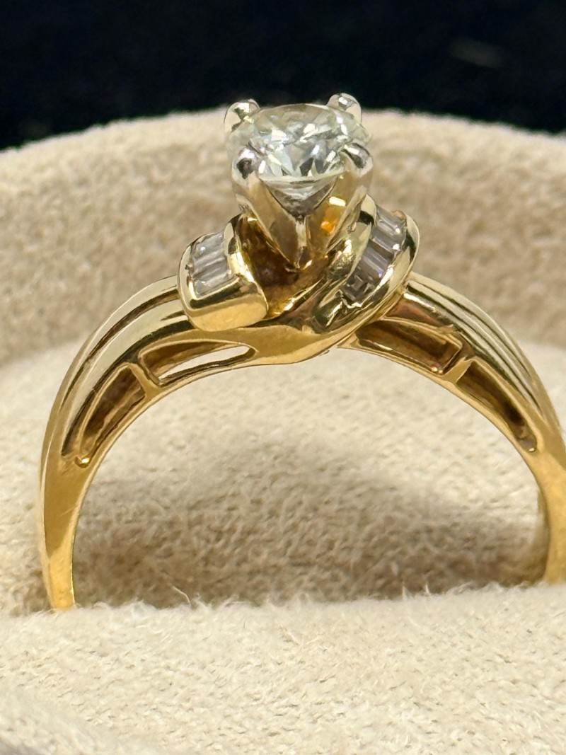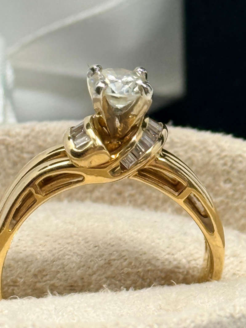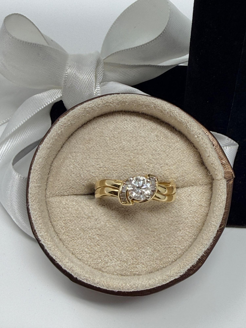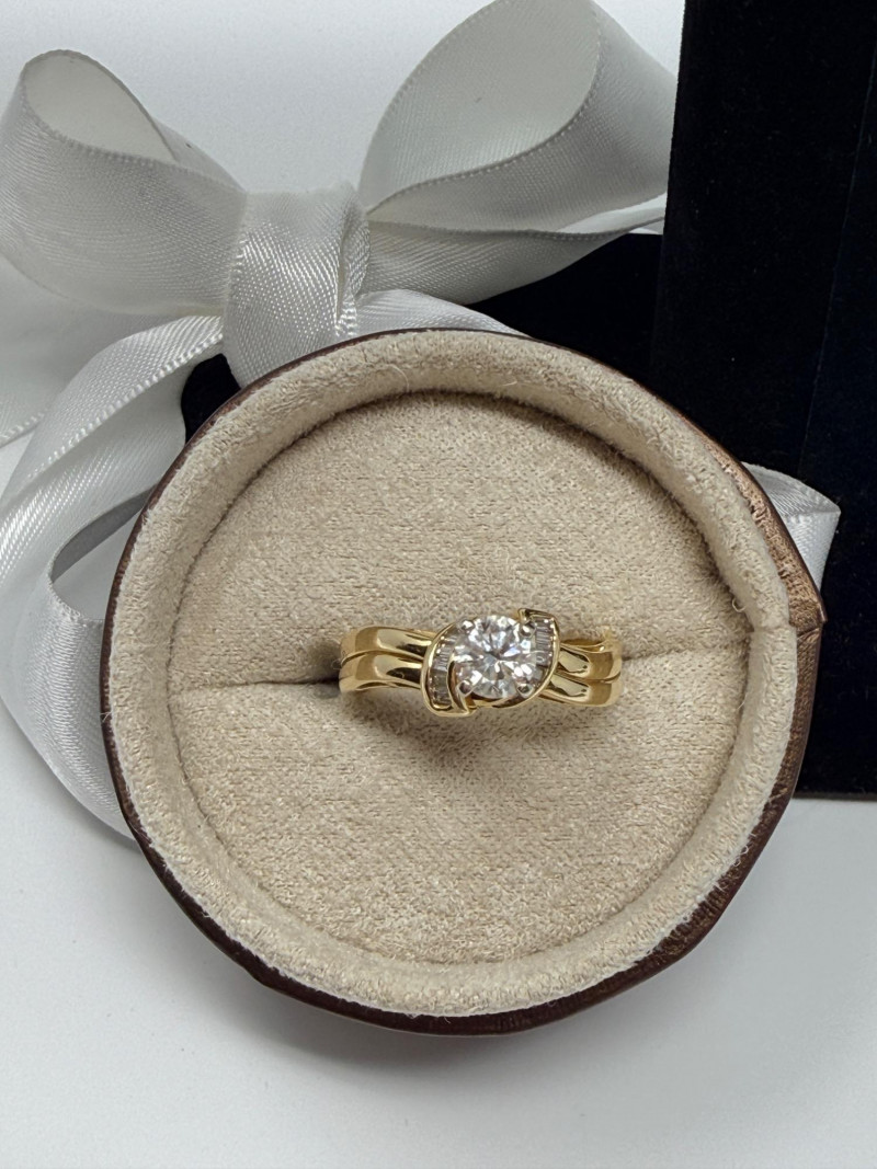 This beautiful wedding set holds .57 karat round brilliant cut center diamond with baguette diamonds on each side. The bands are soldered with a little twist. See pics. Size 8.5
