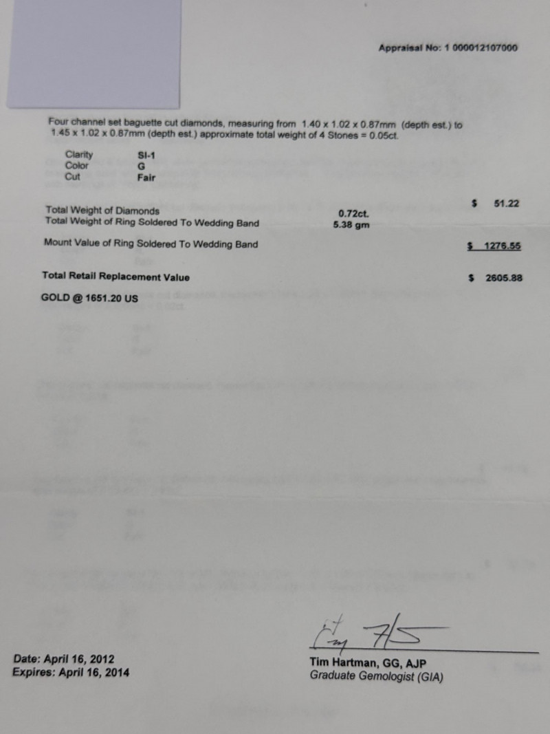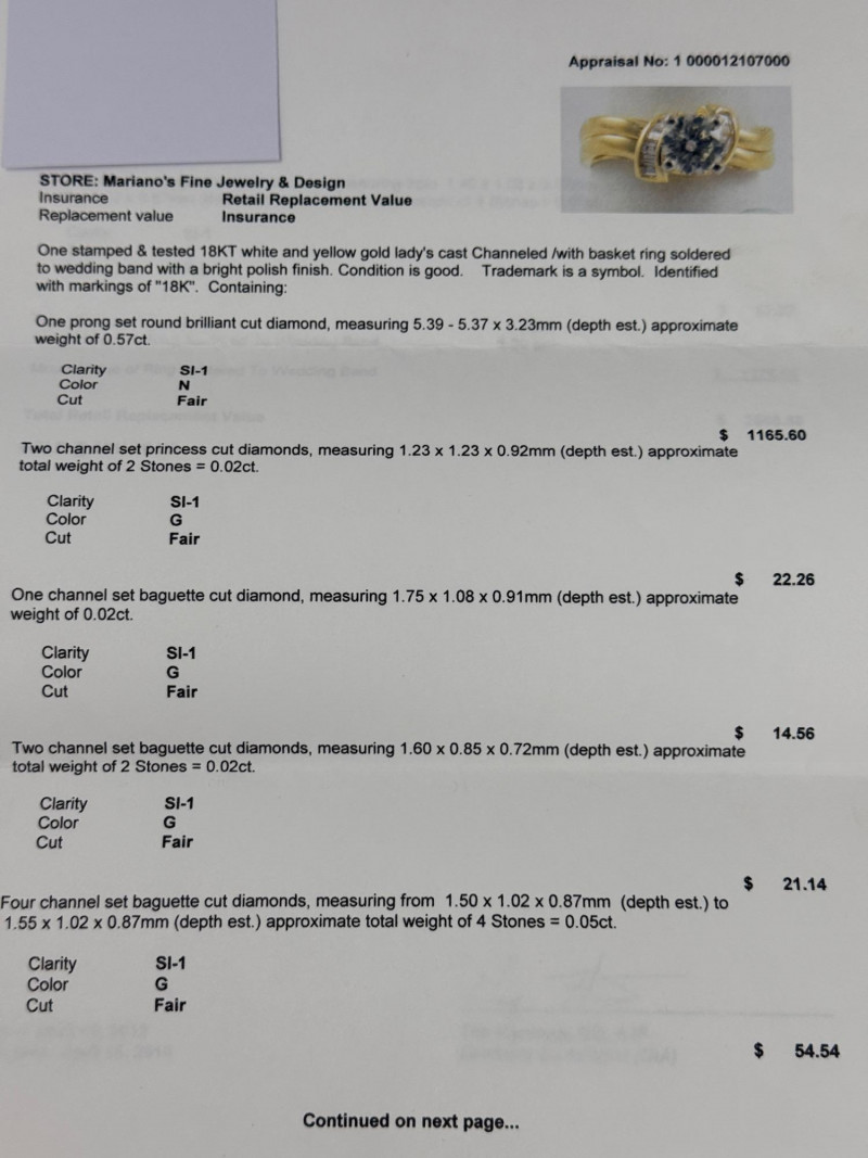 *18K Yellow Gold And Diamond Wedding Set 2013 appraisal is included to show the ring details.
