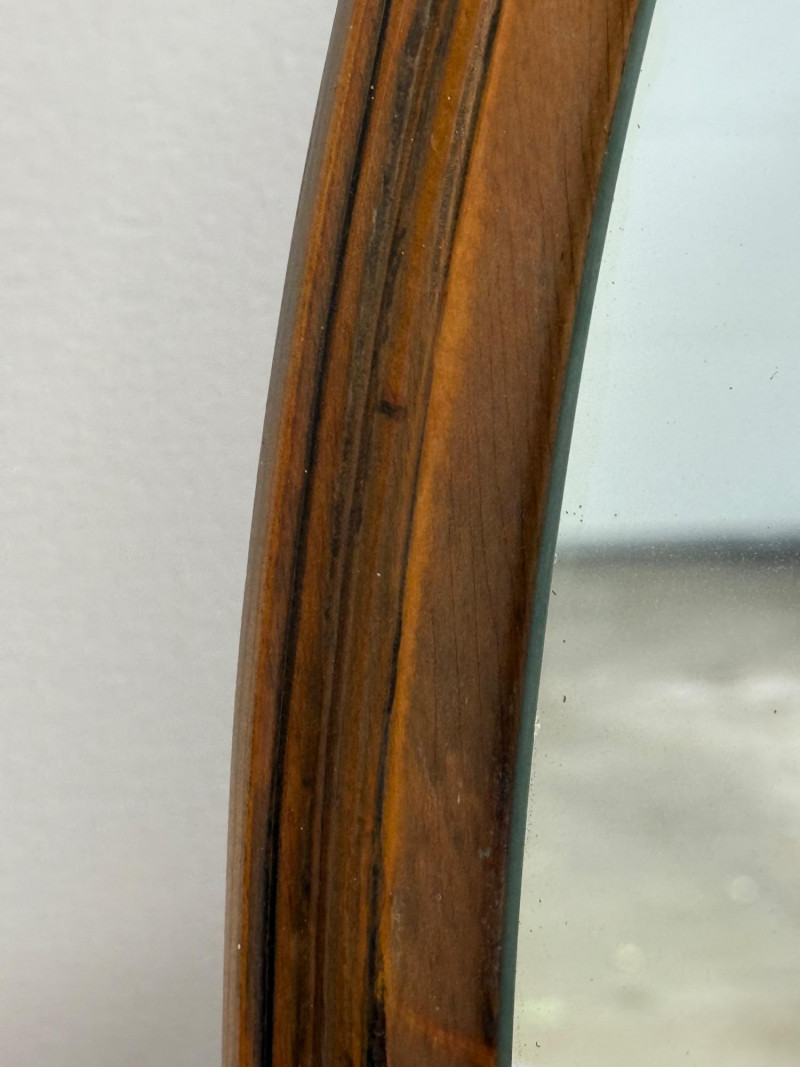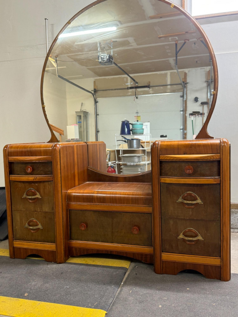 Vintage Art Deco Waterfall Vanity and Mirror Typically dates to the 1930s and 1940s.Materials: Often constructed with a mix of woods and finished with attractive veneers like walnut, maple, or mahogany. The hardware often features materials like Bakelite. 51”x18.5”x28” vanity only. Mirror is 48” round with 4” wood base that sits on the back of the vanity seat.