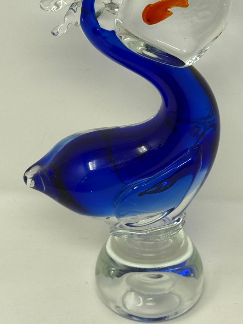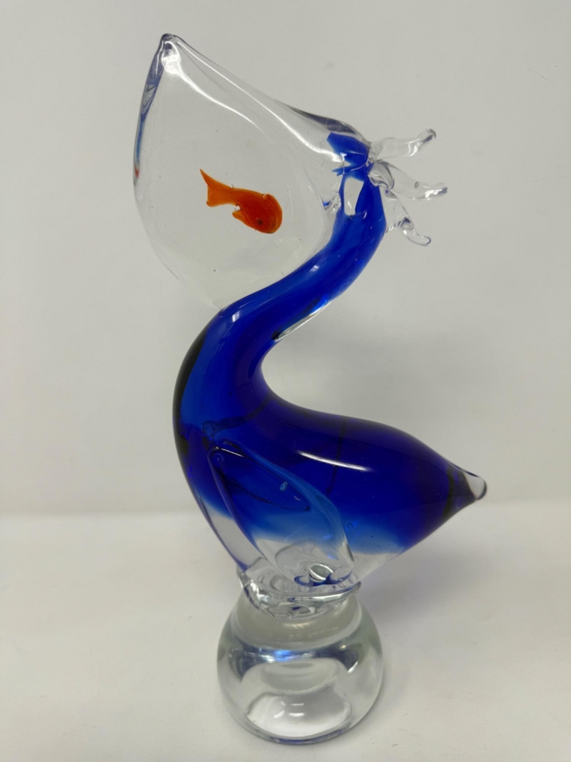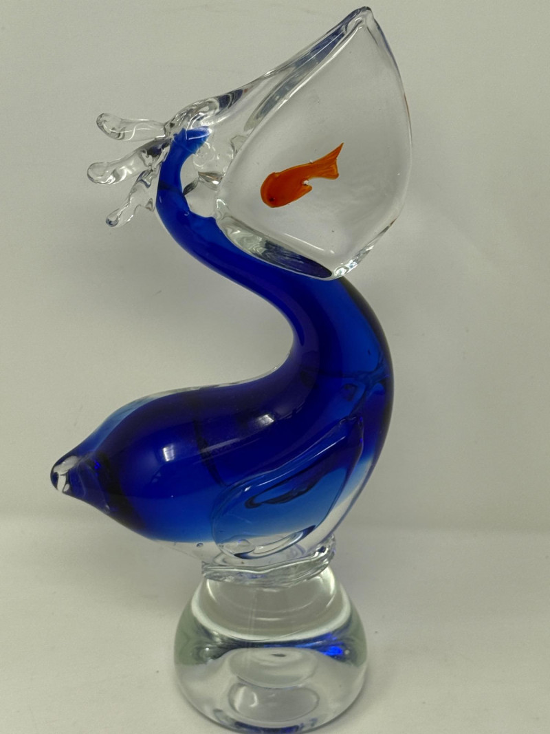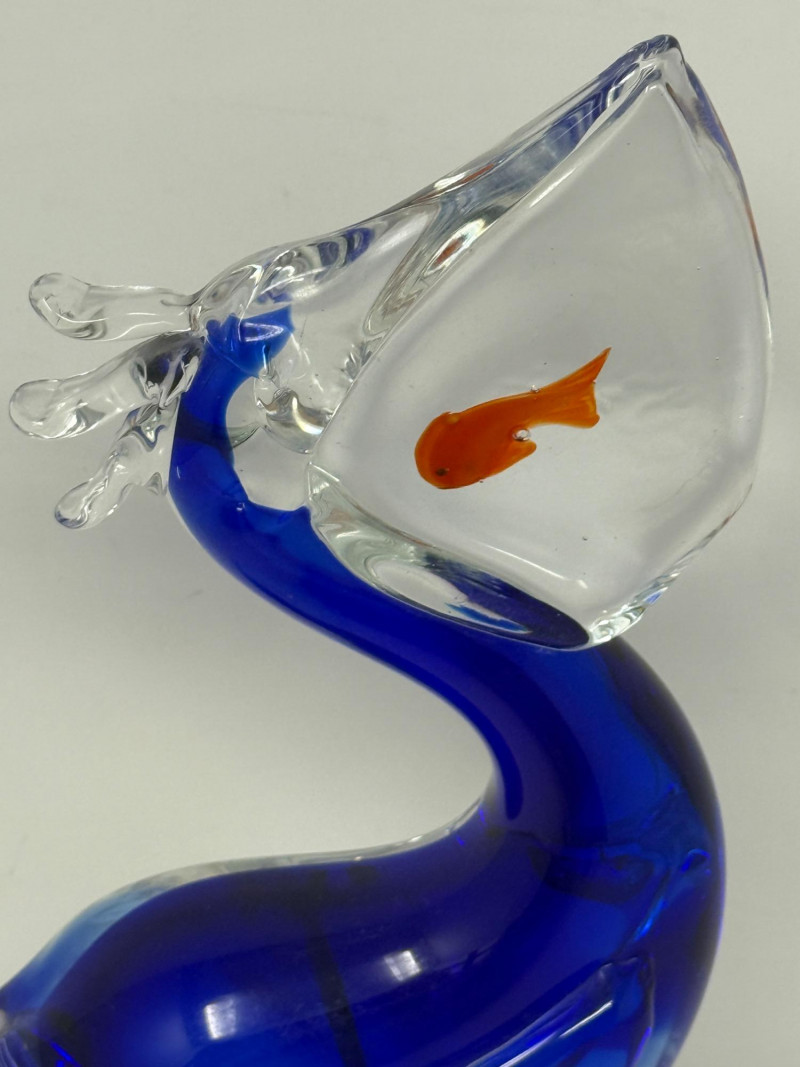 This item is a hand-blown glass pelican sculpture with a fish inside its mouth, commonly created in the Murano art glass style. These pieces are often made with a clear glass body featuring a cobalt blue neck and base, and a small, orange goldfish figurine inside the pelican's bill or gullet. The layered glass technique, known as sommerso, is typically used to create depth and encase the fish within the clear glass. Measures 5.5”x12”x 3.25”