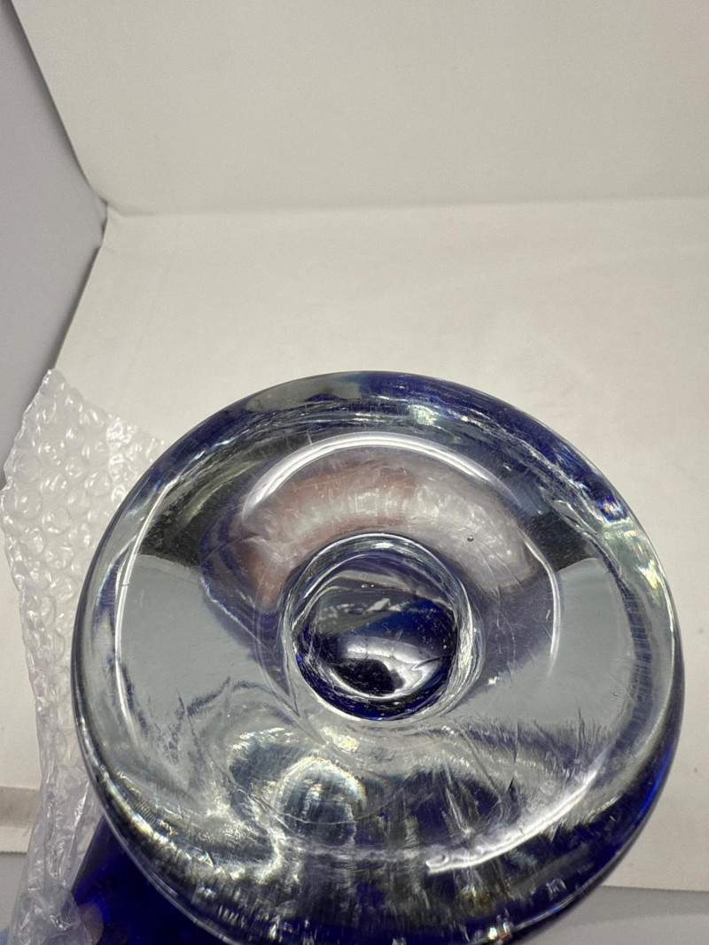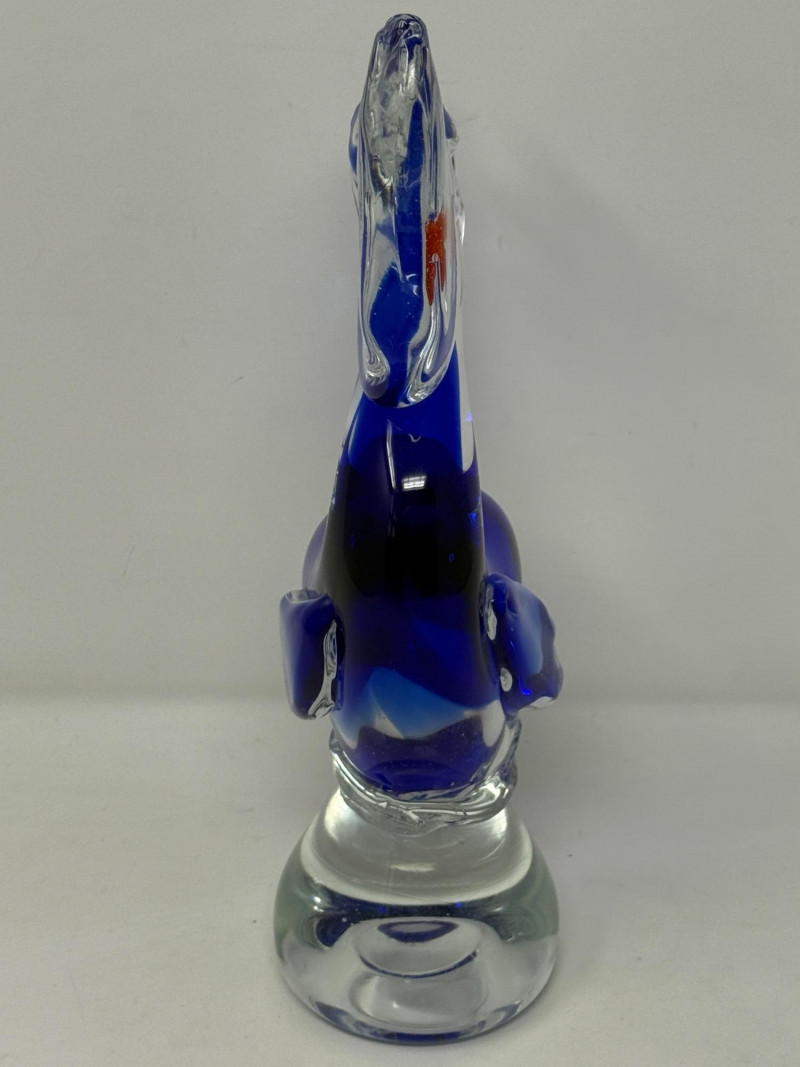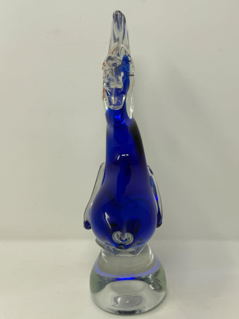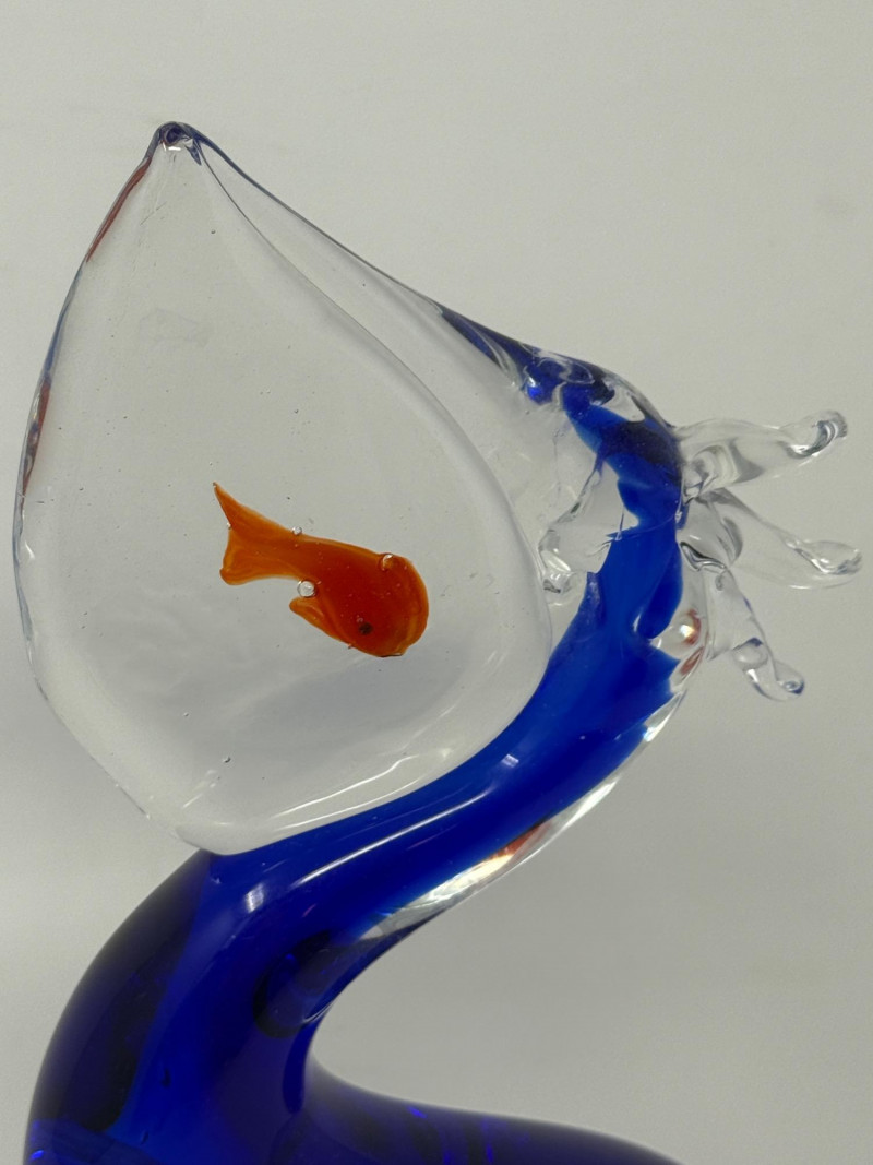 This item is a hand-blown glass pelican sculpture with a fish inside its mouth, commonly created in the Murano art glass style. These pieces are often made with a clear glass body featuring a cobalt blue neck and base, and a small, orange goldfish figurine inside the pelican's bill or gullet. The layered glass technique, known as sommerso, is typically used to create depth and encase the fish within the clear glass. Measures 5.5”x12”x 3.25”
