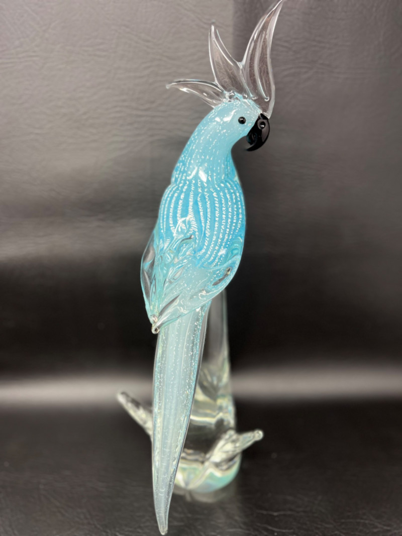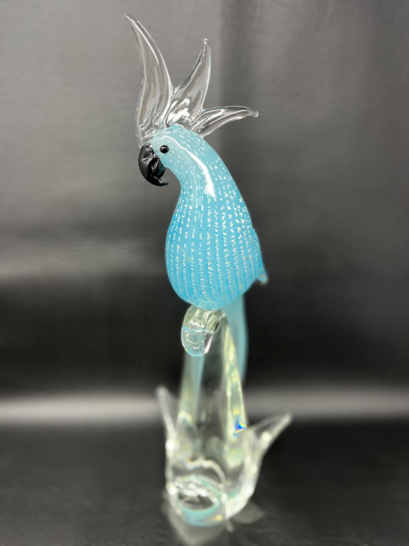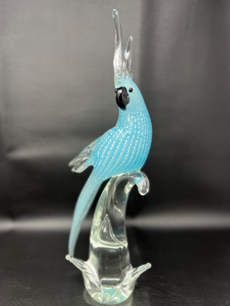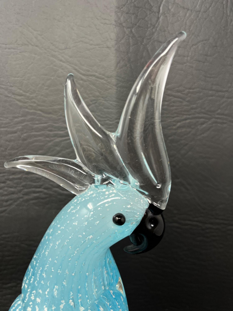 *Murano Glass Sculpture Striking light blue speckled cockatoo art glass sculpture by Murano Glass. Measures 6"W x 5"D x 16H.