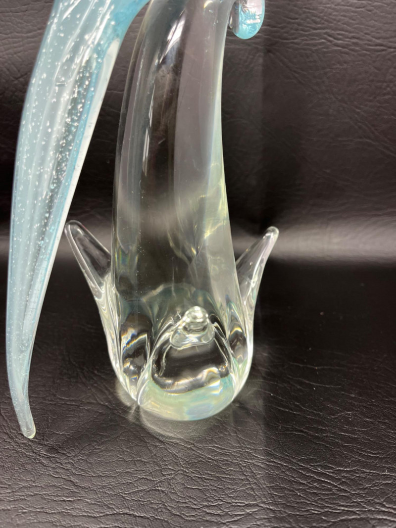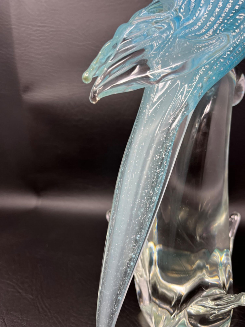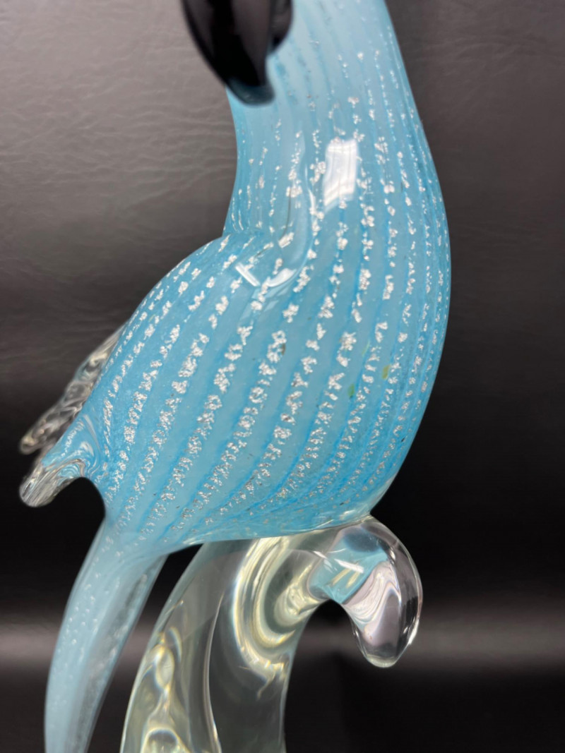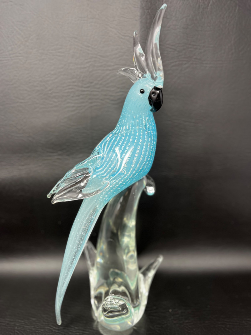 *Murano Glass Sculpture Striking light blue speckled cockatoo art glass sculpture by Murano Glass. Measures 6"W x 5"D x 16H.