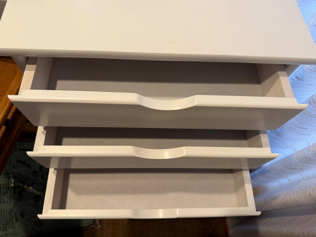 White painted wood with 8 drawers and caster wheels. 20”x14”x40.5” Hanging hardware attached to back. Surface marks on the back.