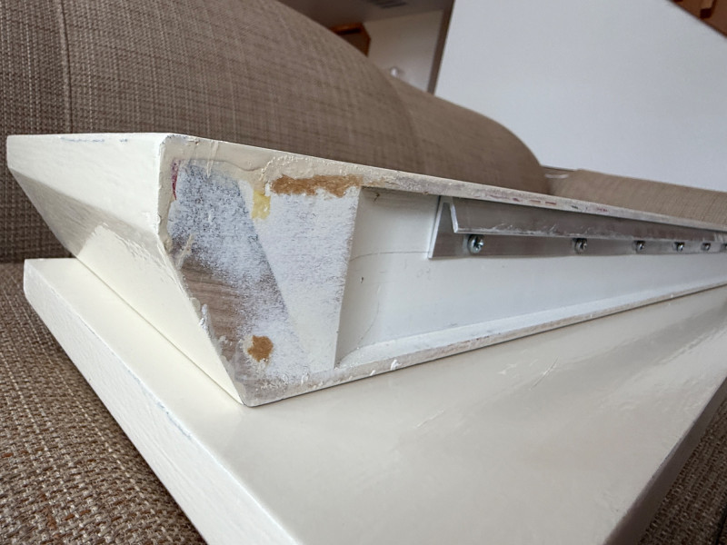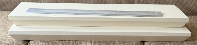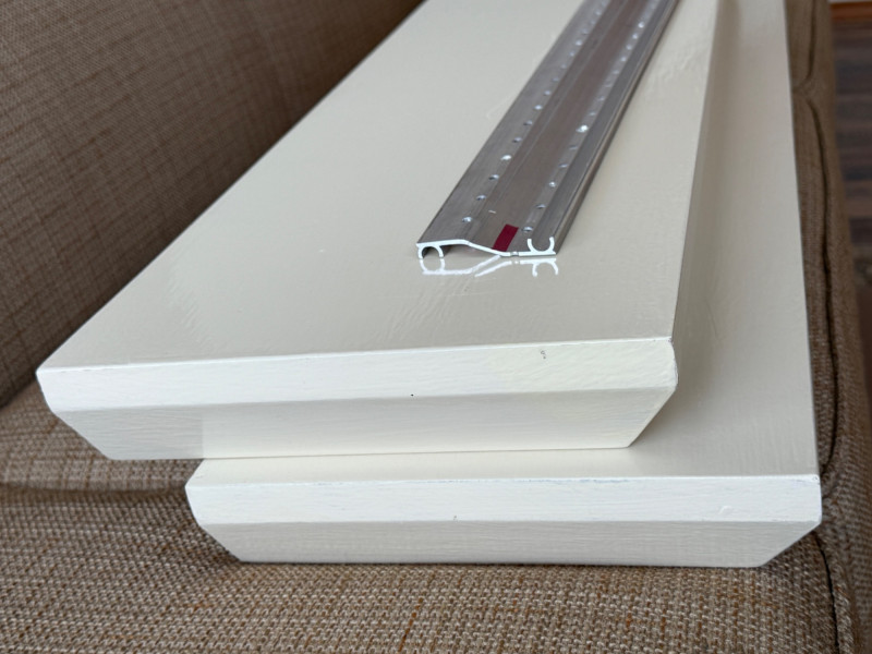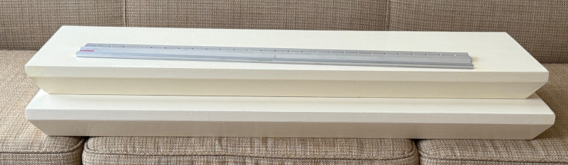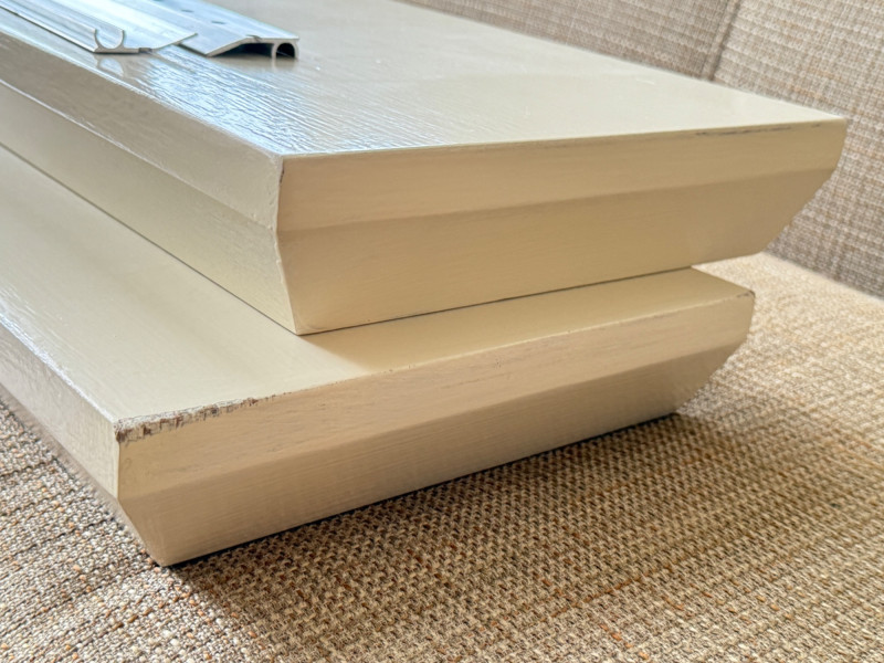 (2) Pottery Barn Painted Wood Floating Shelves with mounting brackets. 36”x10”x2.5” painted cream color gloss.
