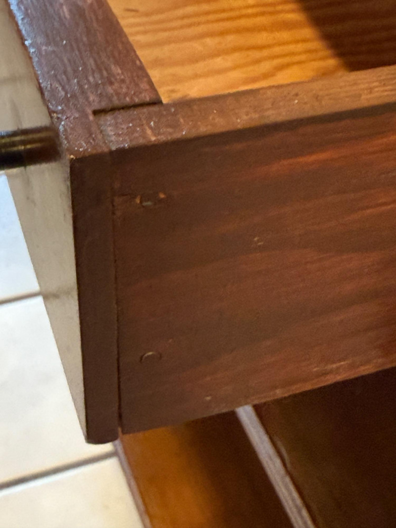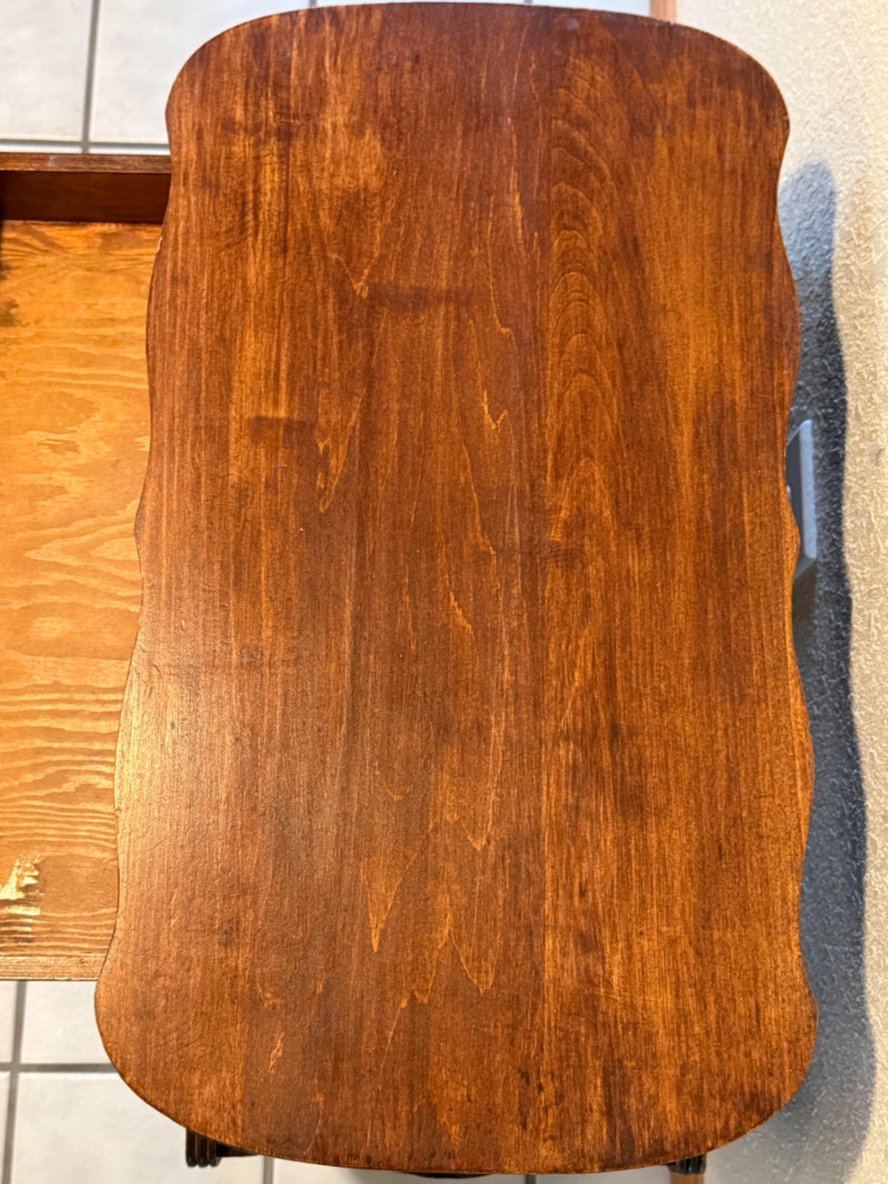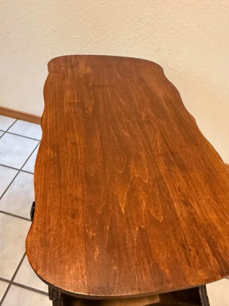 Curved top, dark finish, and the style of the hardware, suggest it is an antique from the early to mid-20th century, drawing inspiration from traditional styles like Victorian or Federal.