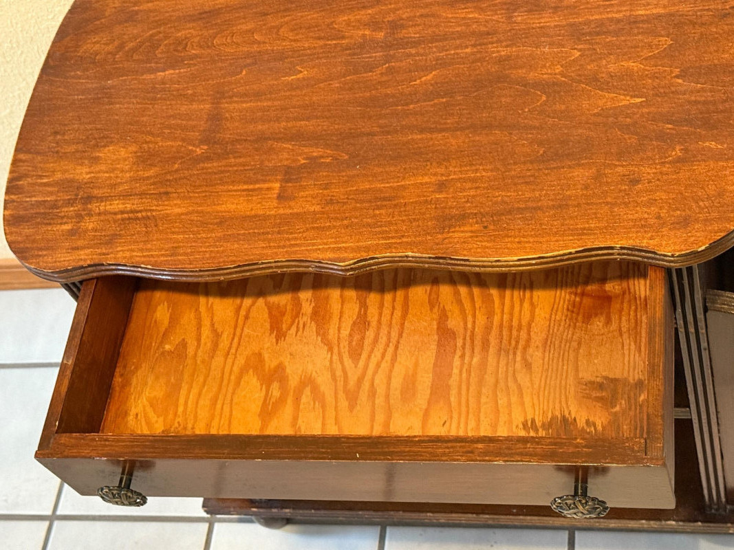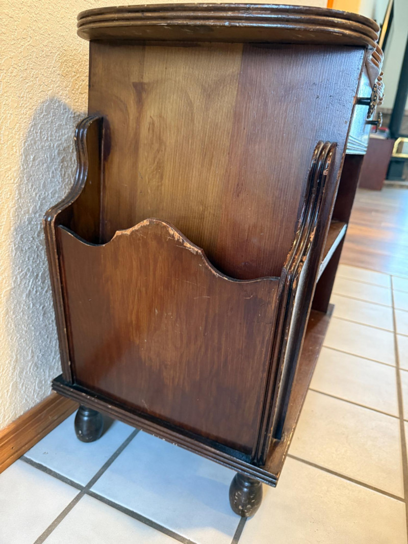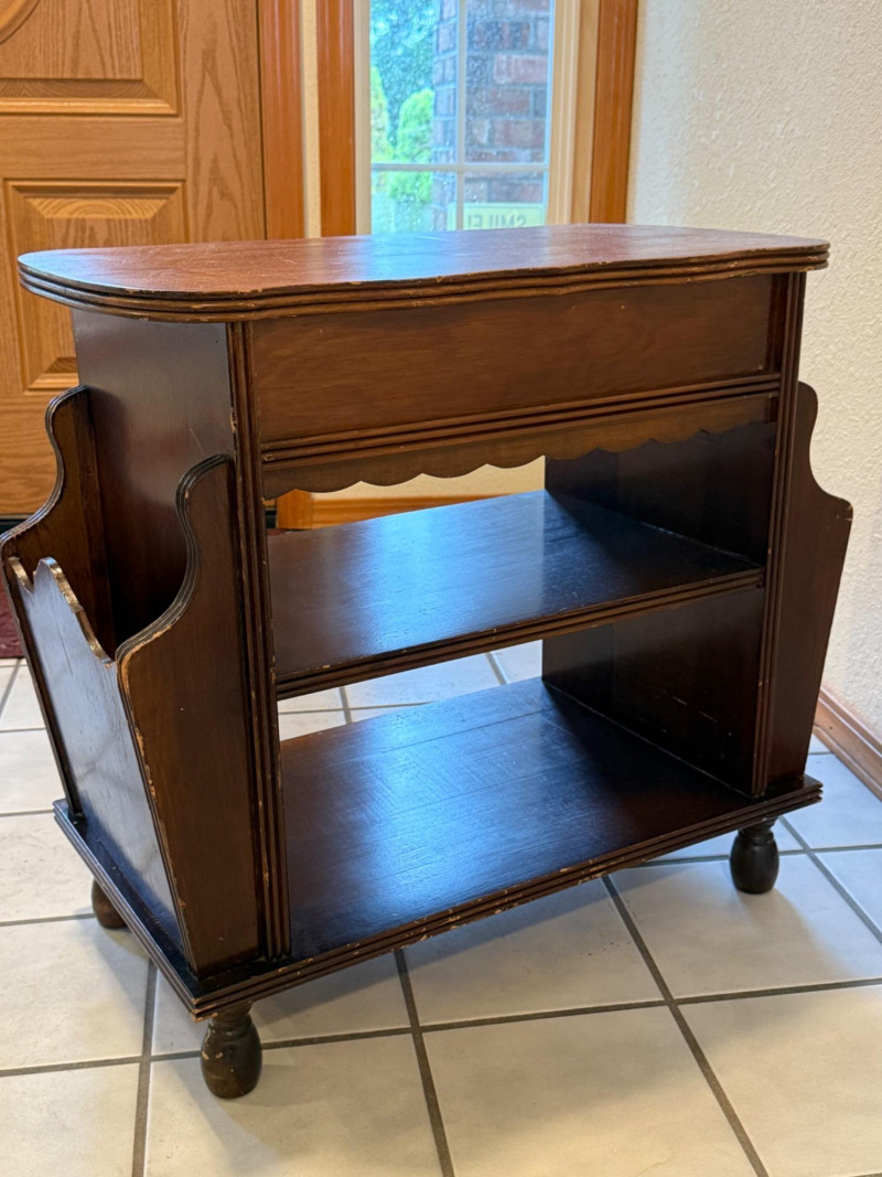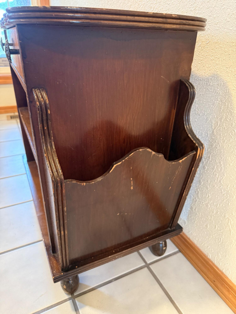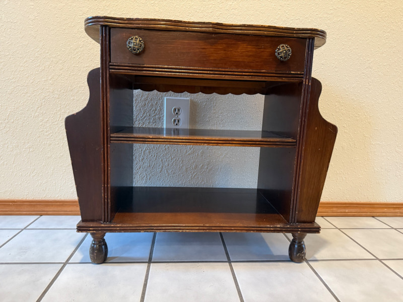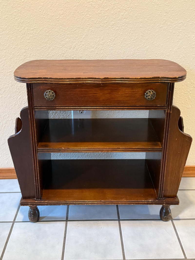 Vintage Canterbury Or Magazine Table Vintage wooden magazine rack side table with a drawer and shelves. It is often referred to as a "Canterbury" or a "magazine table," made from oak. The table features two open shelves for storage and a single top drawer with ornate knobs. The sides are designed as racks or open compartments specifically for holding magazines, newspapers, or books. Surface marring and wear appropriate for its age.
