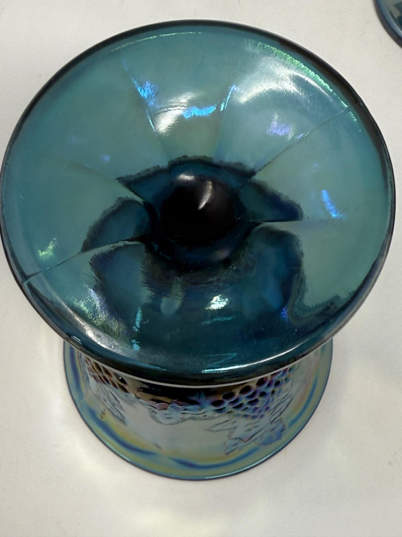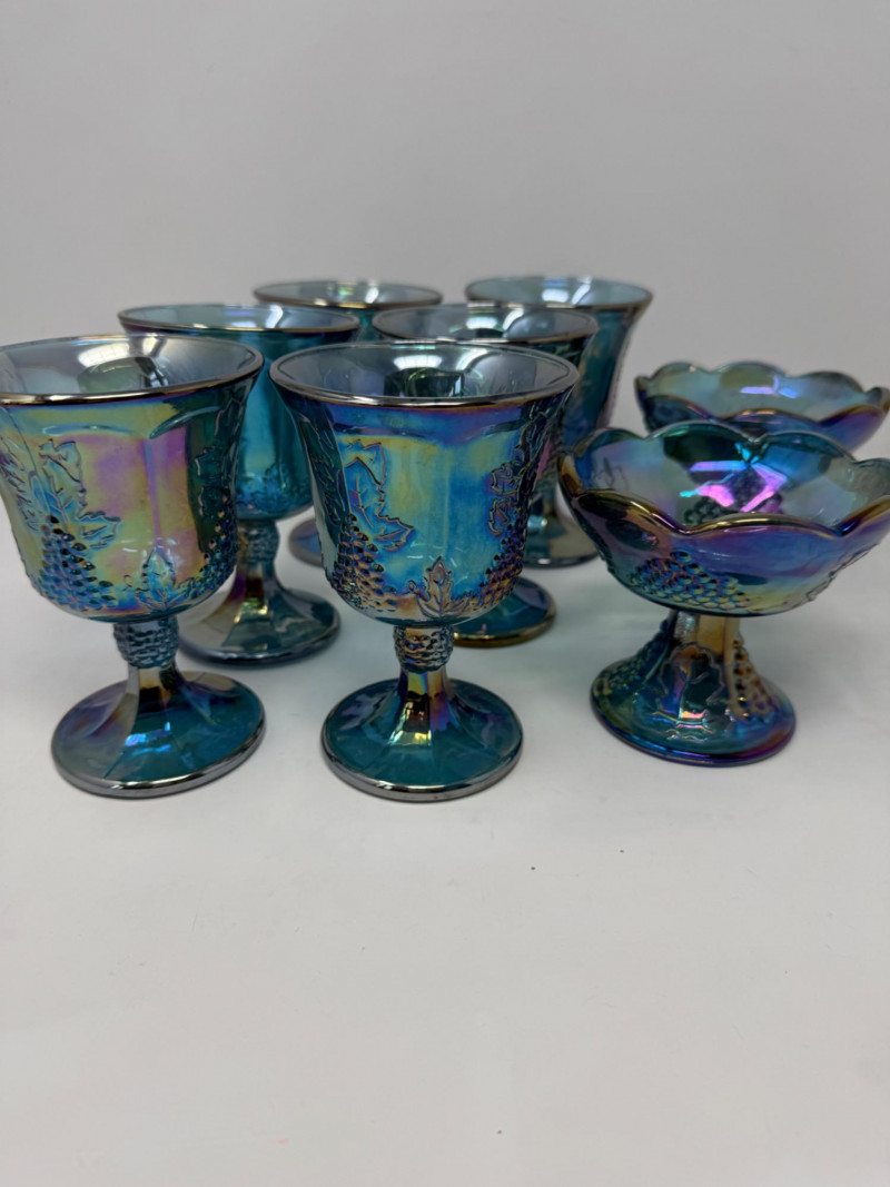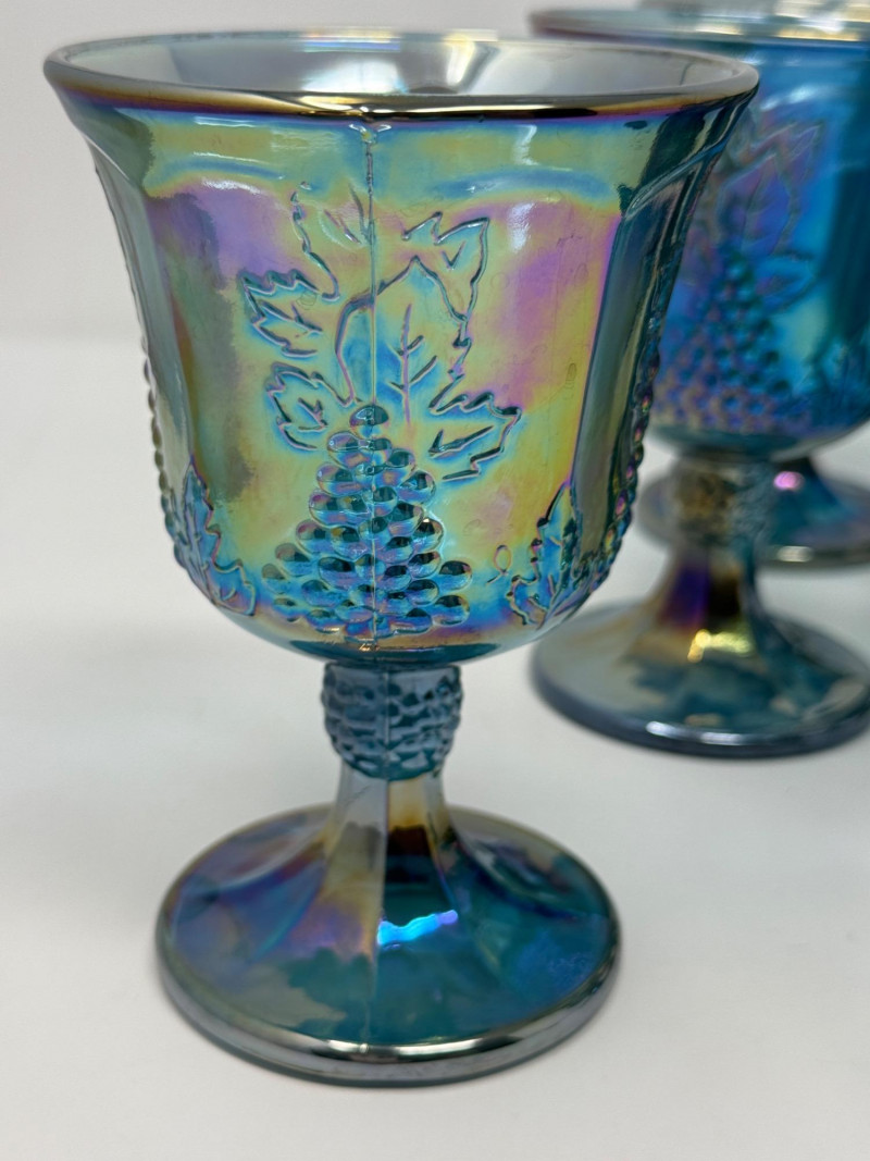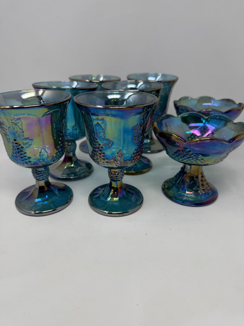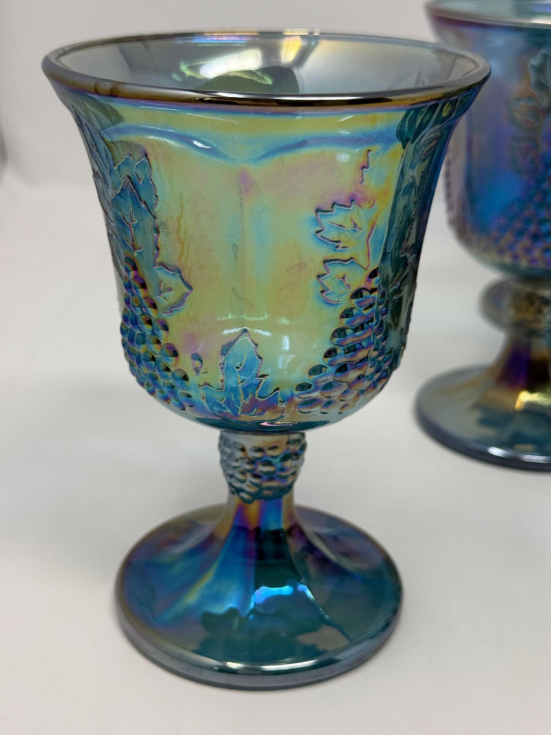 MCM Indiana Glass Harvest Grape Blue Carnival chalice set of 6, with 2 taper candle holders. )Harvest Grape, Iridescent Blue Carnival (shimmers with hues of blue, purple, and green) Circa 1960s-1980s (6) 3.5”x5.25” stemware (2) 4.5”x4” Taper candle holders