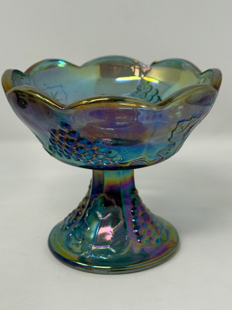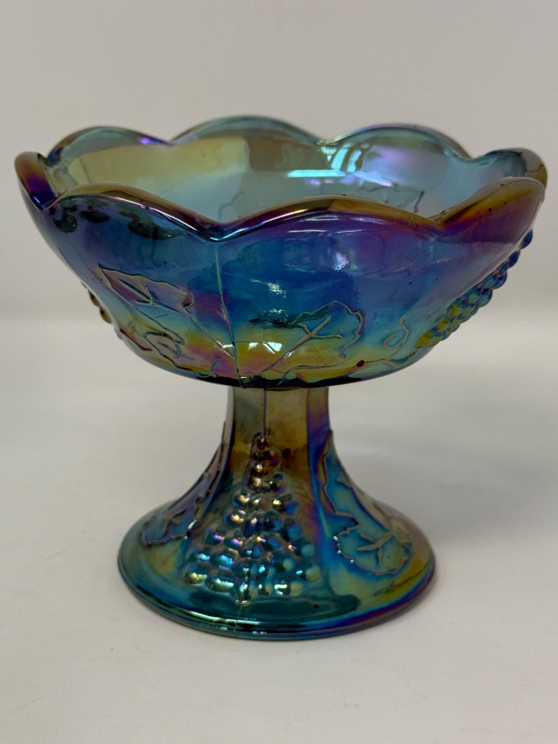 These iridescent chalices feature a detailed embossed grape and leaf pattern and were primarily manufactured by the Indiana Glass Company between the 1960s and 1980s as part of their popular revival carnival glass line. Indiana Glass Company (sometimes sold under the Colony subdivision