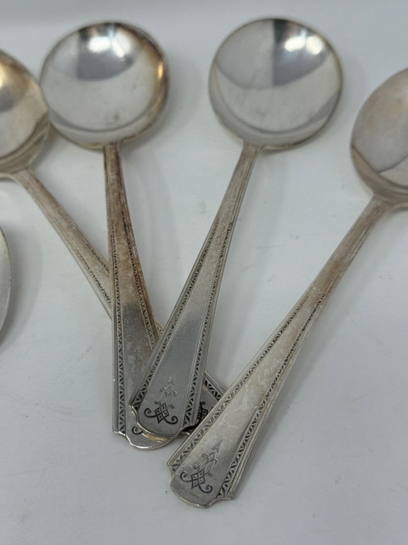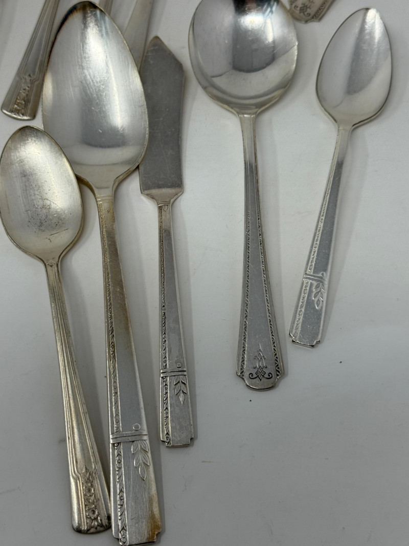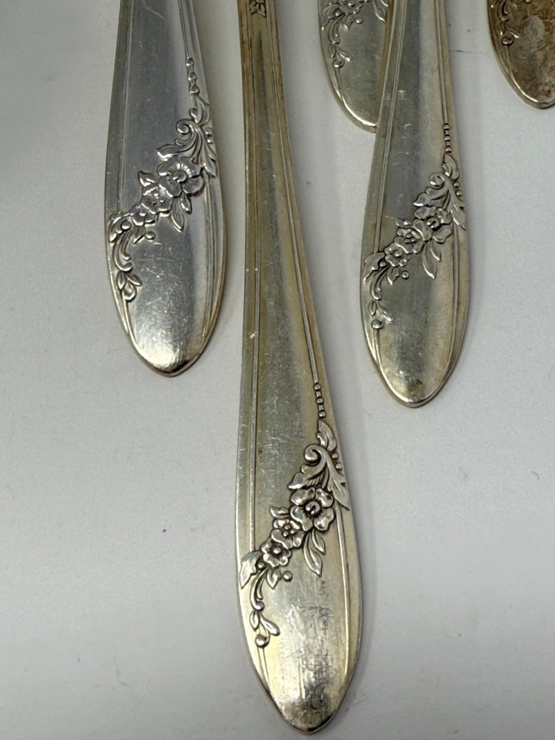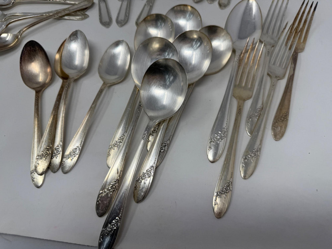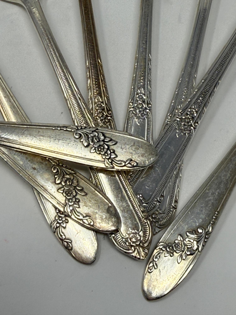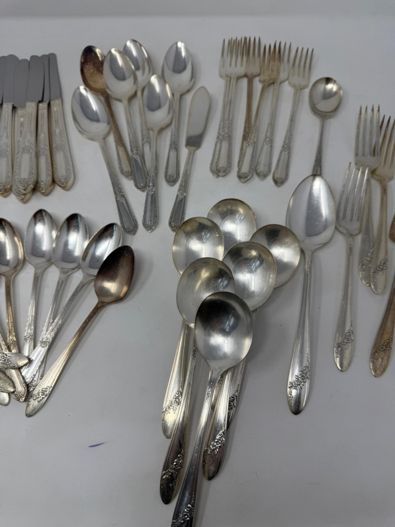 1847 Rogers Bros “First Love” Silver Plate Flatware Set 6 dinner forks 5 small spoons 2 serving spoons 5 knives 7 small forks 6 soup spoons