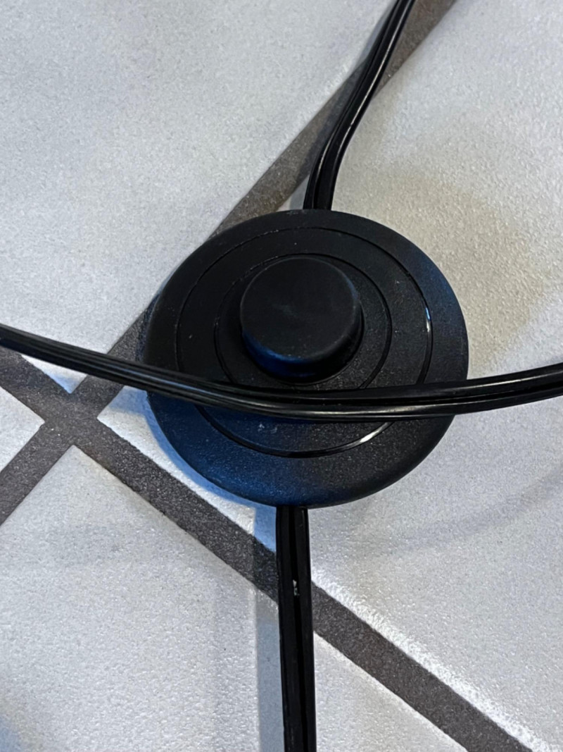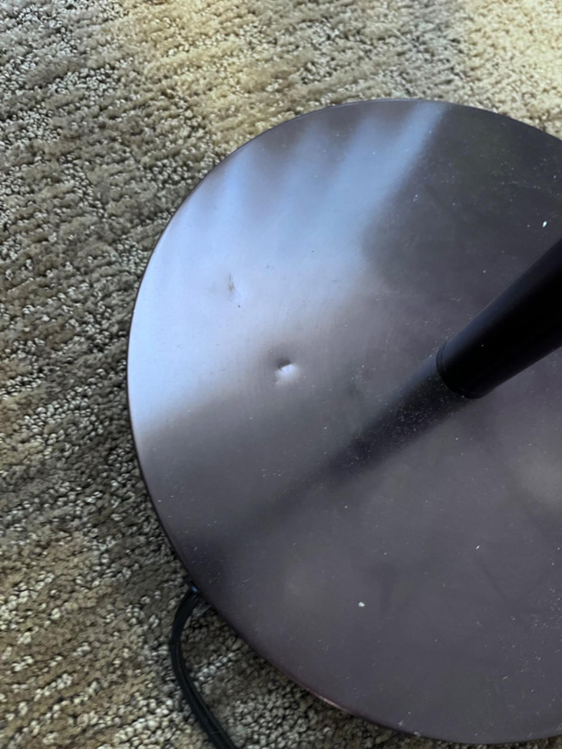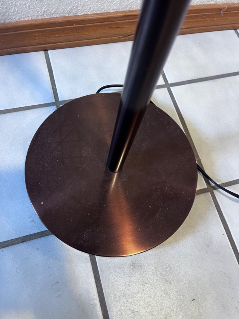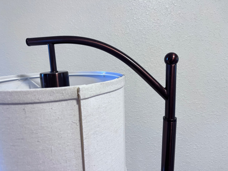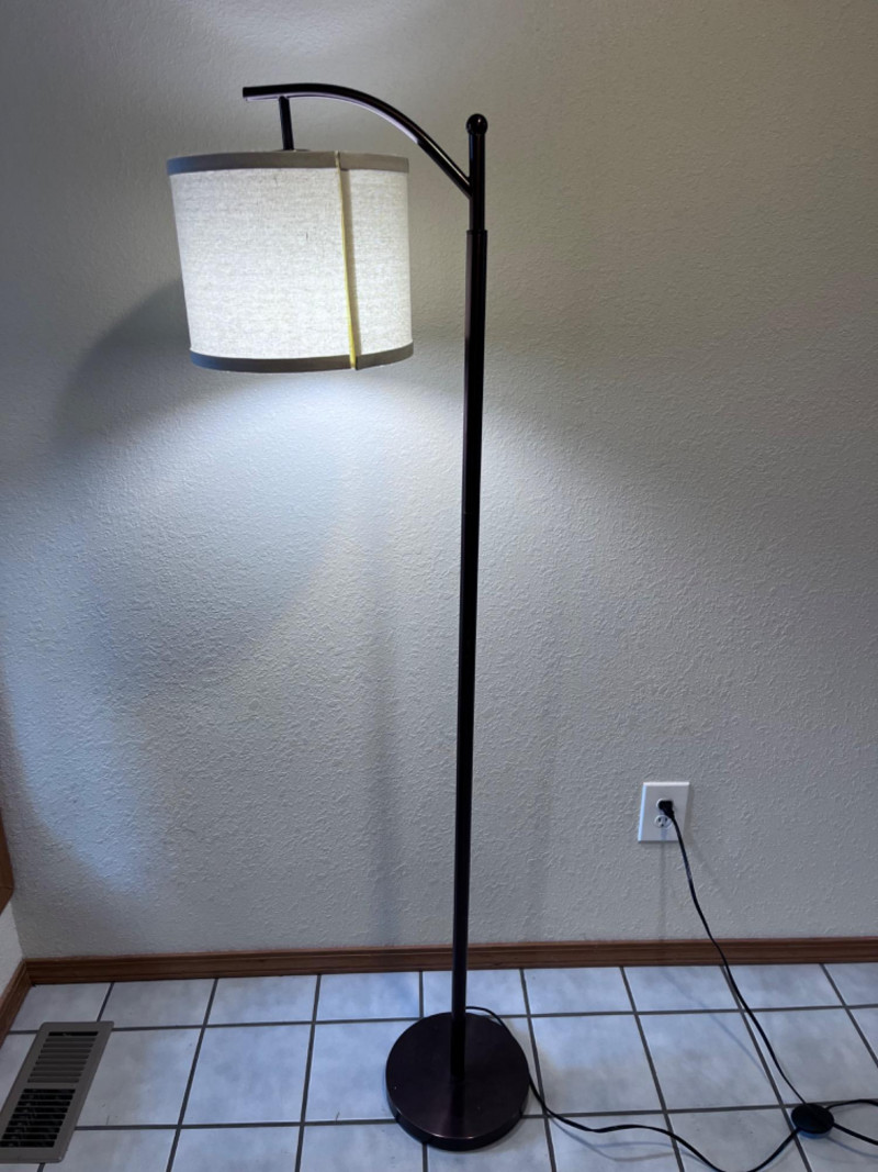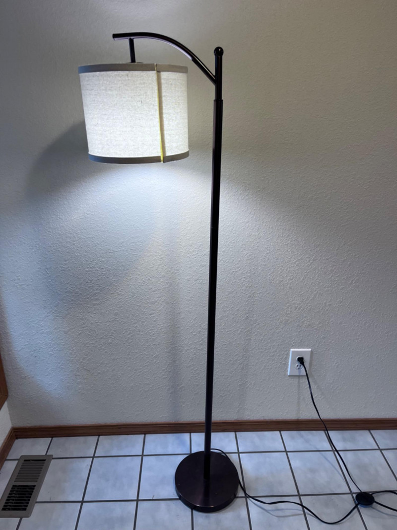 *Brown 1-Light Arched Floor Lamp with Linen Shade White linen shade. Shade is detachable by Velcro. Small dents on base. 19”x11”x62” Tested: Turns on.