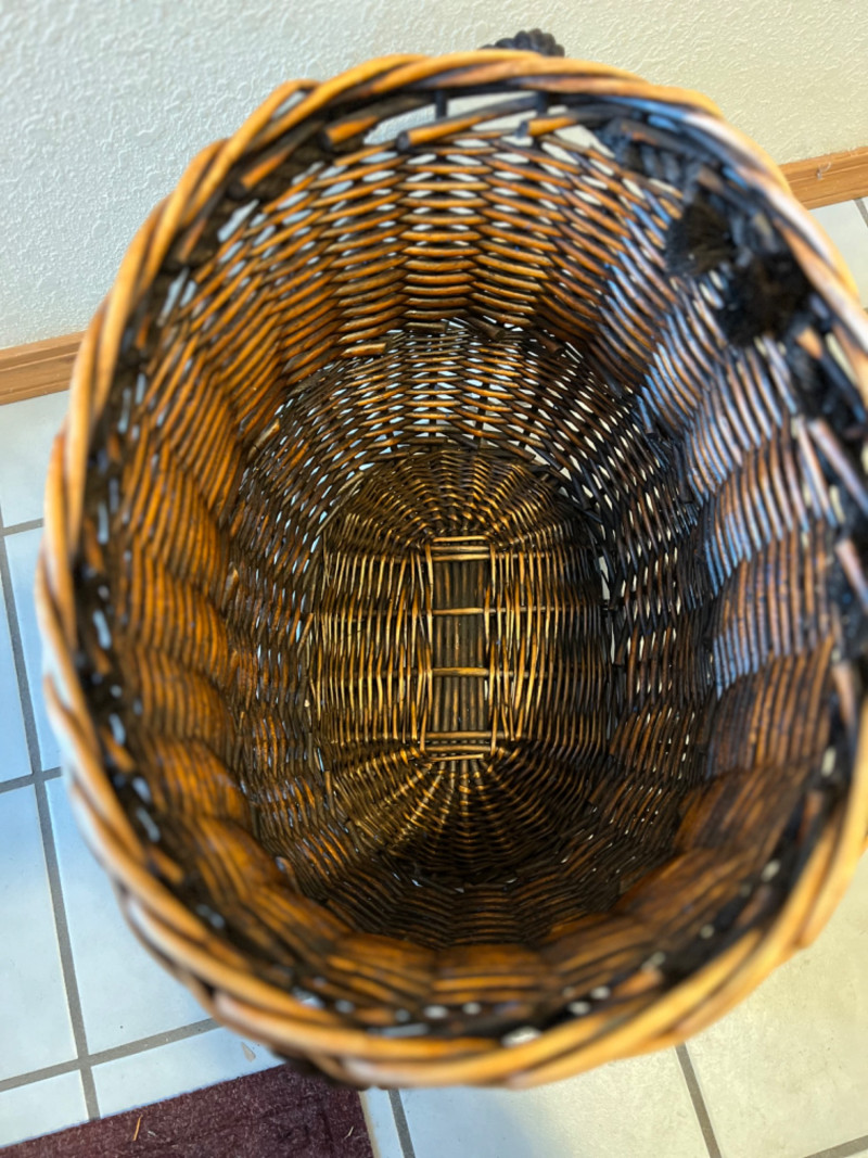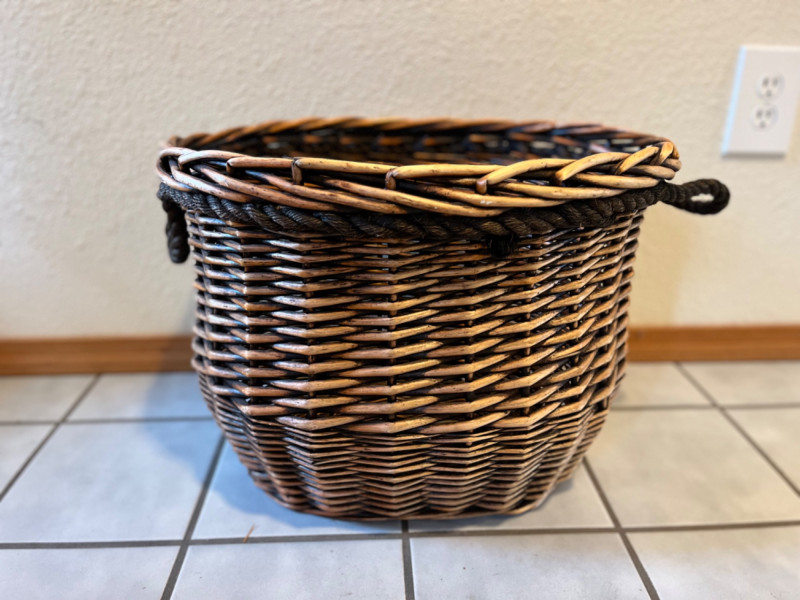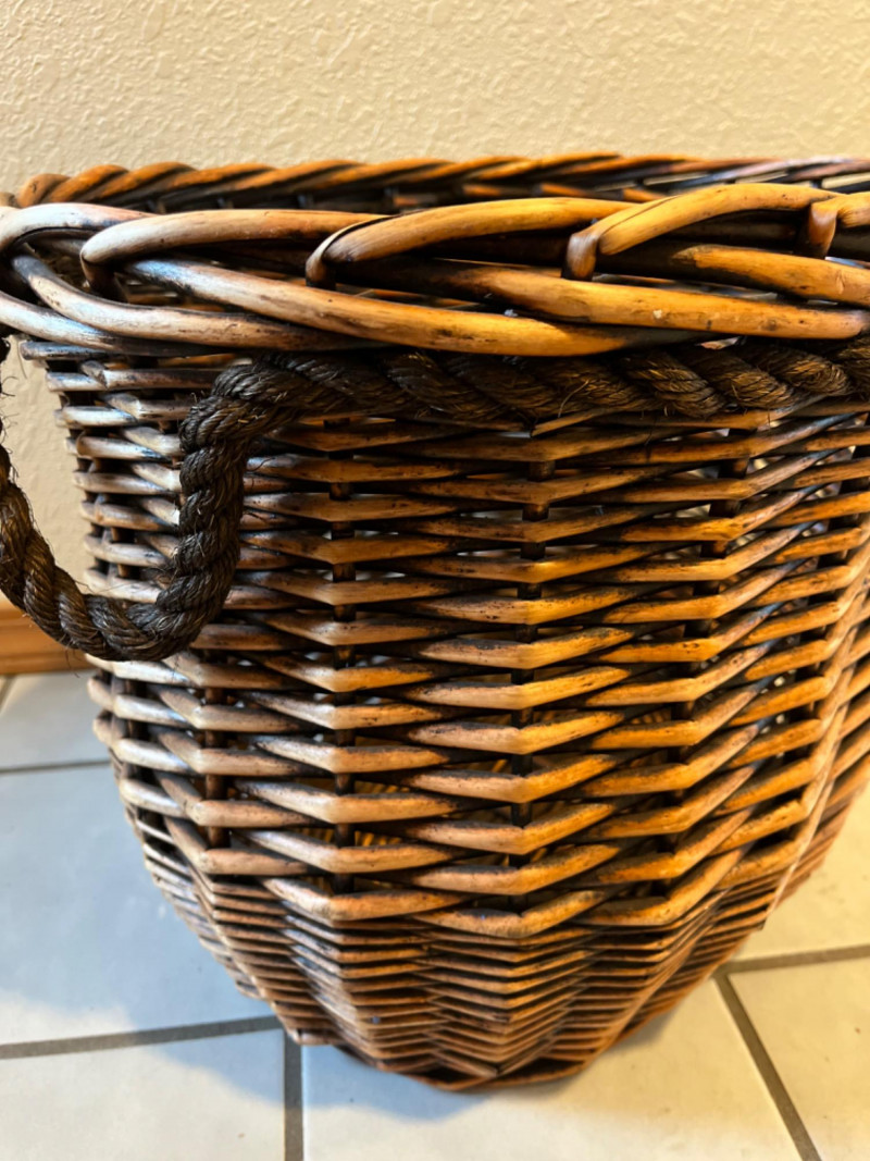 *Handwoven Wicker or Rattan Basket with Dark Twisted Rope Handles Primary material is woven wicker or rattan, which is a durable, natural, and renewable resource. The handles appear to be made of thick, twisted black or dark rope, likely abaca or a similar fiber. Basket features an intersecting or diagonal woven pattern with contrasting light and dark colors. 19”x15”x14.5”