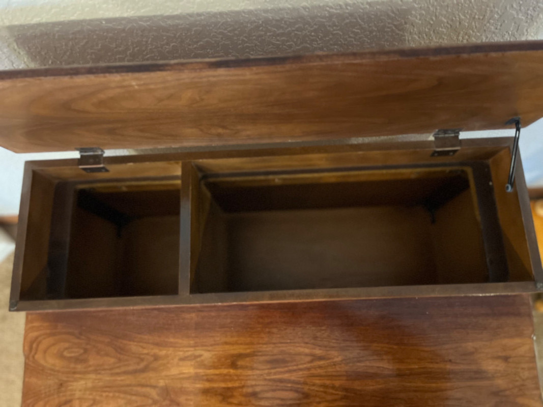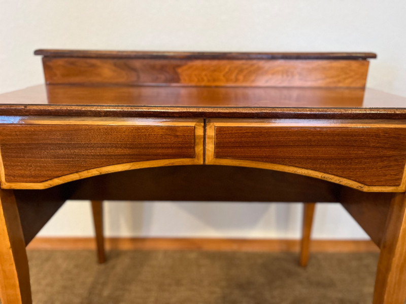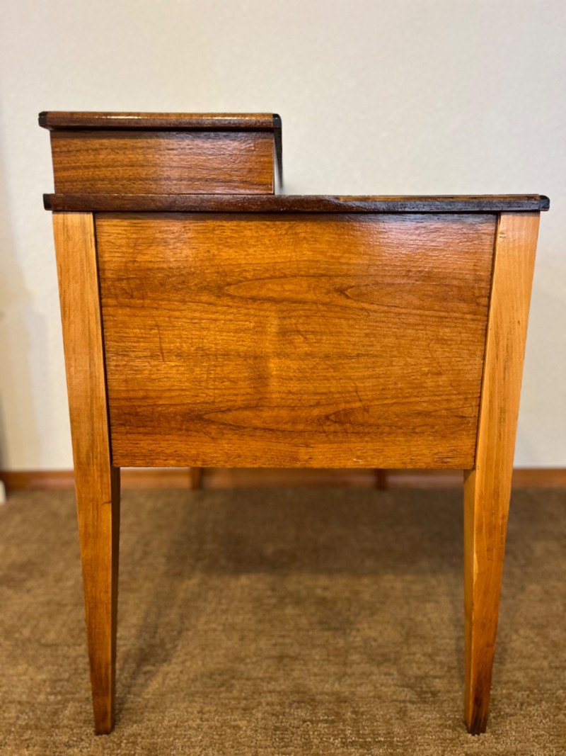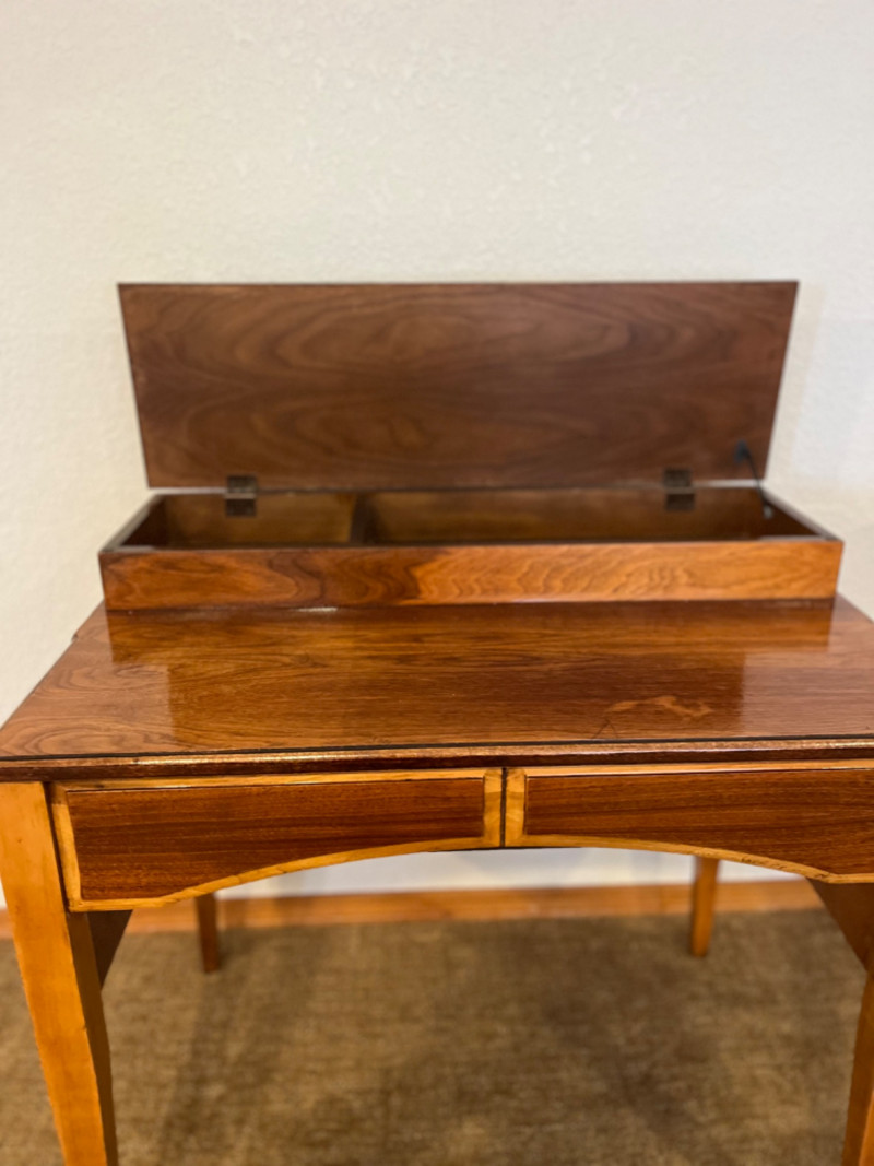 Handmade writing desk with hinged box lid, opening to two deep storage compartments.