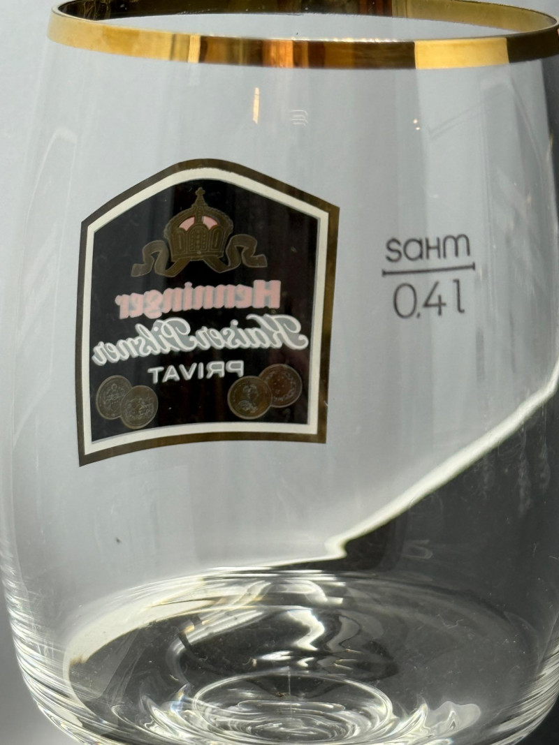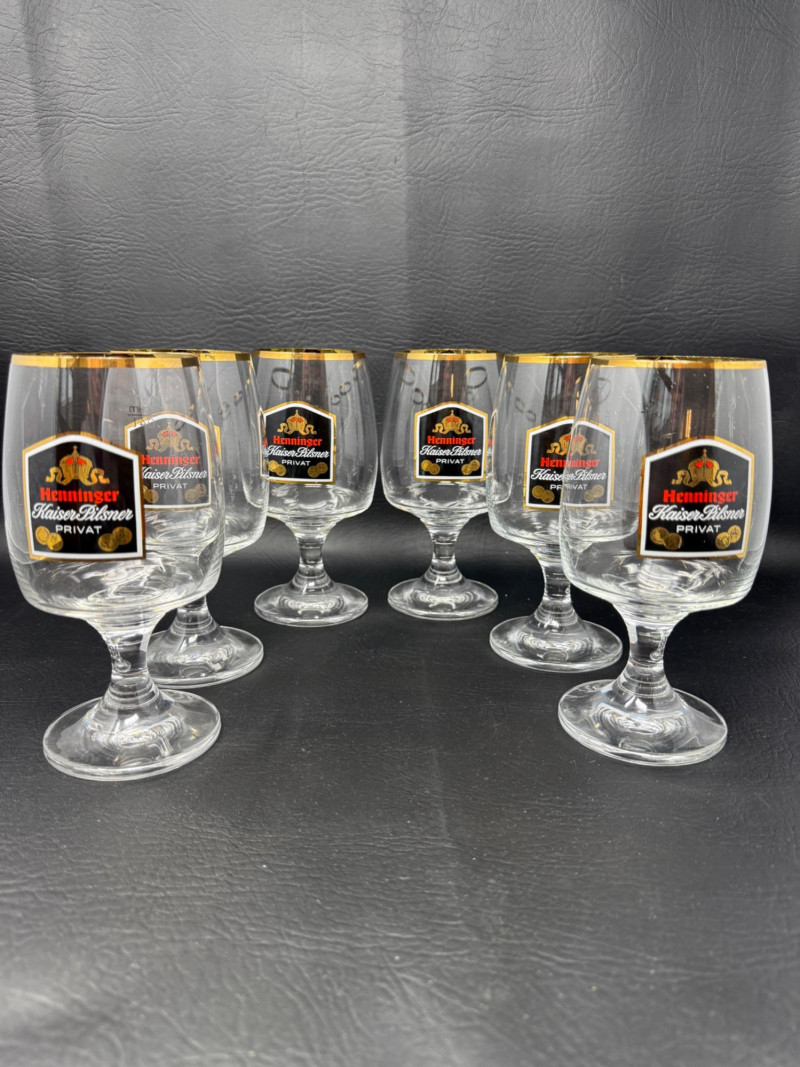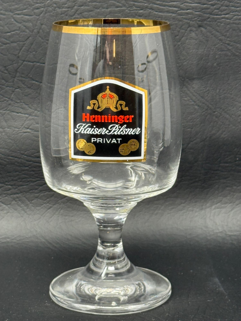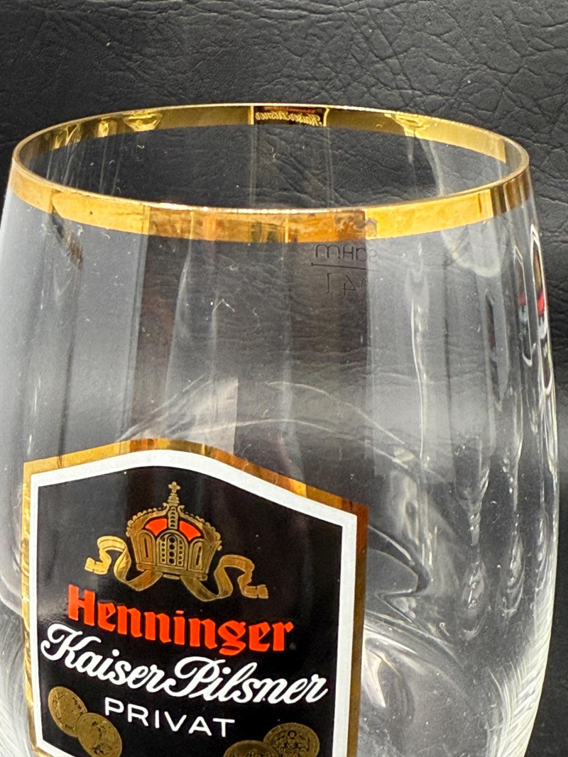 (6) Vintage Henninger Kaiser Pilsner Privat Stemmed Beer Glass from Germany. 7” Pilsner Stems with gold accents and rims.