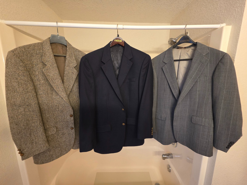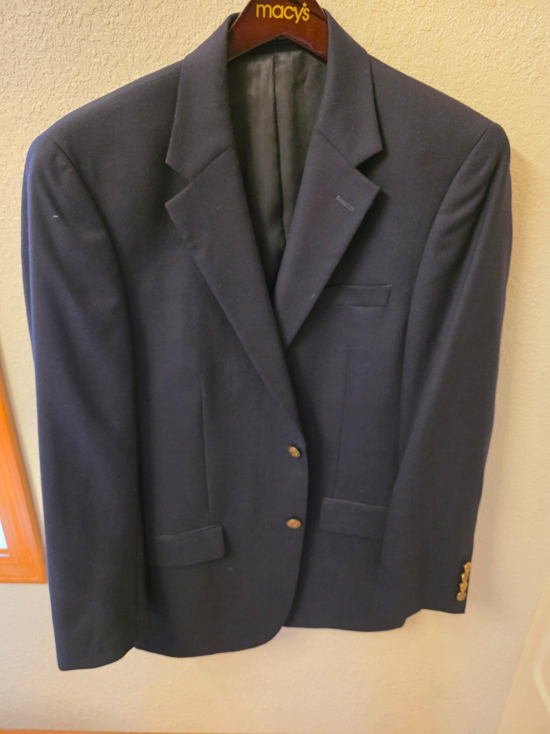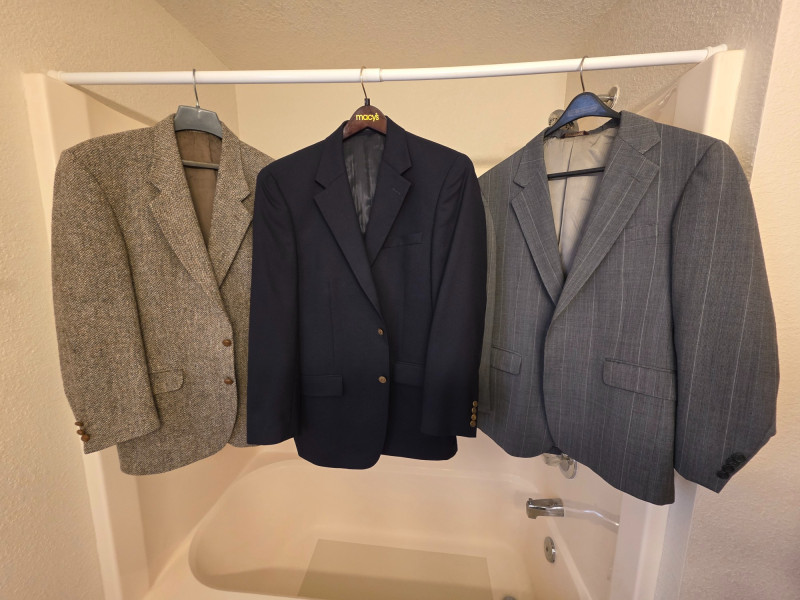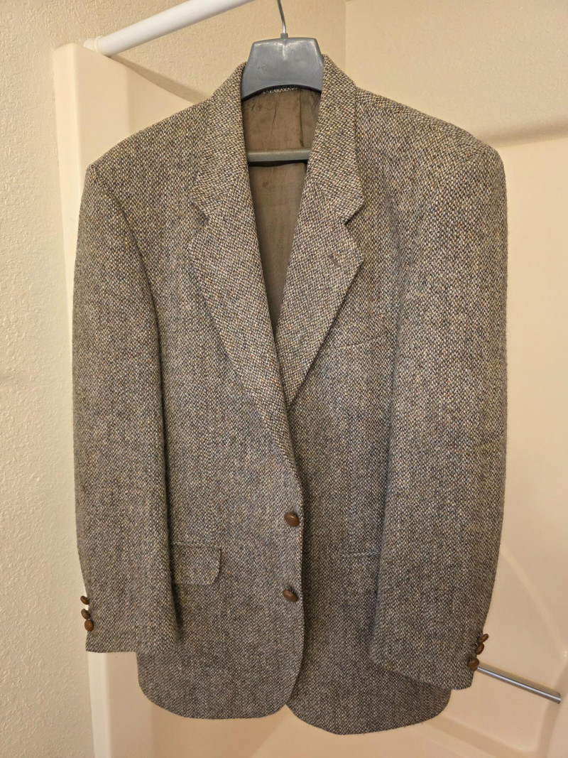 (3) Men's Suit Jackets/Blazers (1) Alexandre of London Hand Woven Harris Tweed 100% Wool (1) Macy's Club Room Easy Traveler (Navy Blue) (1) Cricketeer (Gray) Jackets 19" across the shoulders and 34" long. Sizes were measured and are approximate In good clean condition