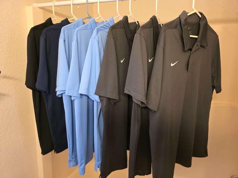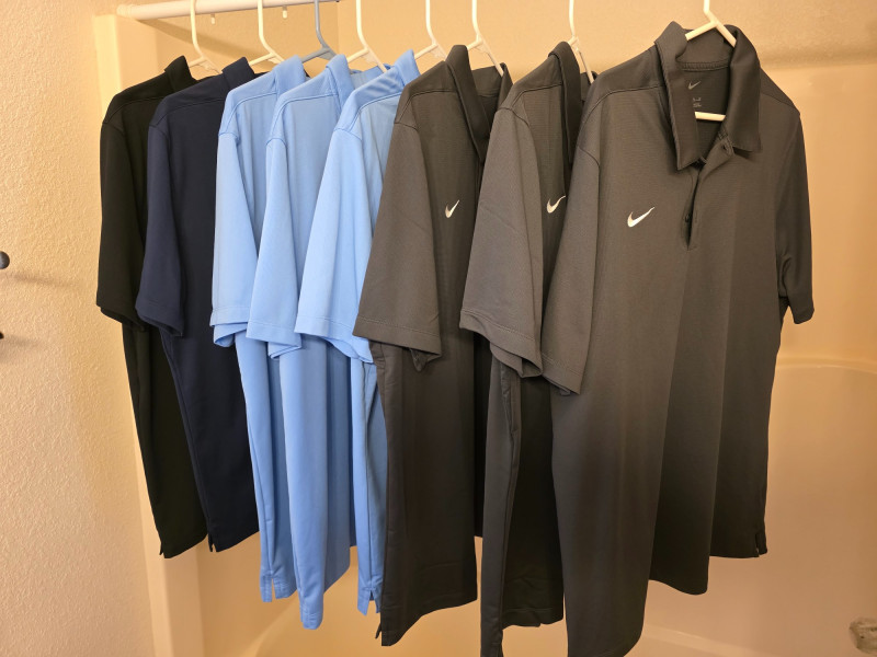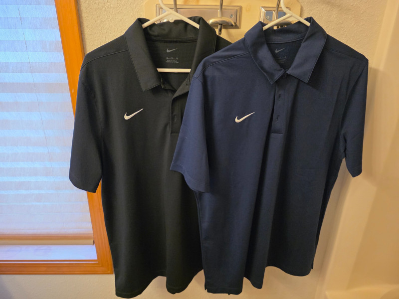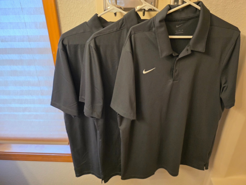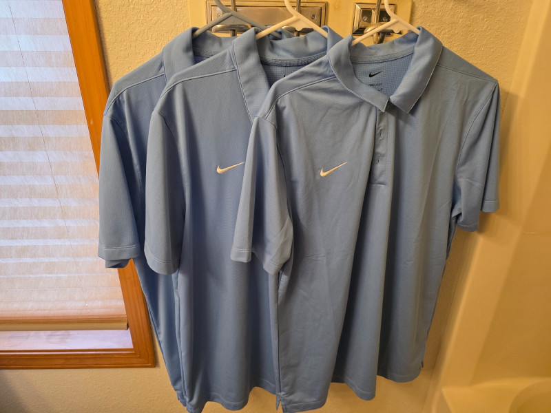 (8) Nike Golf Men's Polos - Size L & XL Dri-Fit with embroidered "Swoosh" logo on chest 100% Polyester (3) Dark Gray - XL (2) Light Blue - XL (1) Light Blue - L (1) Navy Blue - L (1) Black - XL In good clean condition!