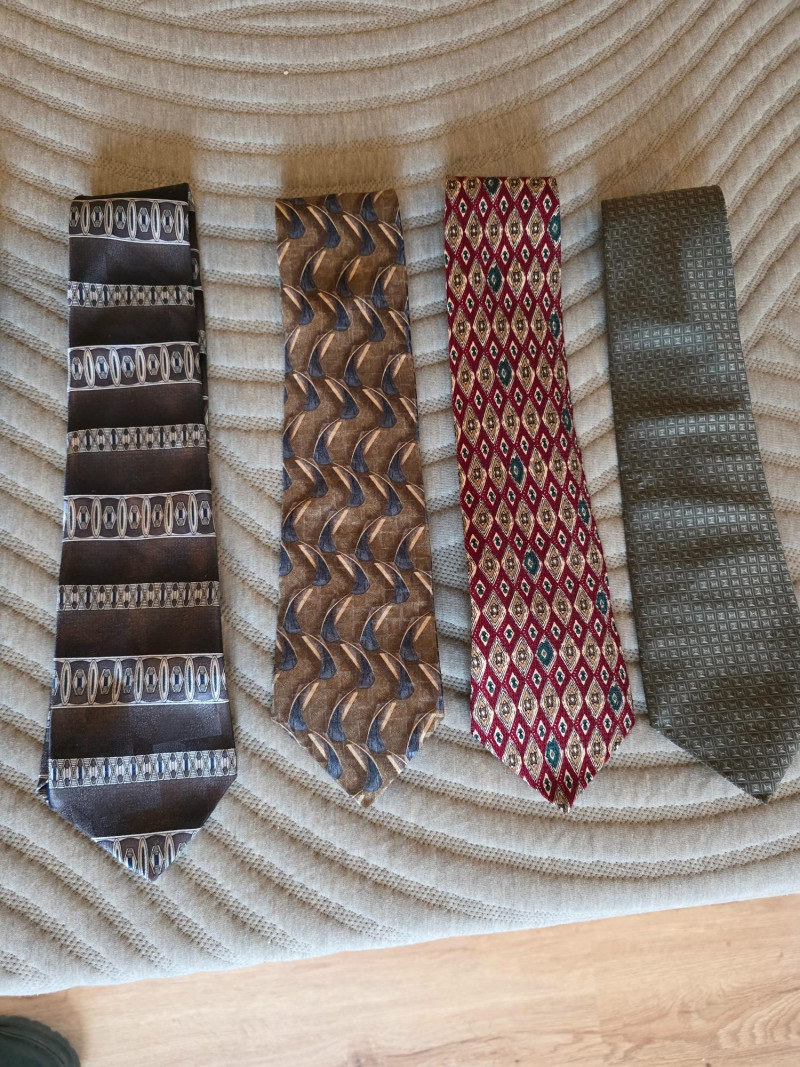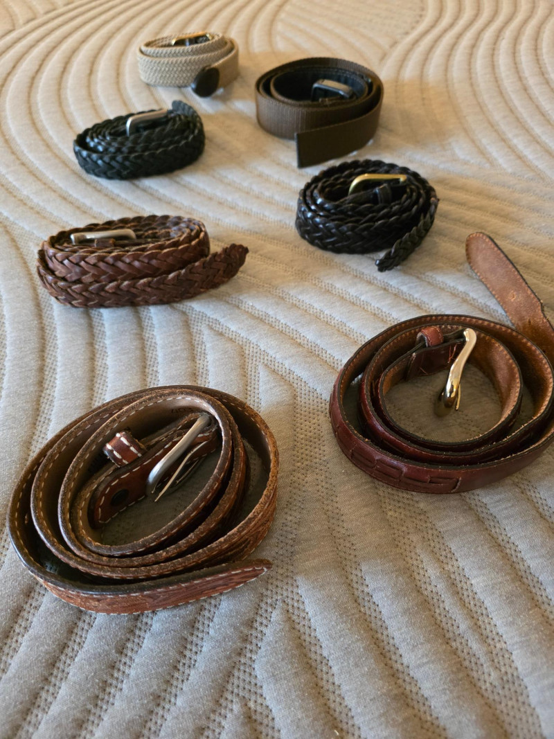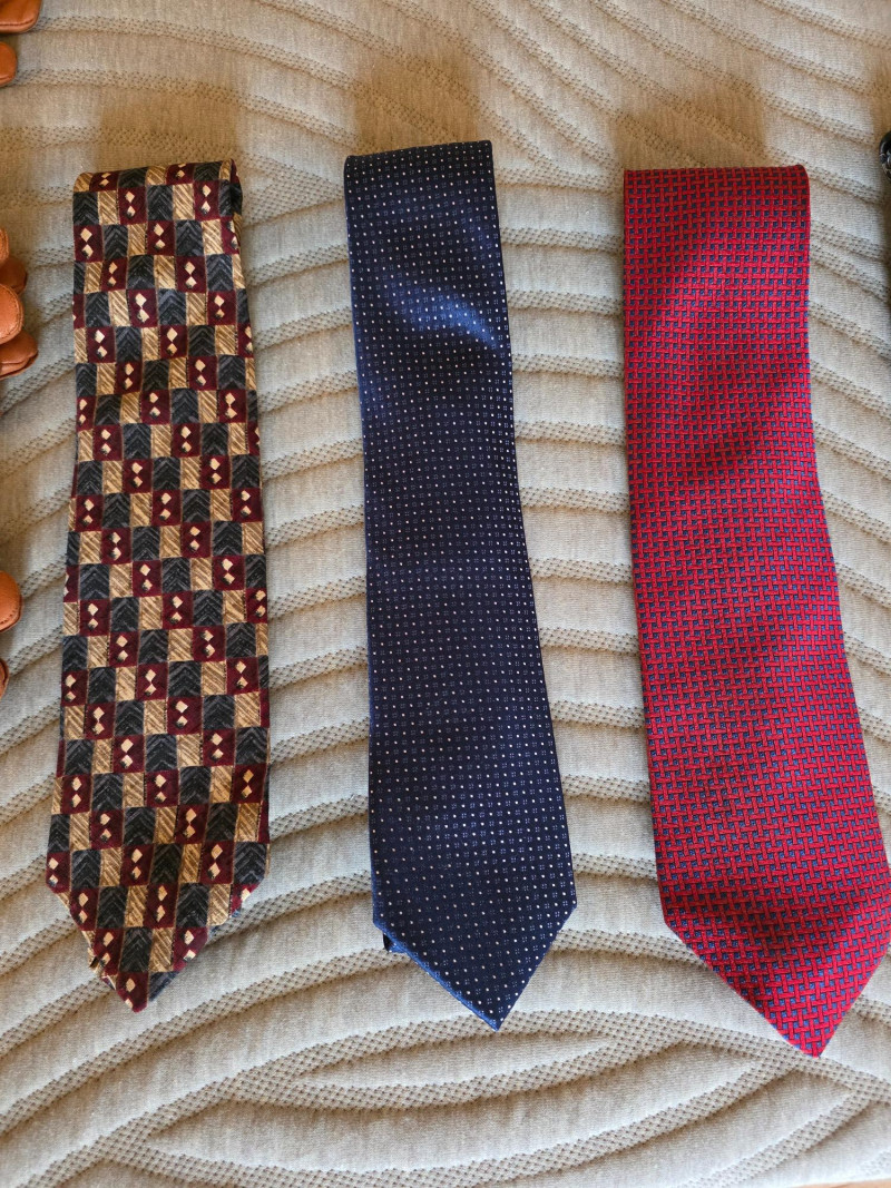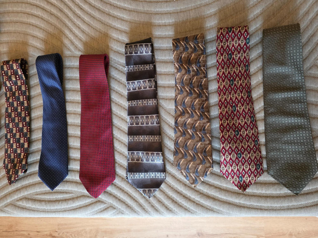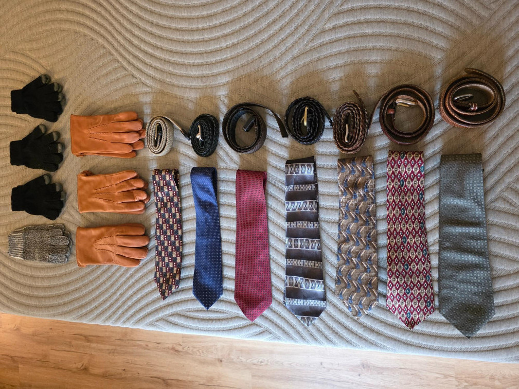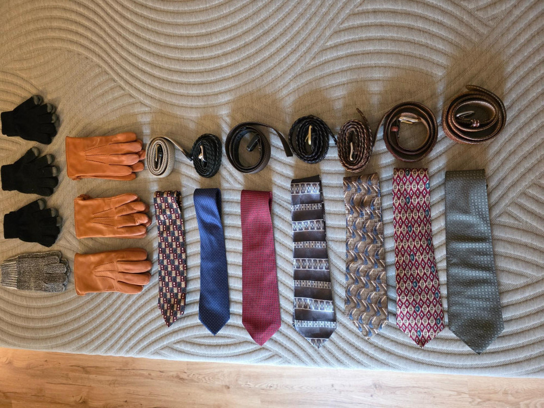 MMen's Belts, Ties & Gloves (7) Belts (34-36): (3) Leather braided belts (1) Elastic braided stretch belt (1) Webbing belt (1) Western leather belt (1) Leather dress belt (7) Ties: Stafford, Van Heusen, Burma, Don Loper, DKNY, Nordstroms & Barrington (7) Gloves: (3) Harssidanzar leather gloves - XL (4) Knit gloves