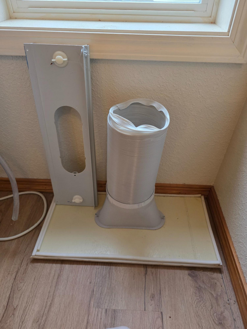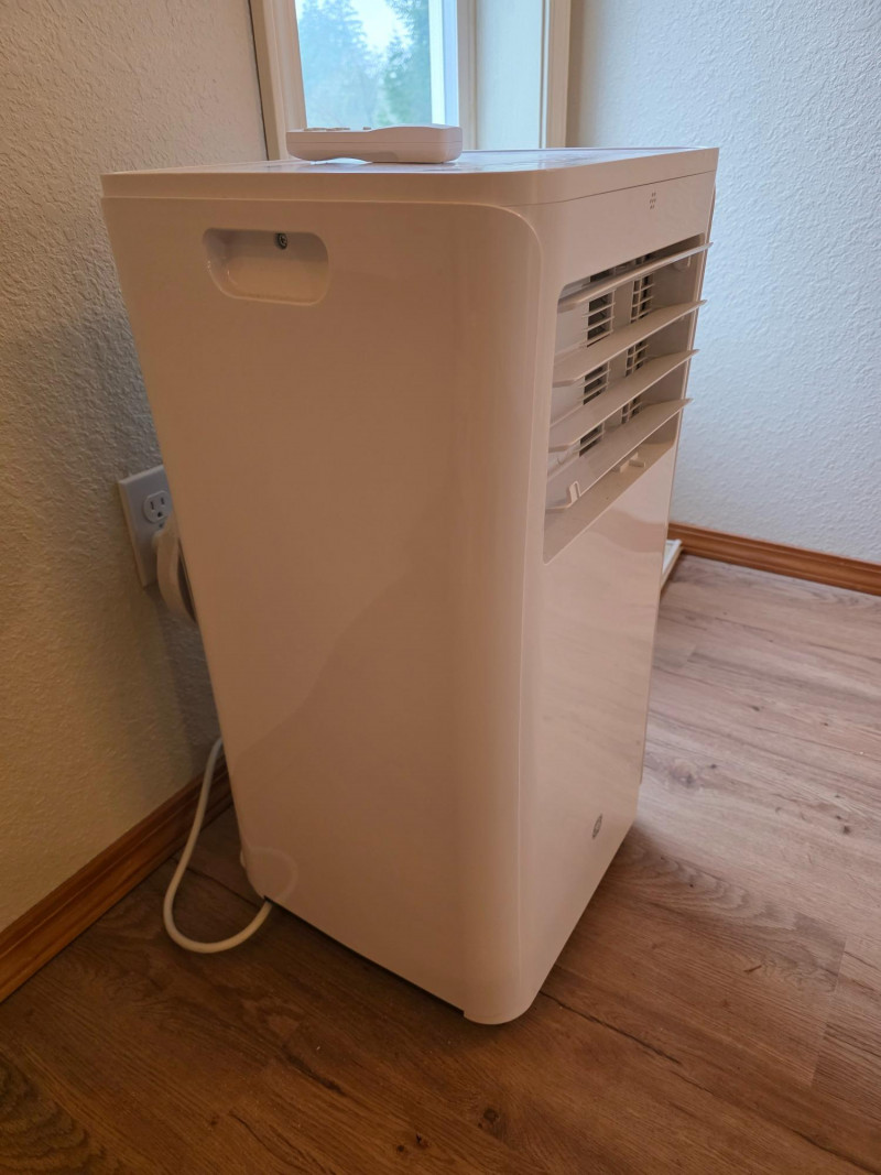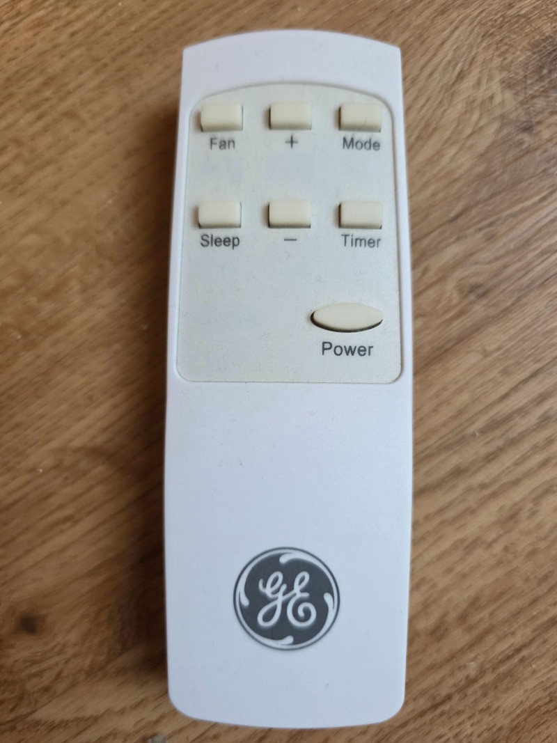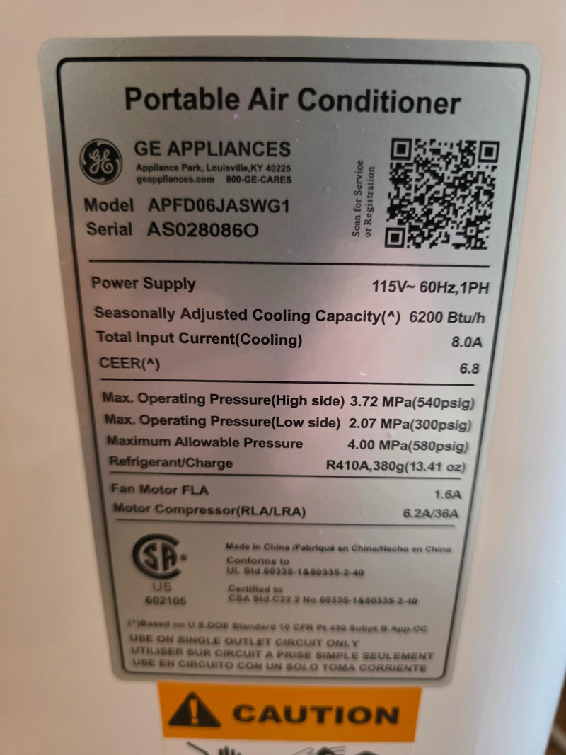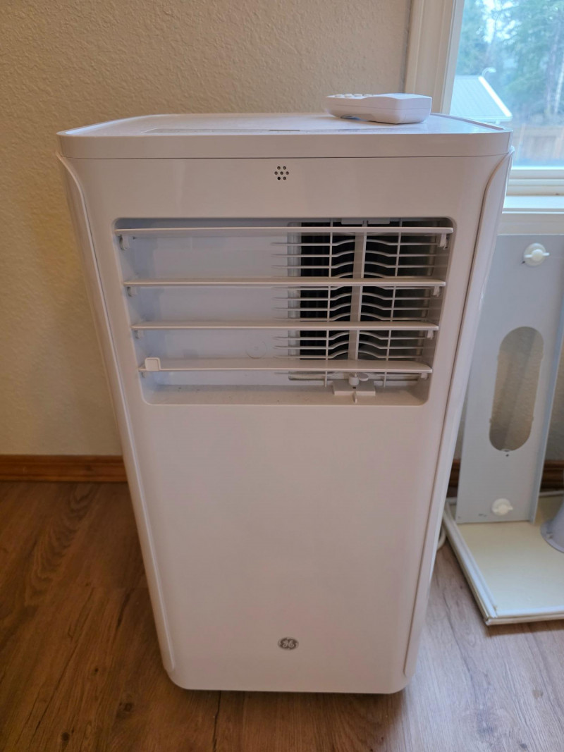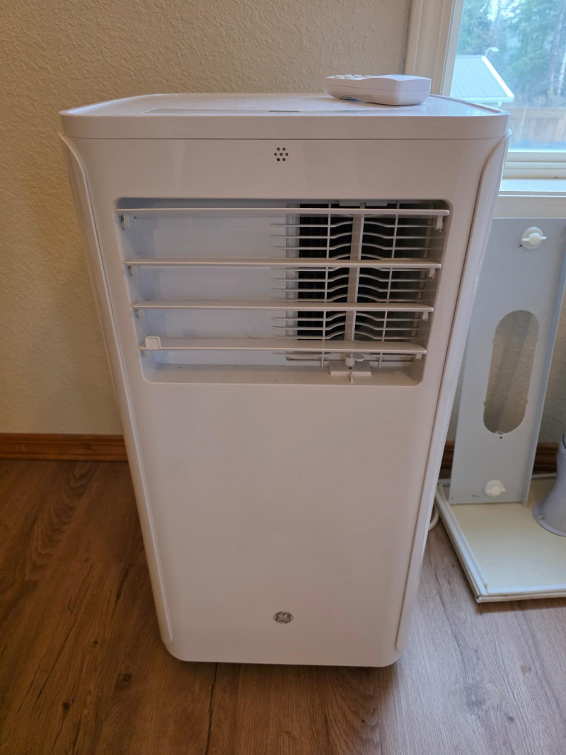 GE Portable Room Air Conditioner With Remote Control GE Model #APFD06JASWG1 GE 6,100 BTU Portable Air Conditioner designed to cool small rooms up to 250 square feet. It is a 3-in-1 unit that also features a built-in dehumidifier and two fan speeds Cooling Capacity: 6,100 BTU cooling capacity (DOE standard) for maximum comfort in rooms up to 250 square feet. 3-in-1 Functionality: Offers air conditioning, a two-speed fan, and a dehumidifier that removes up to 55 pints of water per day. Auto Evaporation Technology: In most typical room conditions, the unit is self-evaporative, meaning it collects and disposes of excess water without the need for manual draining. Controls and Remote: Features digital LED controls on the unit and an included remote control for adjusting settings from anywhere in the room. Portability and Installation: Equipped with easy-roll wheels (casters) for moving it from room to room. It comes with a window installation kit that works with double-hung or sliding windows. Additional Features: Includes a washable filter, a 24-hour on/off timer, auto restart after a power outage, and 2-way adjustable louvers for air direction control. Sound Level: Operates at a sound level of 52 dBA on low and 55 dBA on high settings Includes remote control, window kit & manual Tested - Works! 27.5"T x 14"W x 13"D