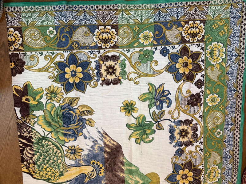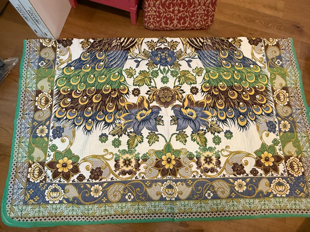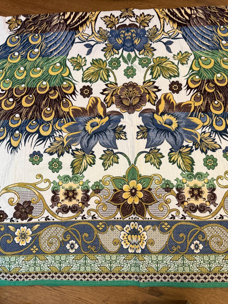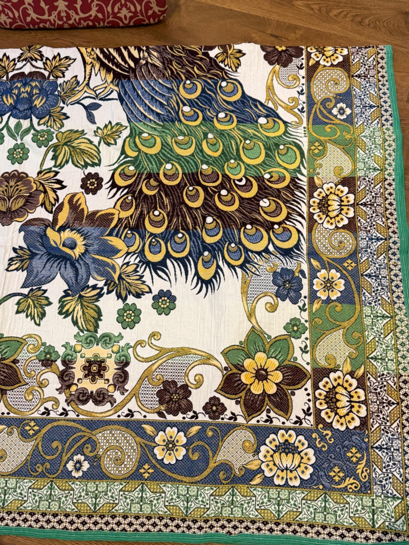 96x77” Peacock bedding tapestry. Bright and colorful Labeled Olchas San Rafael
