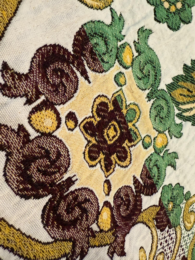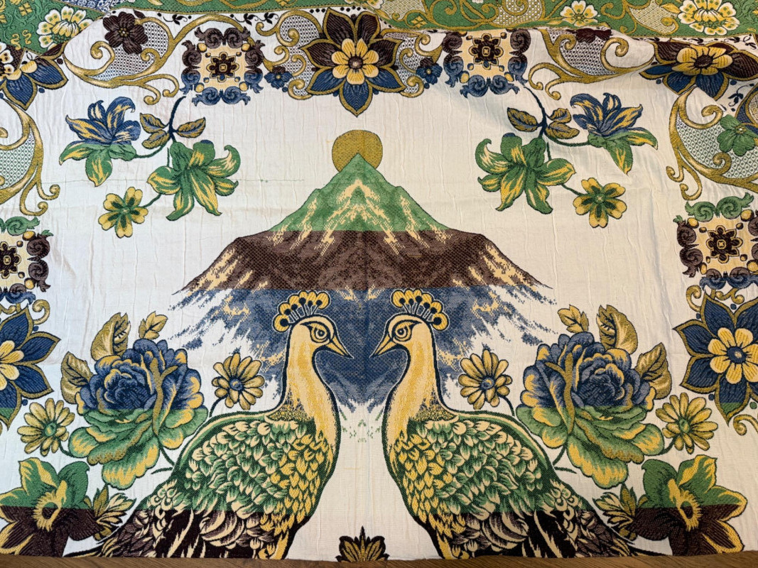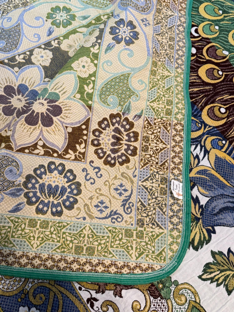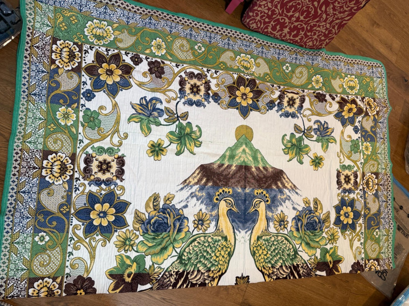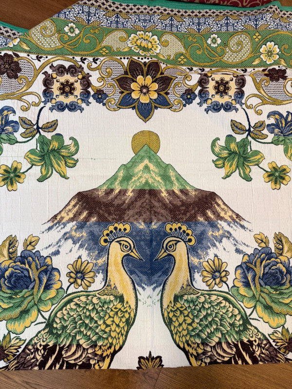 96x77” Peacock bedding tapestry. Bright and colorful Labeled Olchas San Rafael