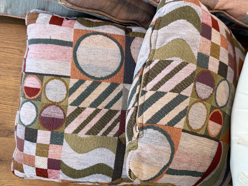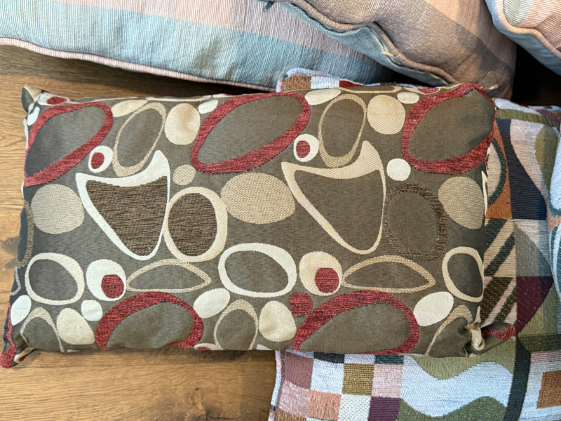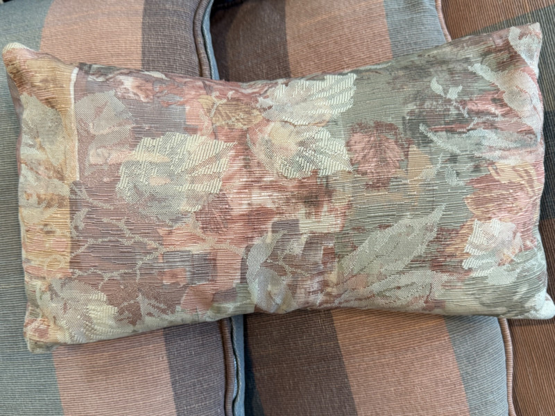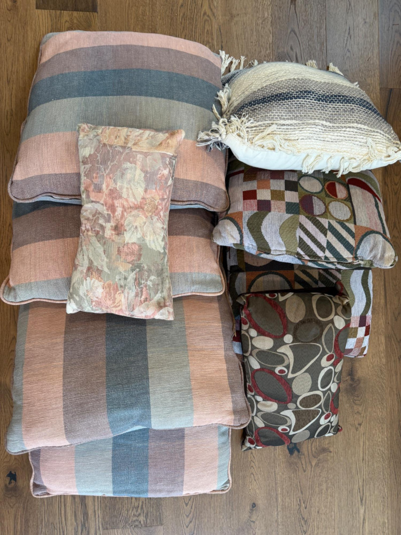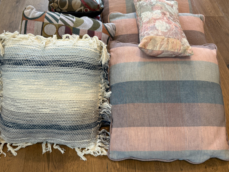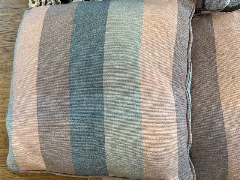 Throw Pillow Collection of 10 4- 20”x20” striped 2- pink floral bolsters blue fringe & 2- geometric are 16”x16” ovals bolster