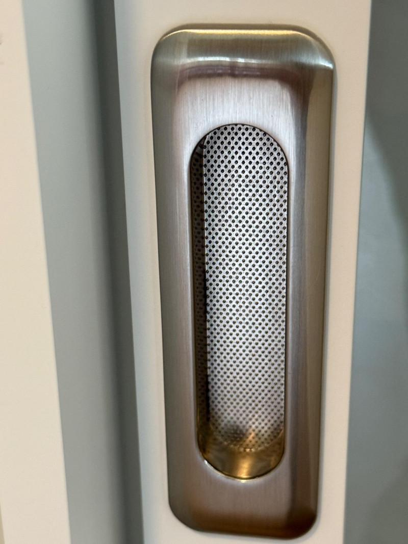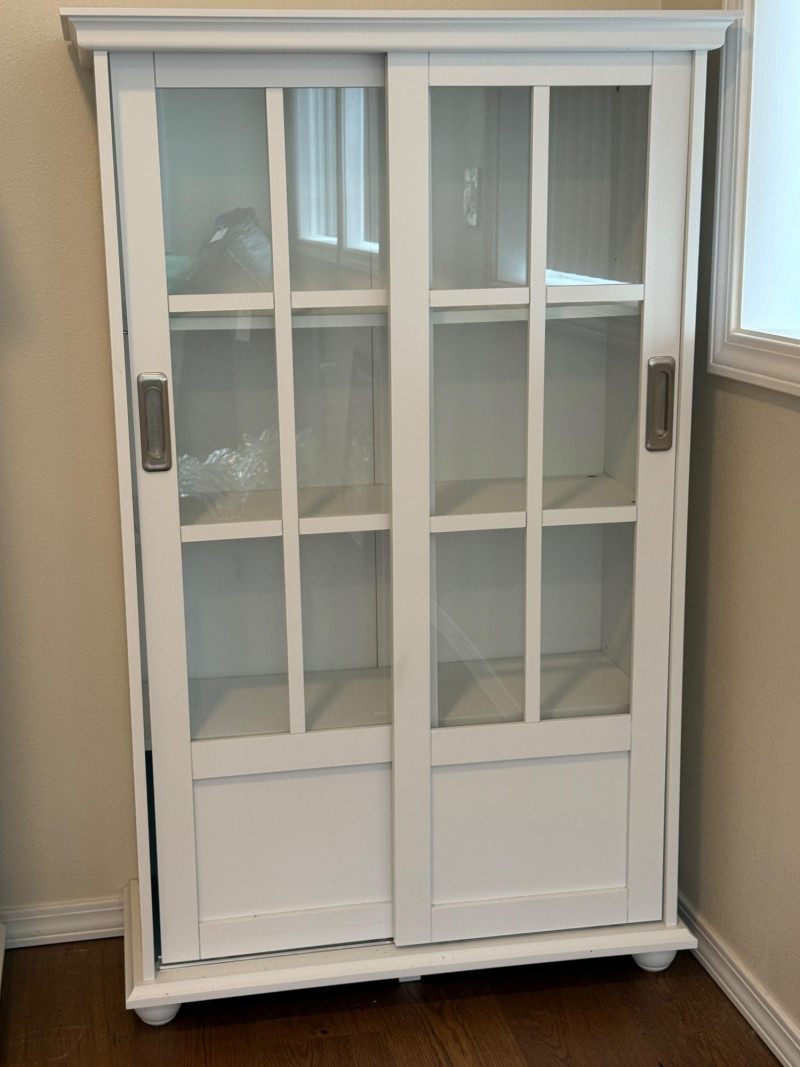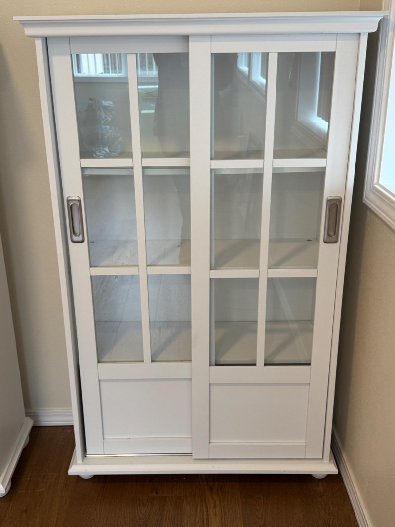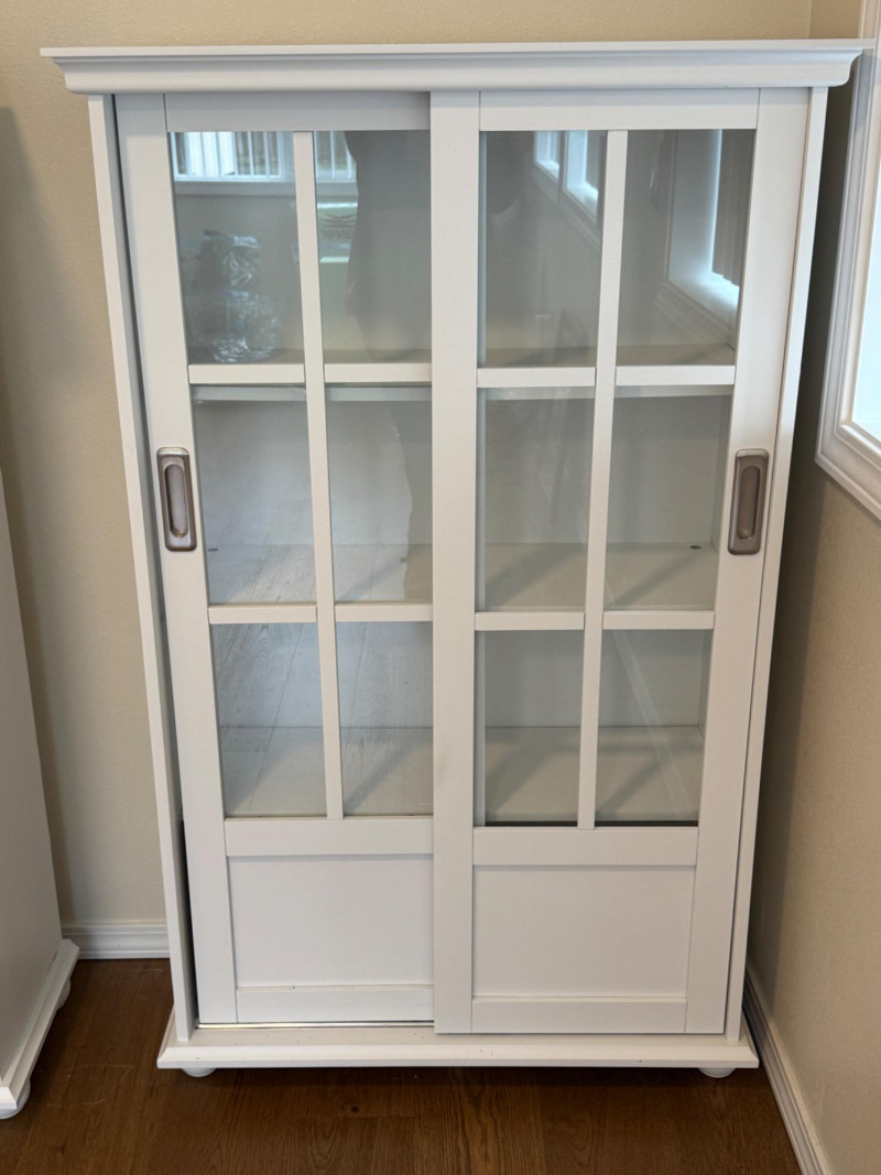 Ameriwood White Wood & Glass Compact Display Case. White Wood & Glass Compact Display Case with sliding doors and 2 adjustable shelves. Brushed nickel and mesh hardware.