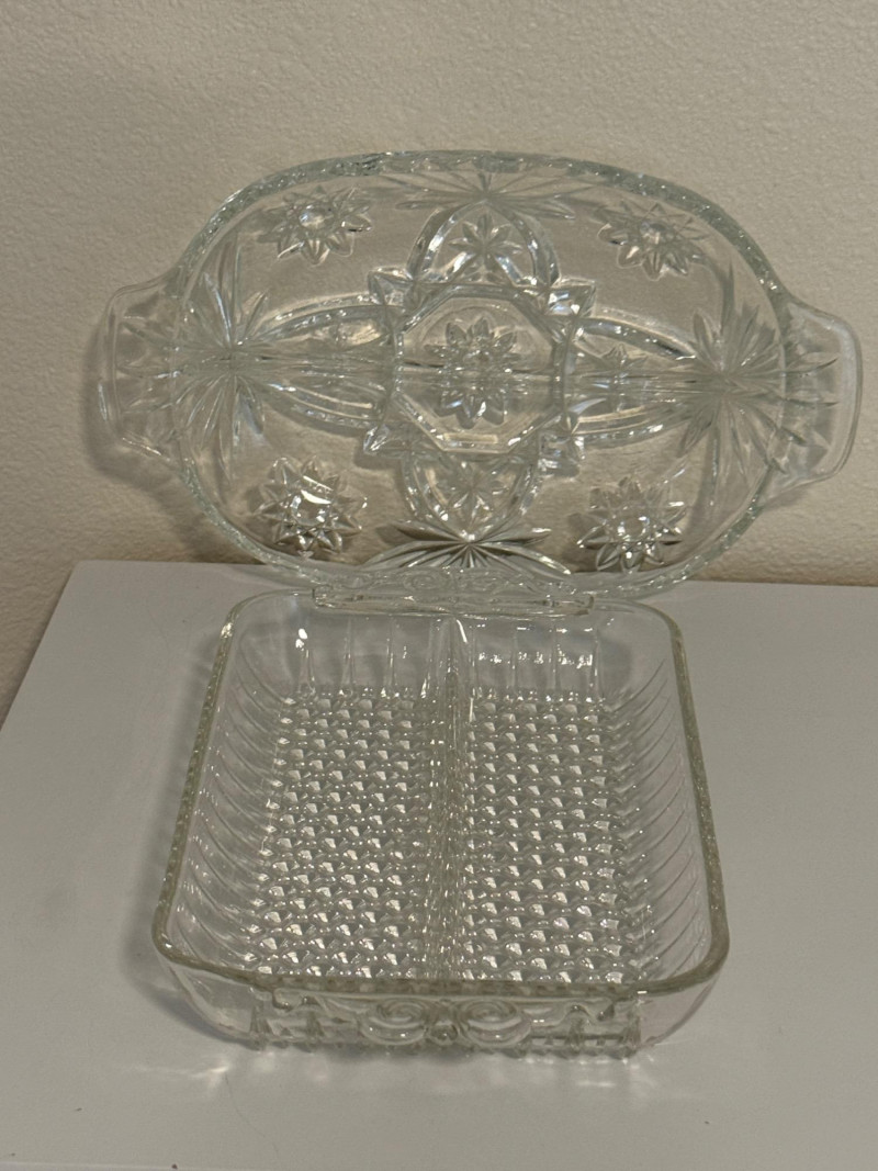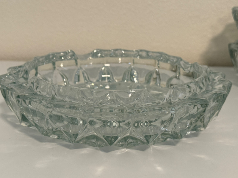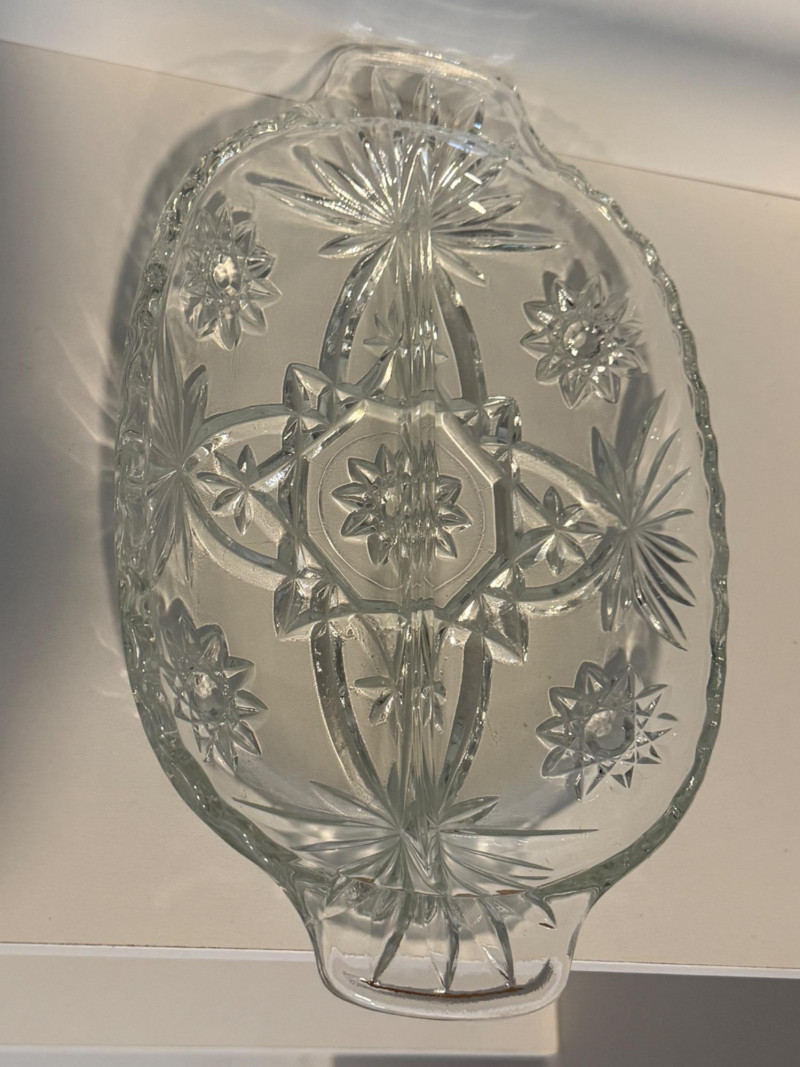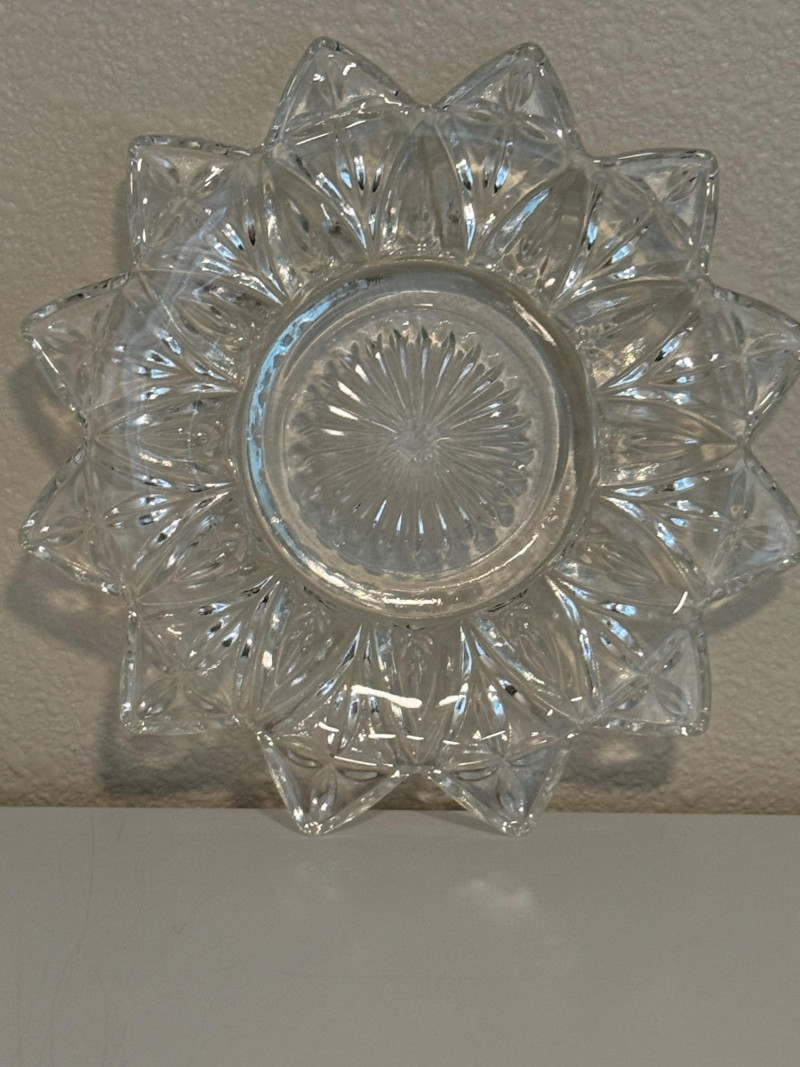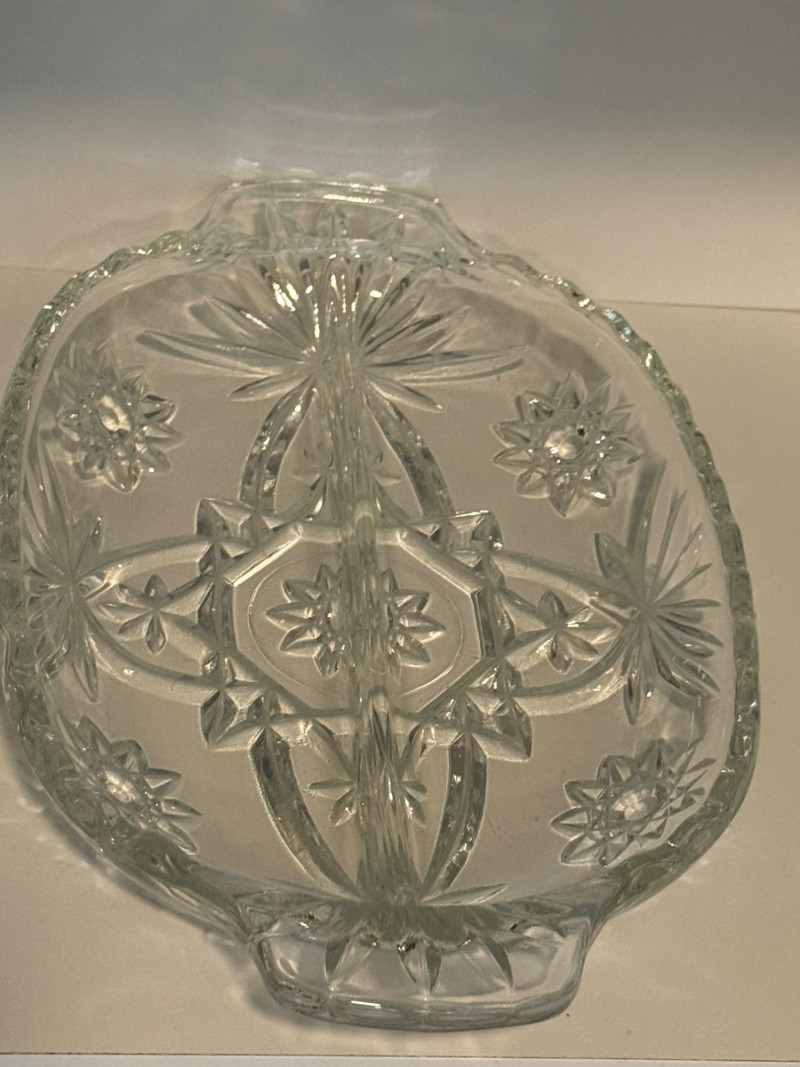 Party Pickle Plates - Nut Bowls - Ashtrays 7- 5.5” Iridescent nut dishes with zig zag edge 2- Two section olive or pickle plates 5.5 and 6” by 10”