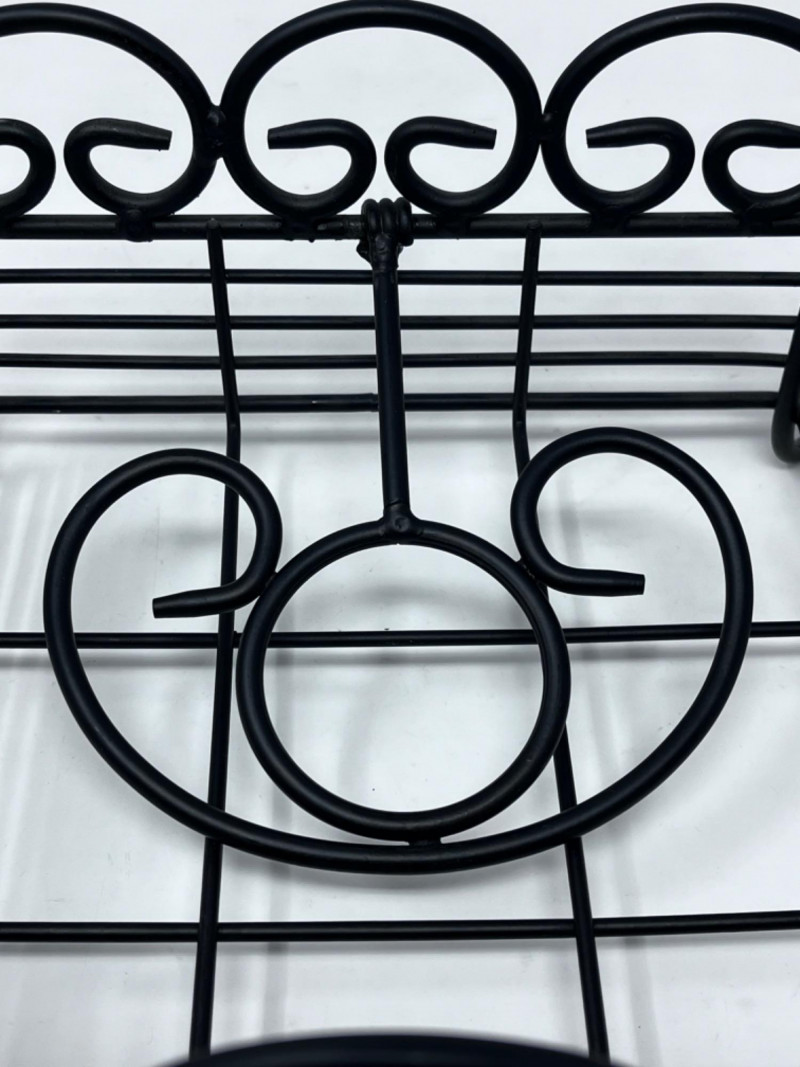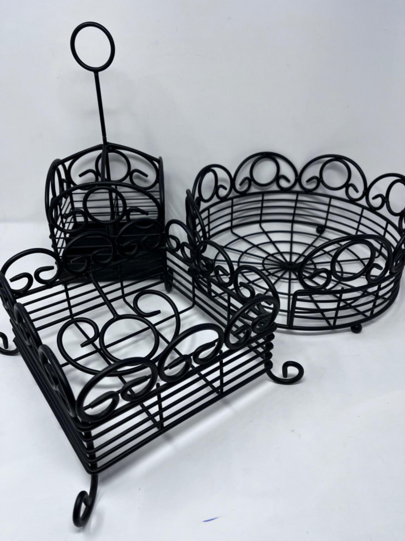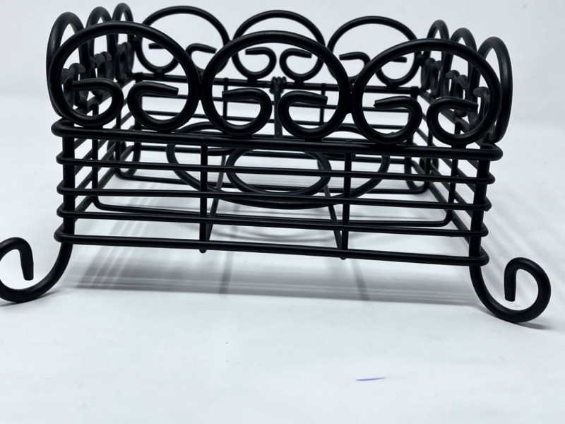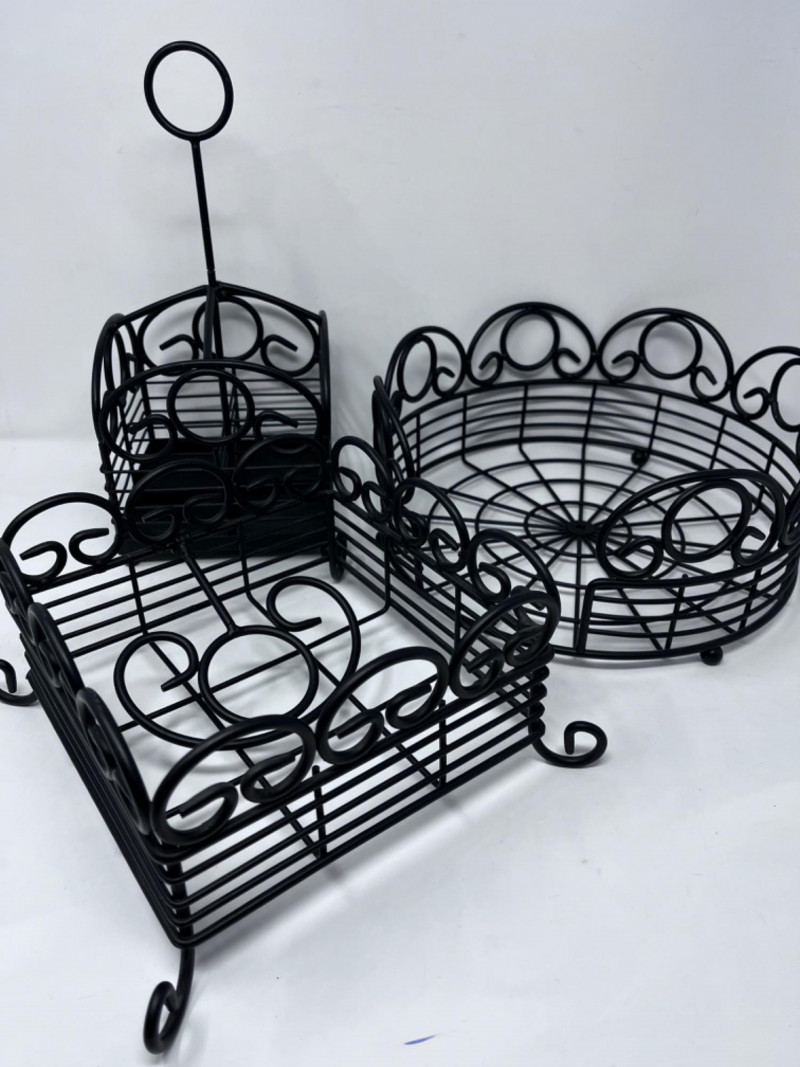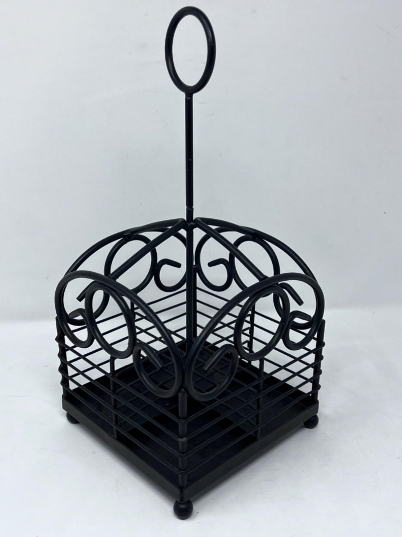 *Black Wire Buffet Set Napkin holder with arm to hold napkins down. 9.5”x9.5”x4.5” Condiment bottle holder with handle. Holds four bottles. 6”x6”x12.5” Paper plate holder. 11.5”x5”