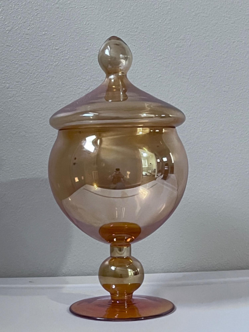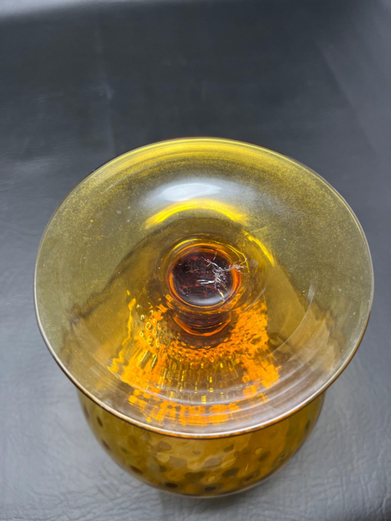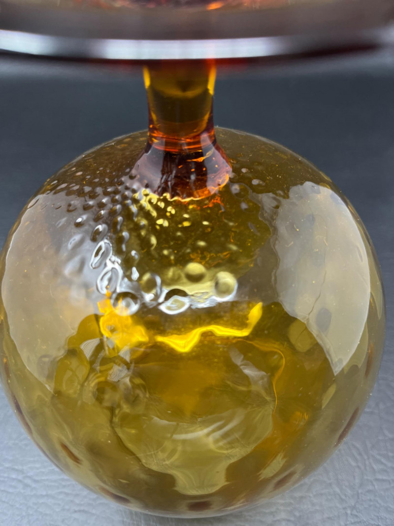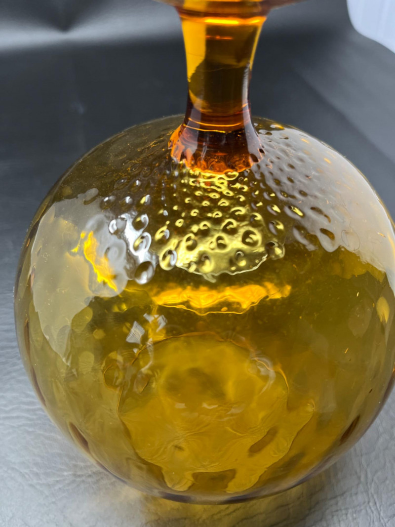 *Vintage Empoli Art Glass Collection Features a rich, honey-amber hue that glows in the light. Characterized by an oversized, snifter or "brandy balloon" shape, a short stem, and a broad base. Many examples, including the one pictured, feature an "optic" or "diamond optic" pattern adding texture. 6”x8” 6”x9” Empoli art glass honey amber squat apothecary jar with a circus tent lid. Vibrant iridescent honey amber color and a glossy finish. 6”x11”