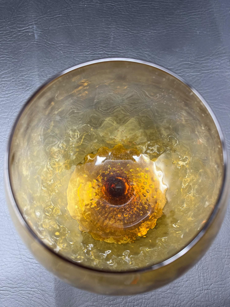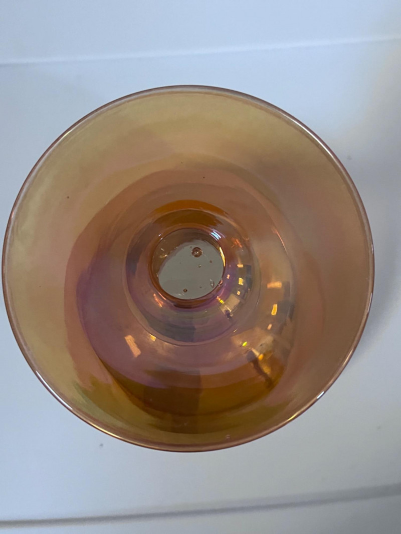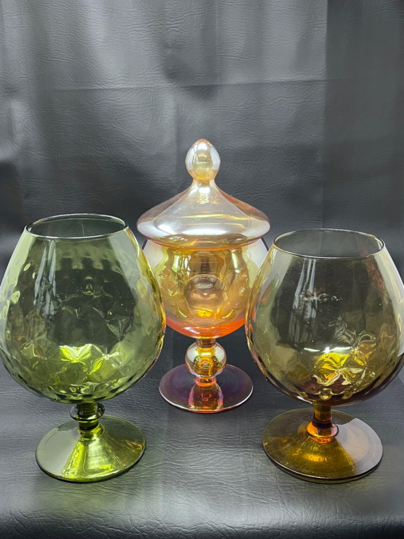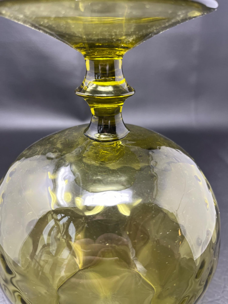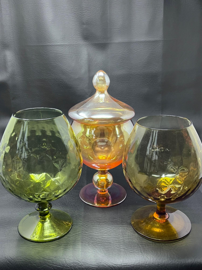 *Vintage Empoli Art Glass Collection Features a rich, honey-amber hue that glows in the light. Characterized by an oversized, snifter or "brandy balloon" shape, a short stem, and a broad base. Many examples, including the one pictured, feature an "optic" or "diamond optic" pattern adding texture. 6”x8” 6”x9” Empoli art glass honey amber squat apothecary jar with a circus tent lid. Vibrant iridescent honey amber color and a glossy finish. 6”x11”