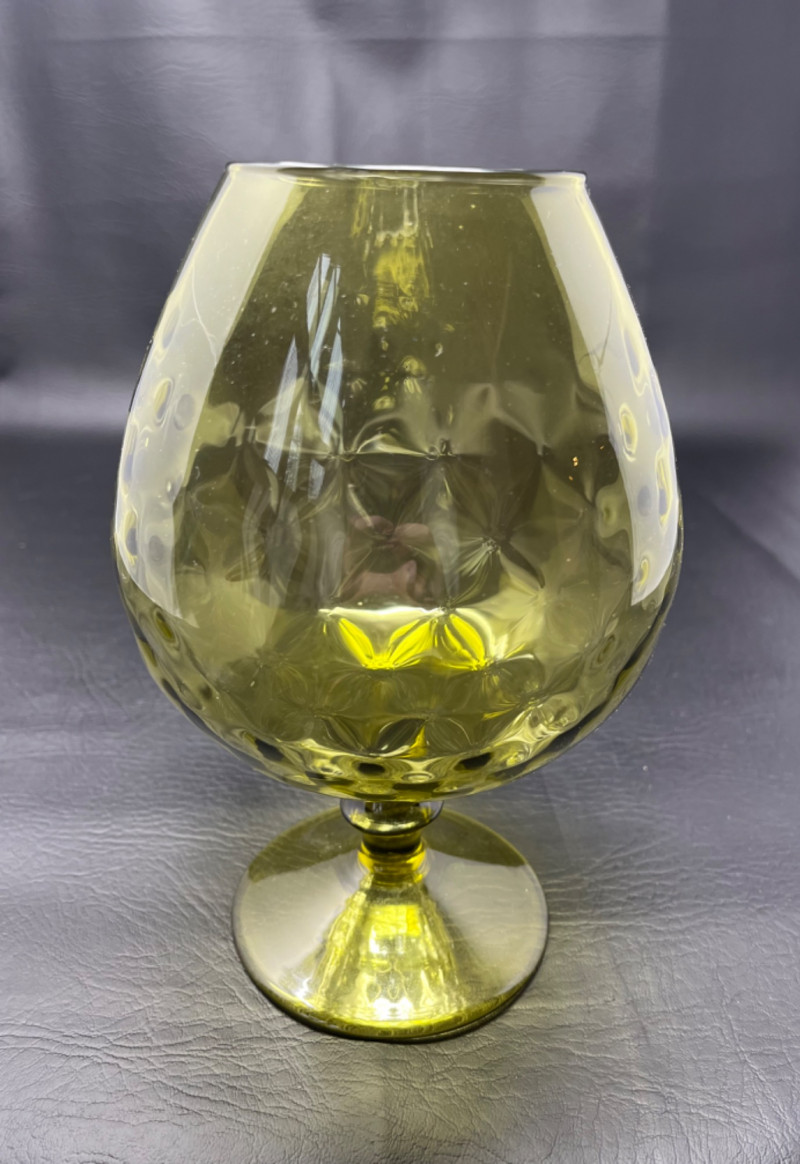 Classic brandy snifter (or pedestal vase) shape, and a textured diamond optic pattern (also known as hobnail or dimpled) that gives a unique 3D effect.