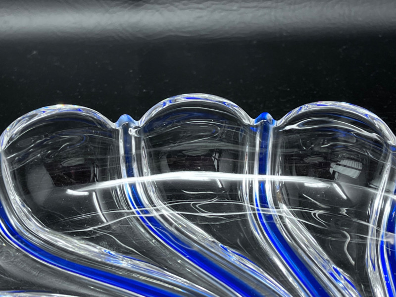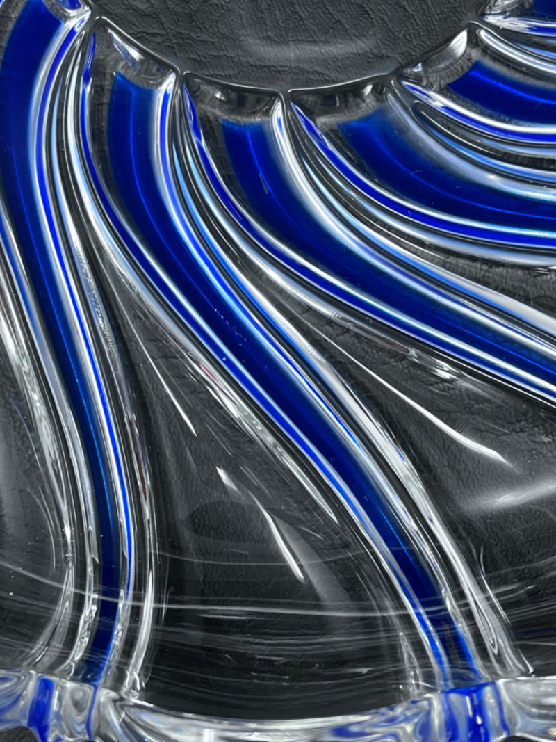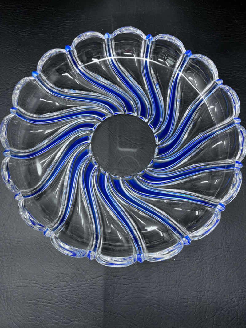 It features a distinctive clear glass design with cobalt blue swirls that radiate from the center to a scalloped edge.