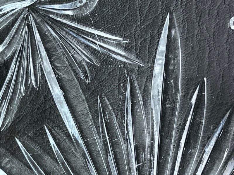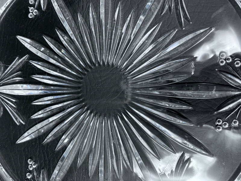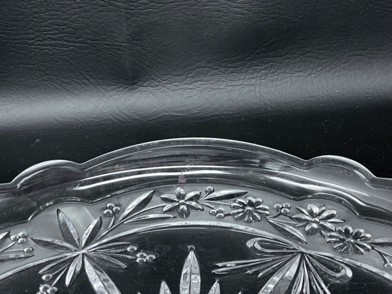 *Mikasa Crystal Peppermint Platter & Vintage Studio Nova Platter Features an intricate starburst center with a border design of flowers and ribbons, all within a scalloped edge. Some scratches in the glass. 14” across.