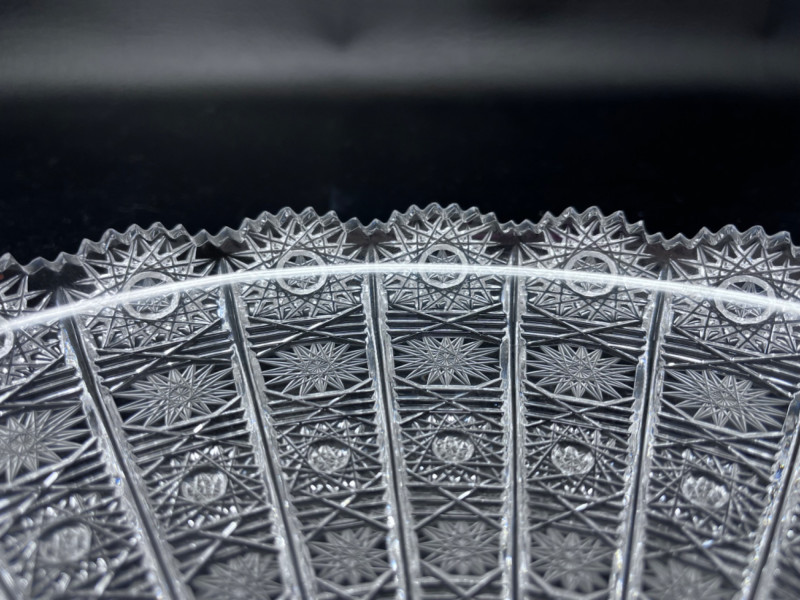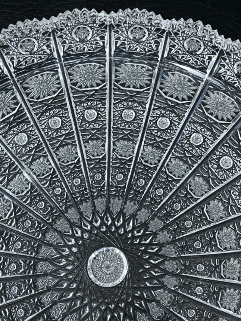 Features an intricate, brilliant cut glass design, sometimes referred to as "Queen Lace" pattern.