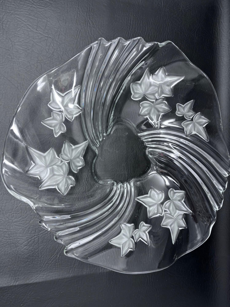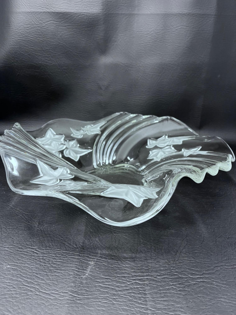 Crafted from clear pressed crystal glass with a freeform, ruffled rim and frosted ivy leaves in relief.