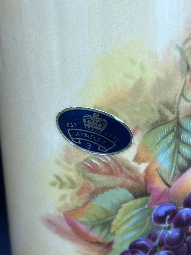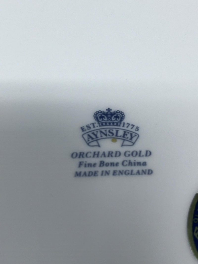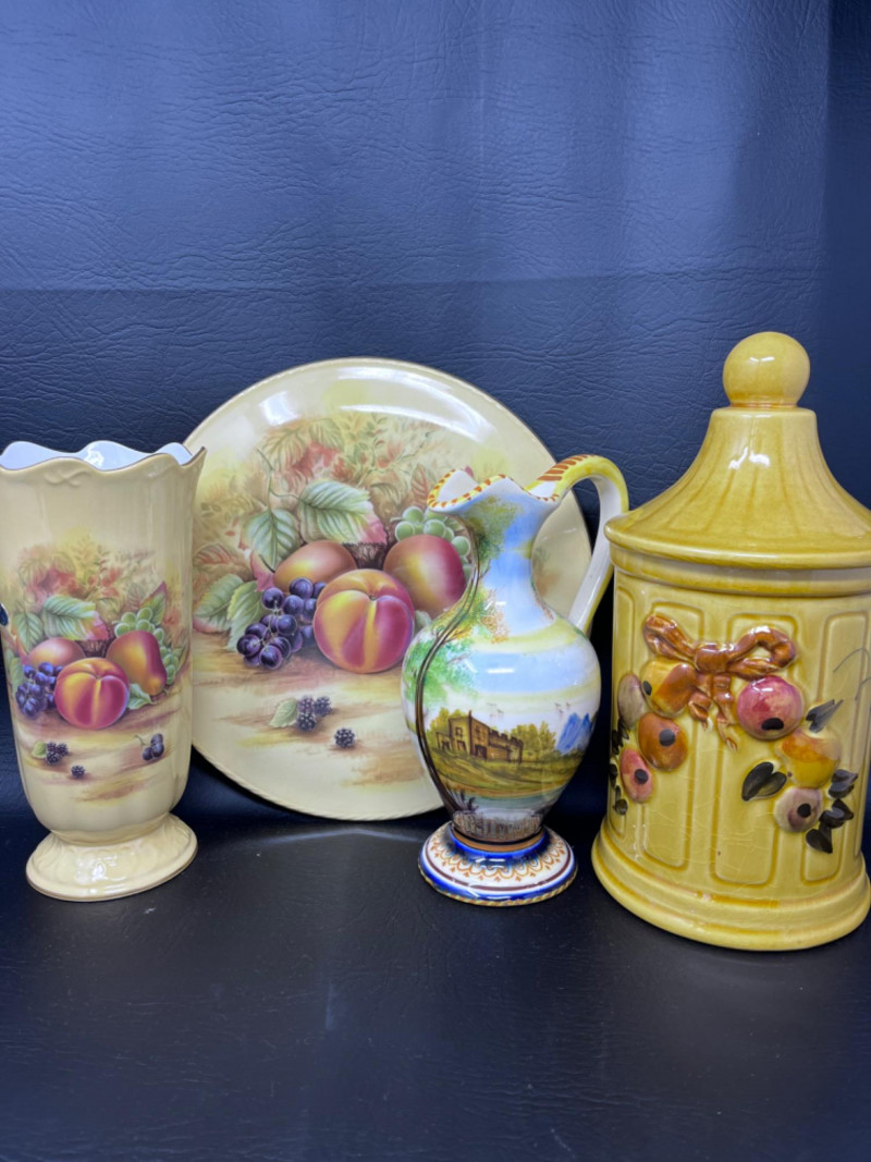 *Vintage Ceramics & Pottery 4.5”x8.5” Aynsley Orchard Gold pattern plate 10.5” Vintage hand-painted ceramic pitcher 5.5”x5”x8.5” Vintage ceramic cookie jar made by Los Angeles Potteries 6”x11”
