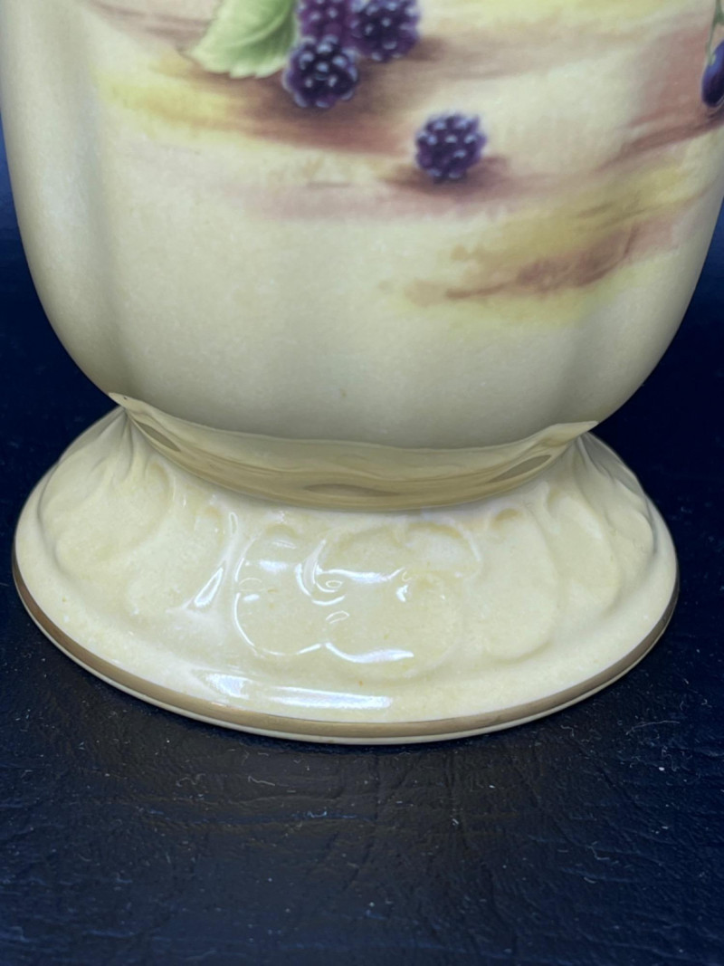 The vase features hand-painted depictions of ripe fruits such as peaches, grapes, and blackberries in rich, autumnal hues on a warm, yellow background, accented with extensive gold trim.
