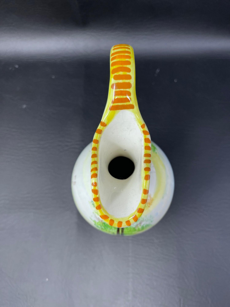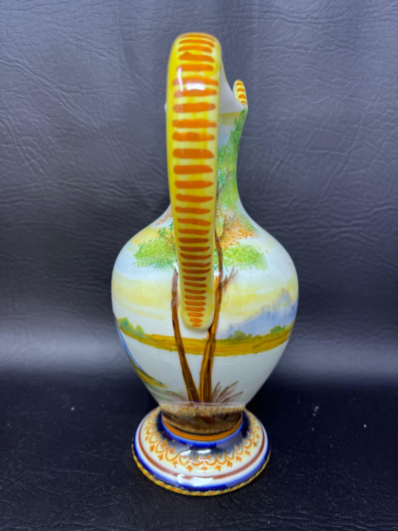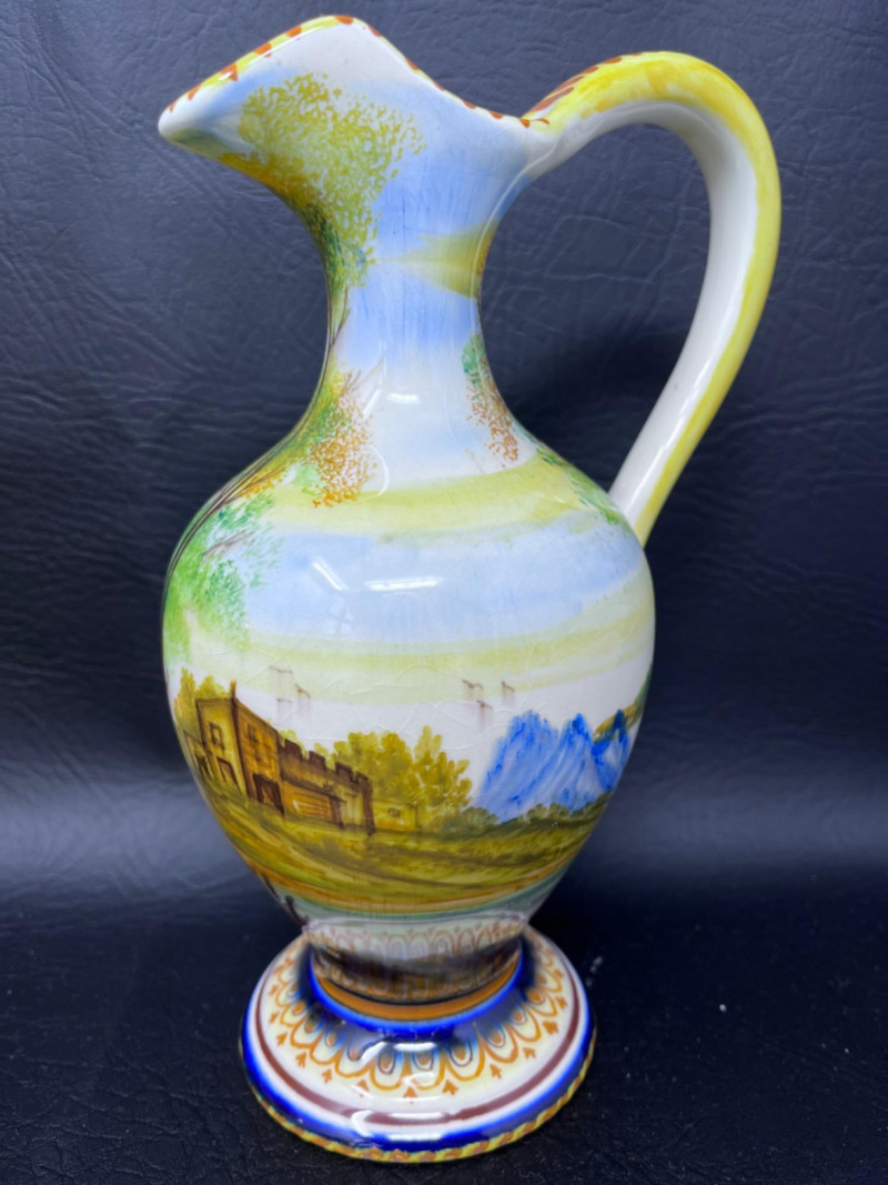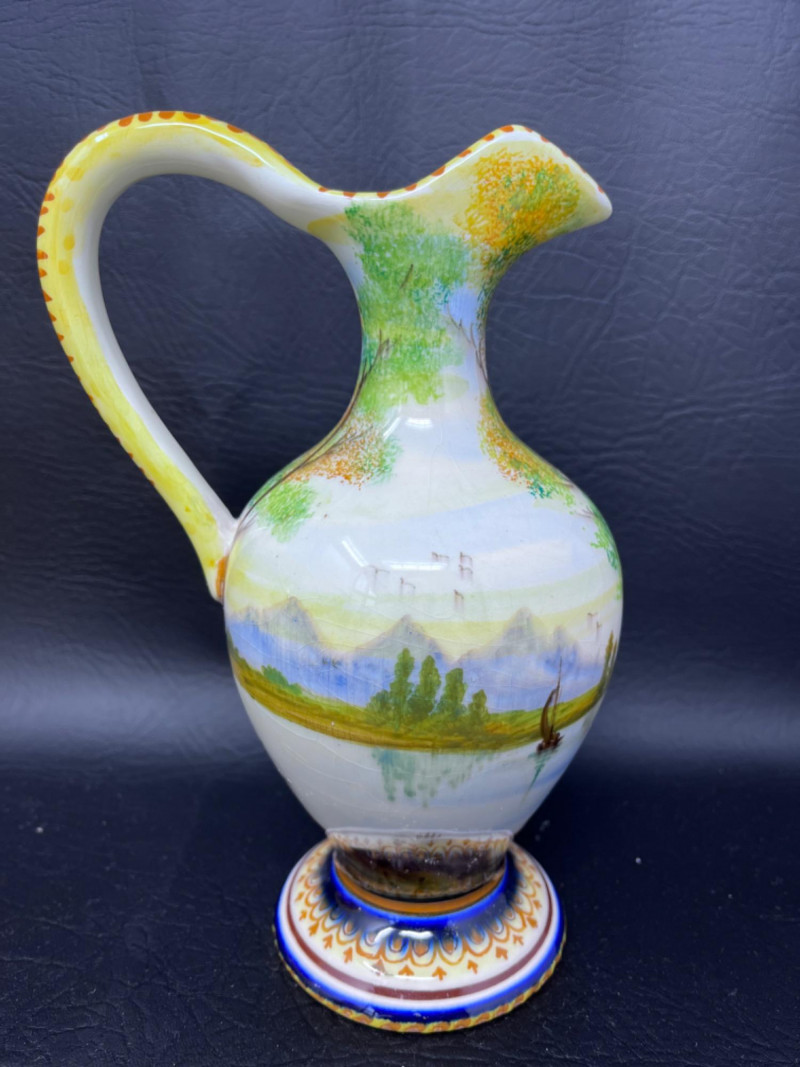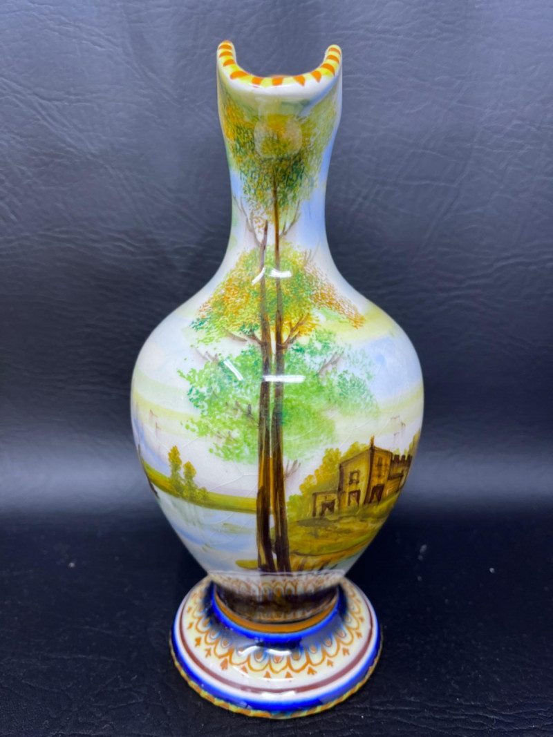 The decoration depicts a scenic landscape with a building, trees, and flying birds. The base has a distinct, multi-colored border pattern. This style often falls under the category of Italian folk art or majolica-style pottery