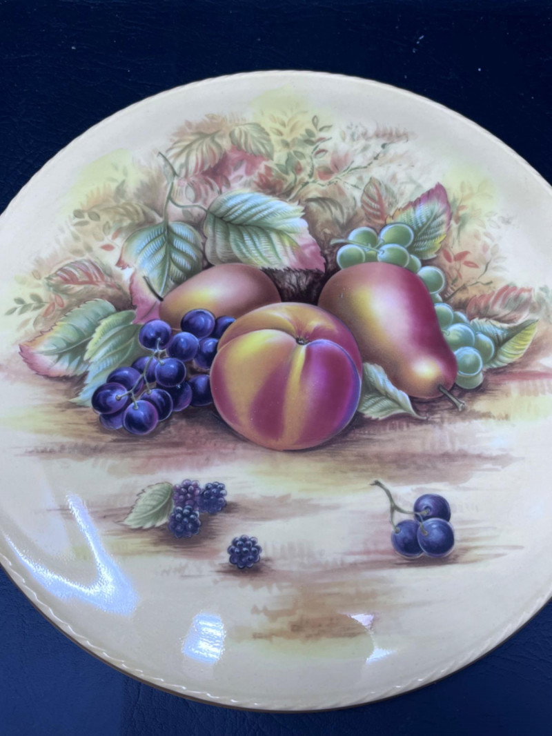 This vintage design, first introduced in the 1930s, features hand-painted embellishments of various fruits, including peaches, pears, and grapes, against a mottled yellow-gold background and encircled by a gold rim.