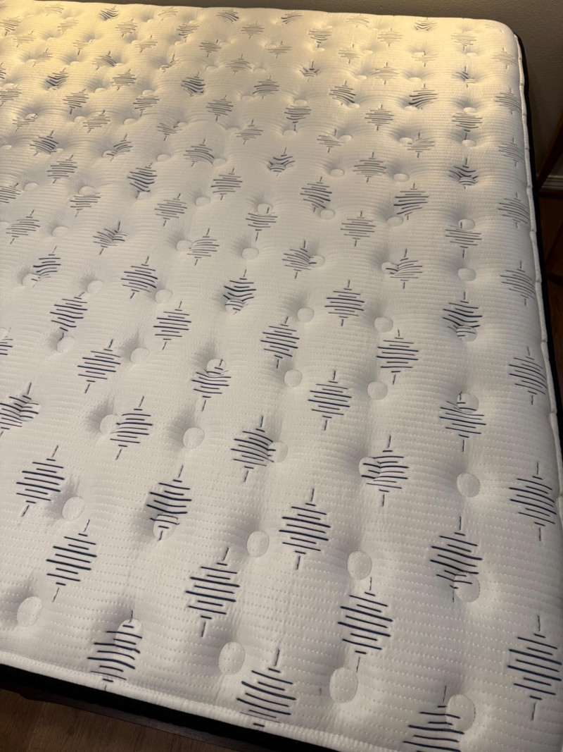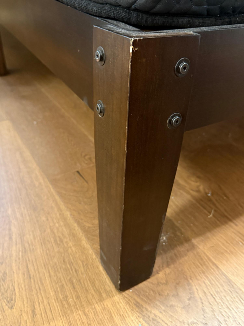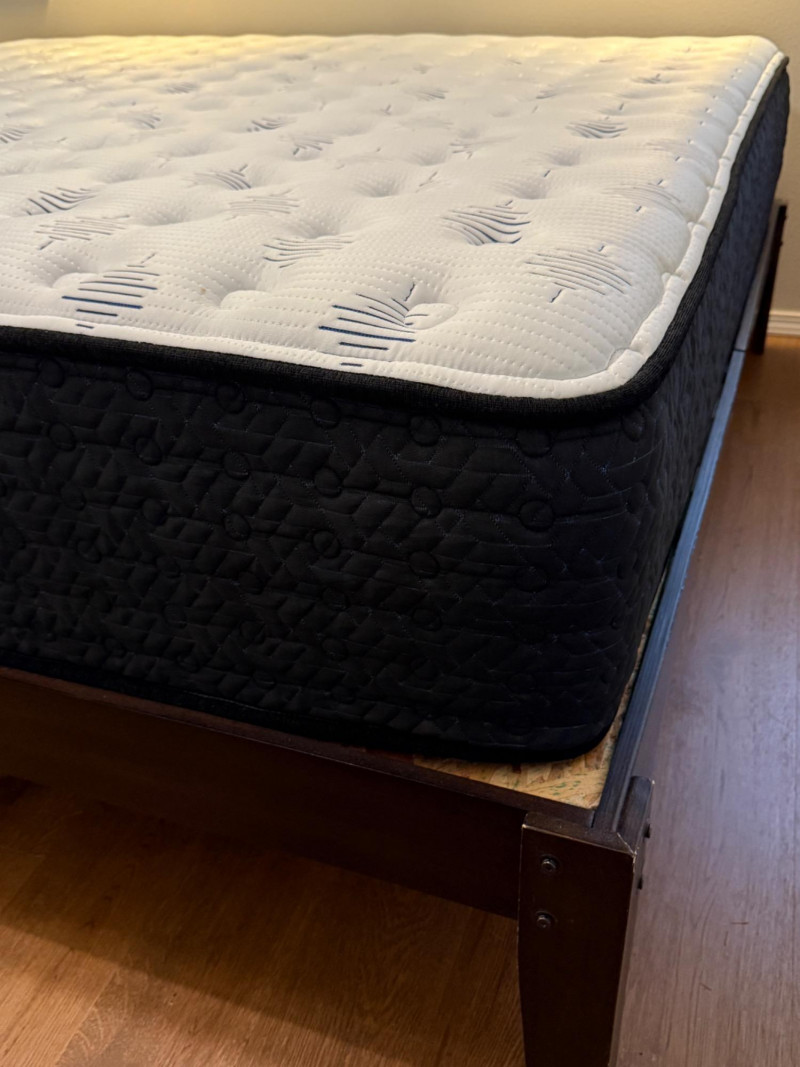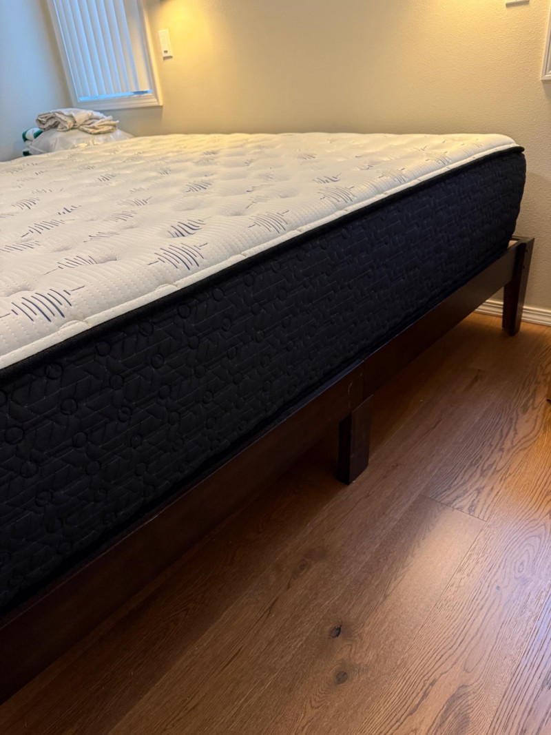 Like New Pillow-top Tufted King Mattress with Brown Wood and Plywood Platform Base. Together they are 28” tall. One leg has damage. Clean mattress with no damage noted.
