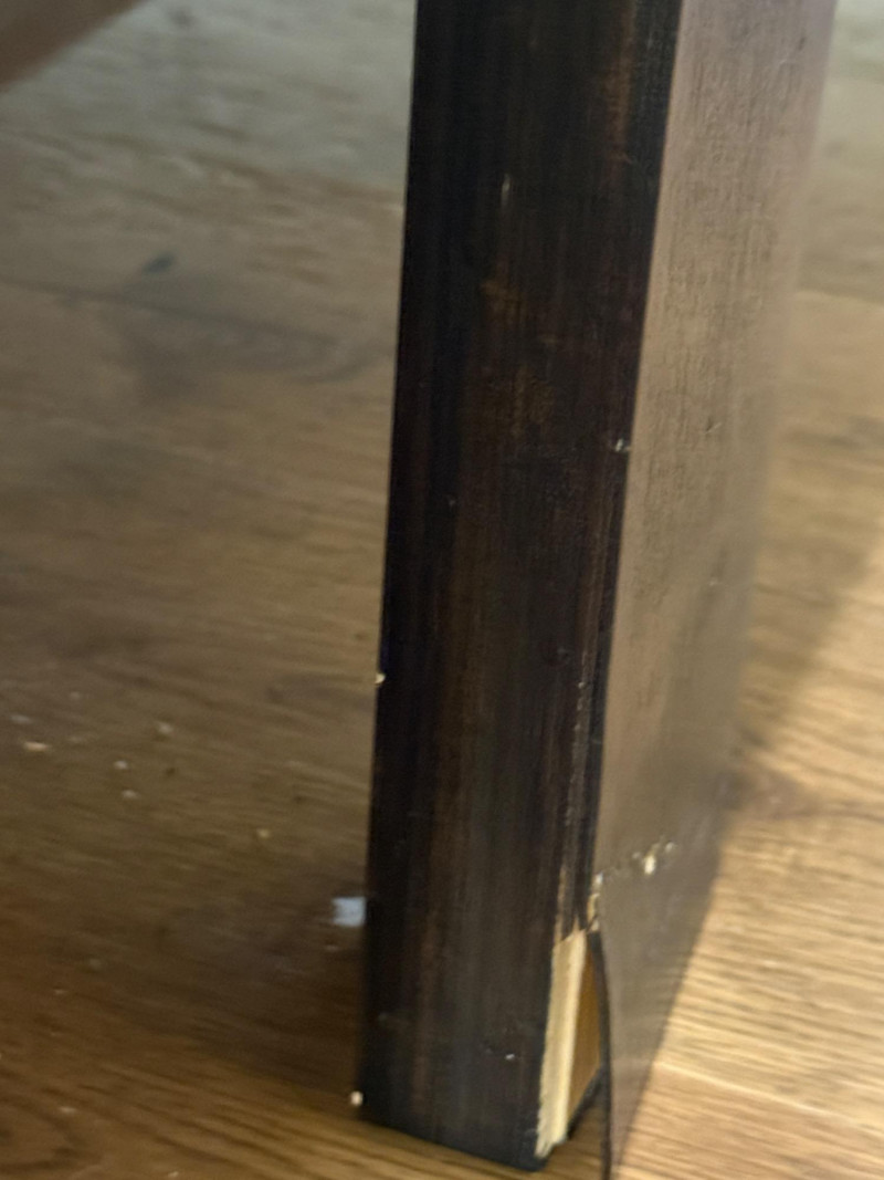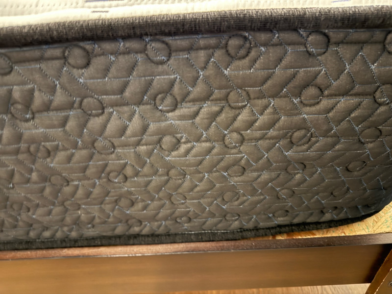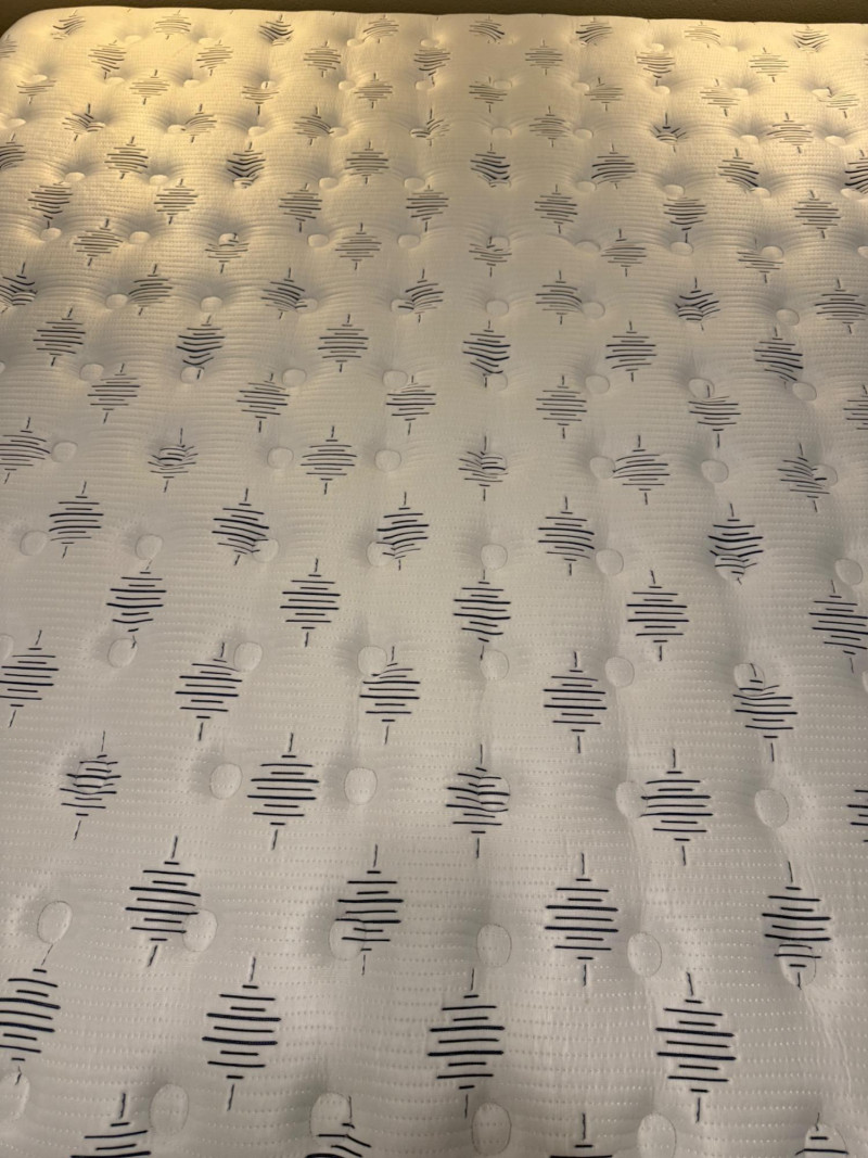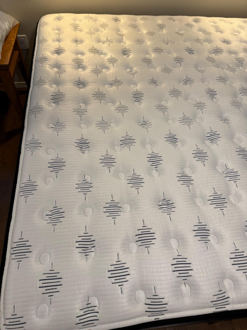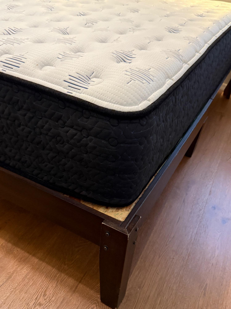 Like New Pillow-top Tufted King Mattress with Brown Wood and Plywood Platform Base. Together they are 28” tall. One leg has damage. Clean mattress with no damage noted.