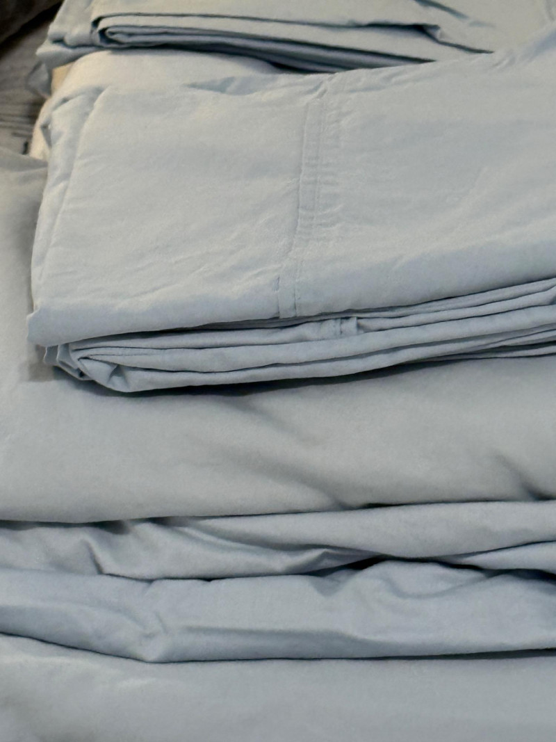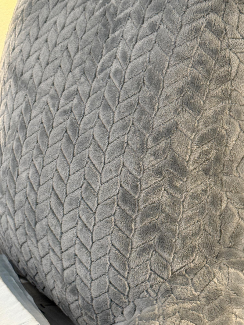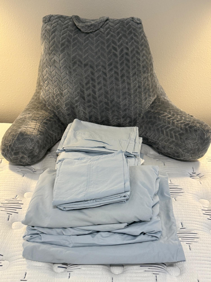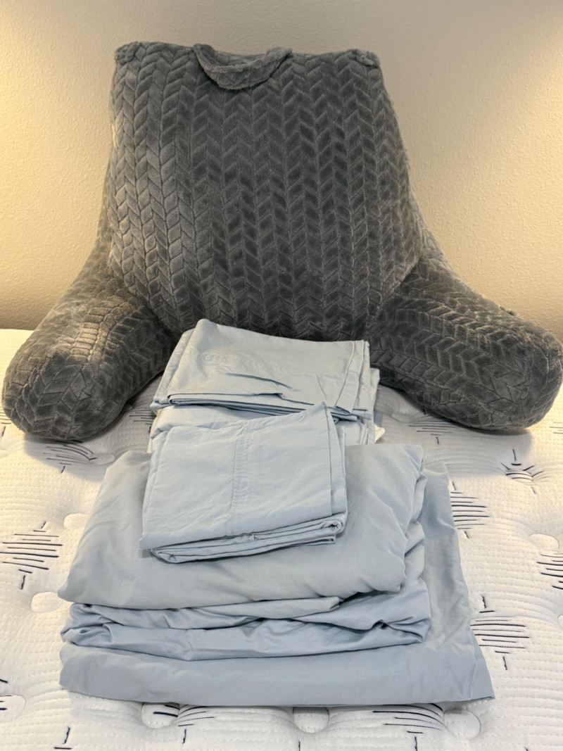 (2) Blue Queen Sheet Sets & Back SupportLight gray plush back support with chevron pattern. 2- Light blue sheet sets. Flat, fitted and 2 pillowcases.