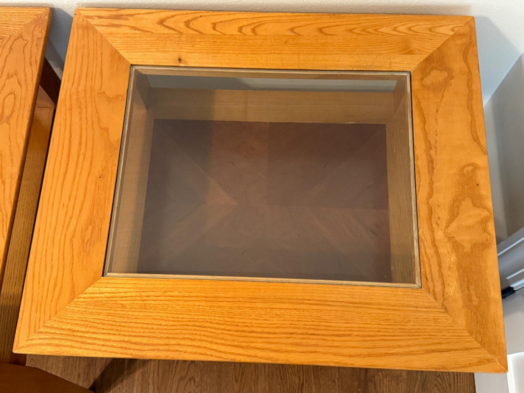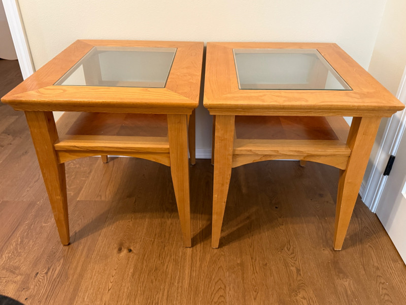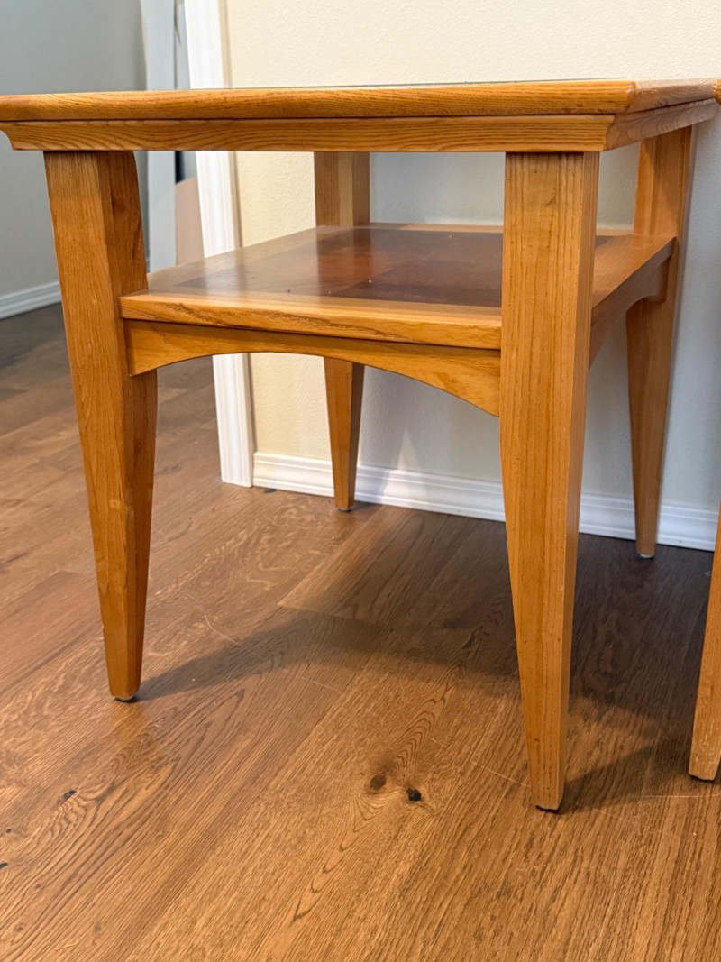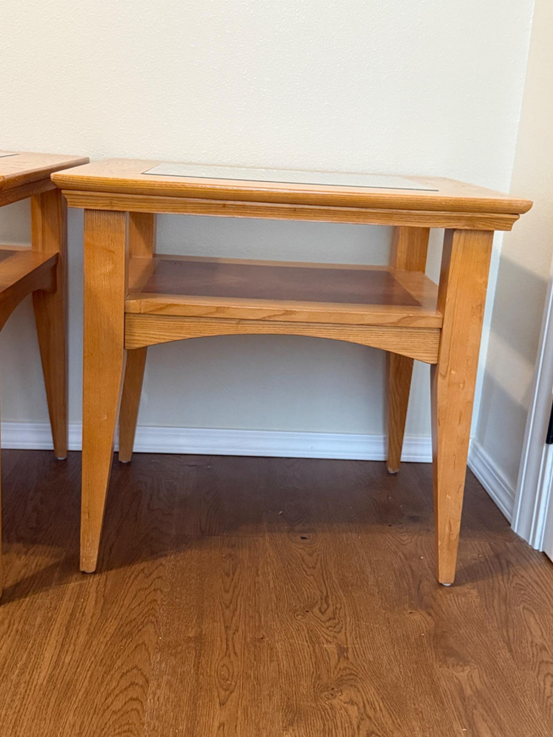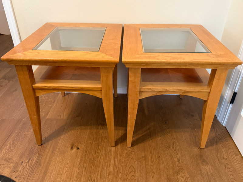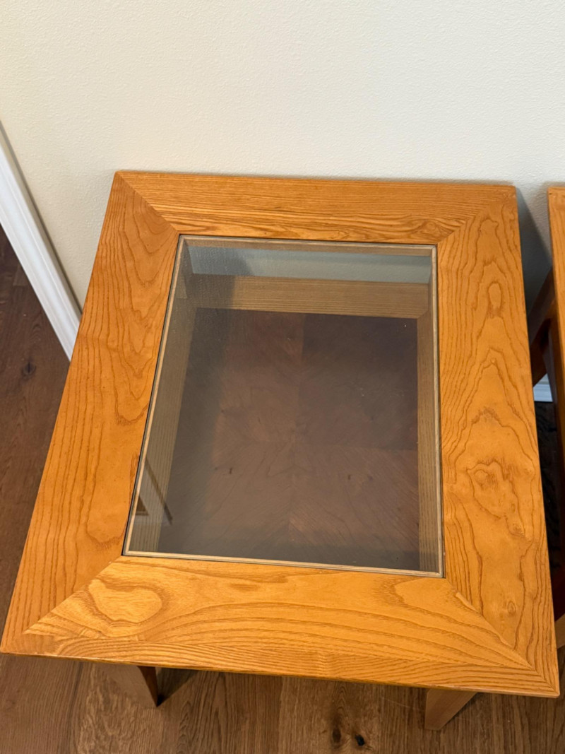 (2) Matching Glass Top Inlay Wood Light Oak Night Stand or Side Tables. Each measures 22”x26”x25.5” tall with 13.5”x17.5” glass insert over inlay wood shelf. One has 5-6 scratches to the top. See pics. Otherwise nice tables!